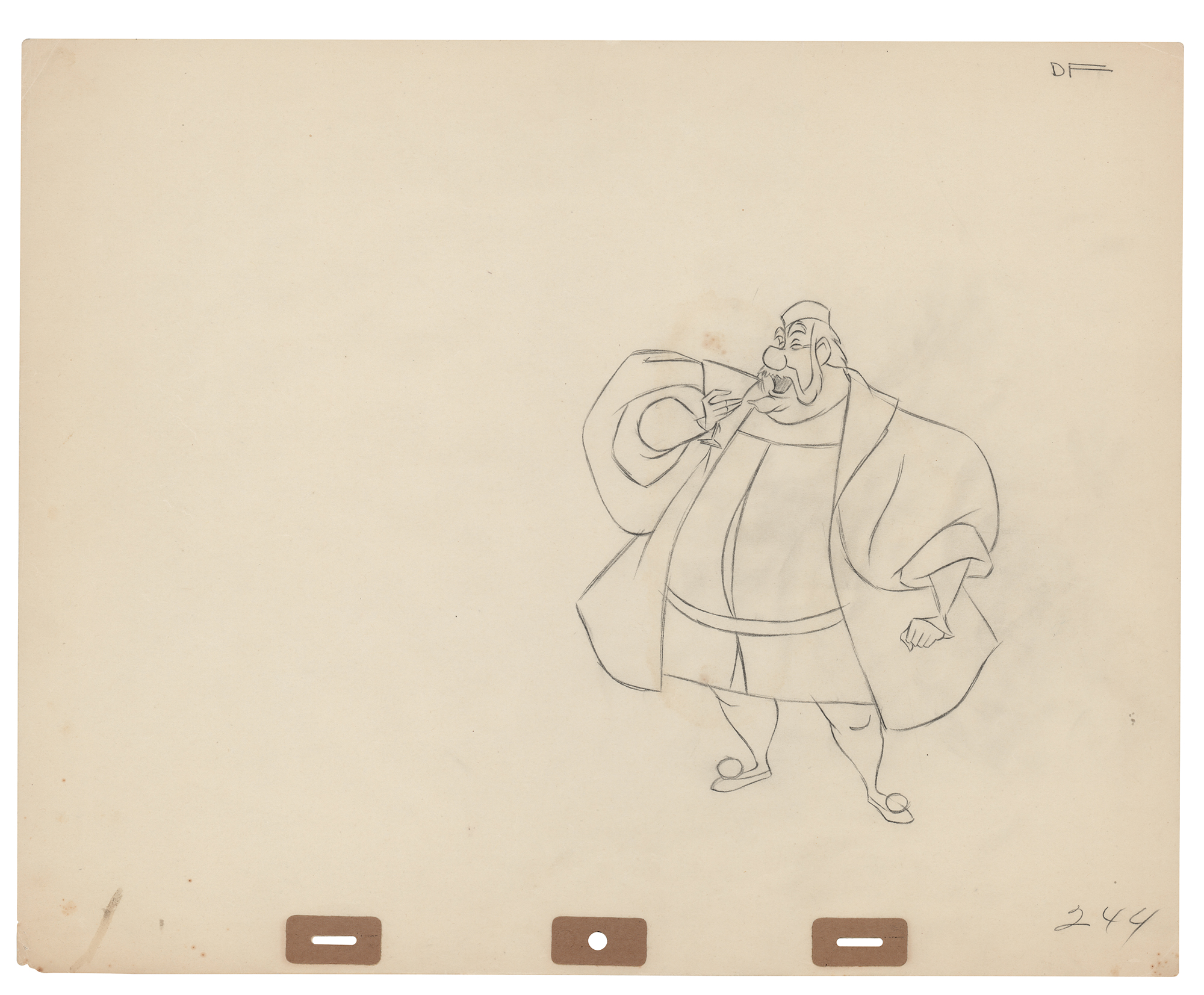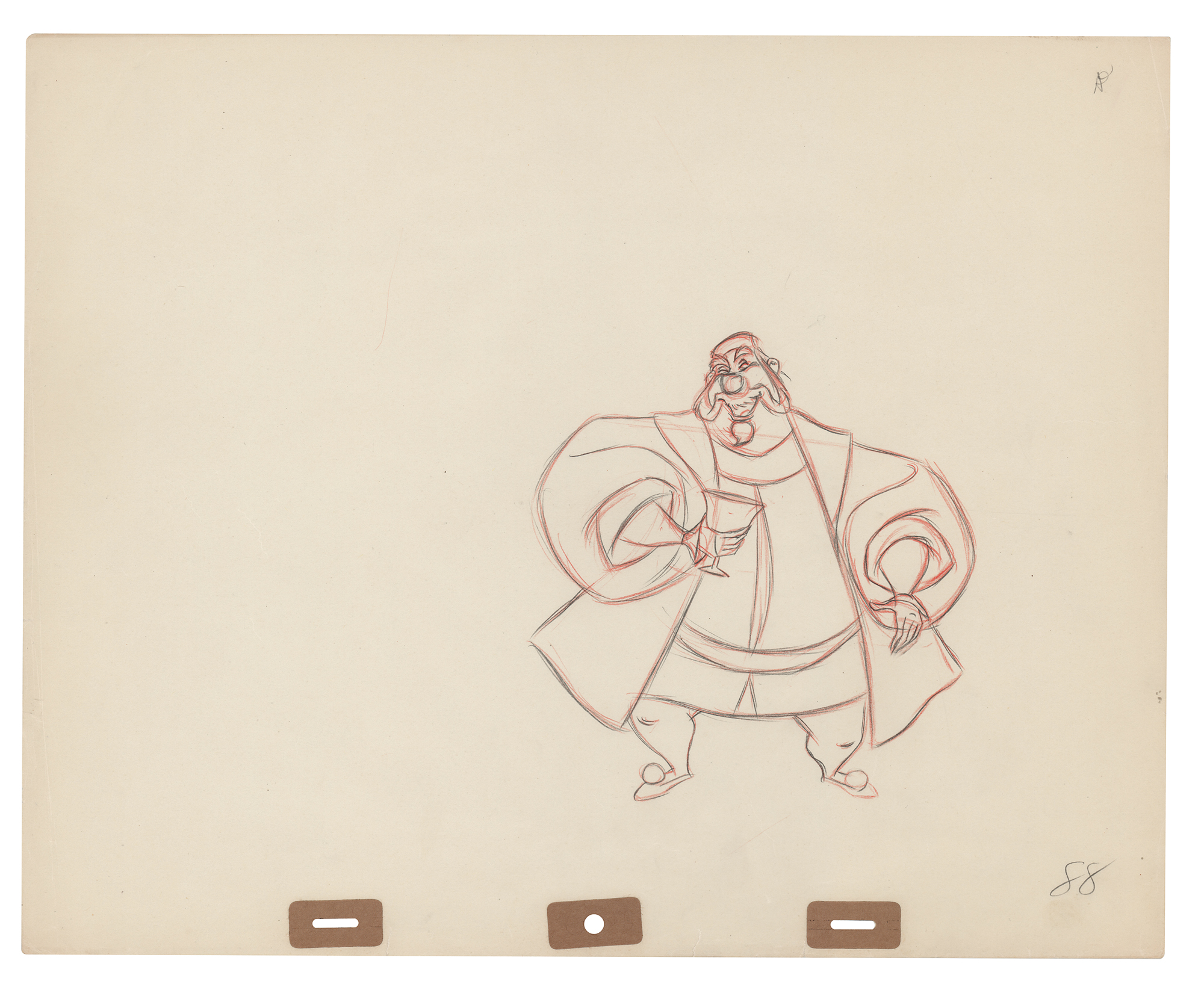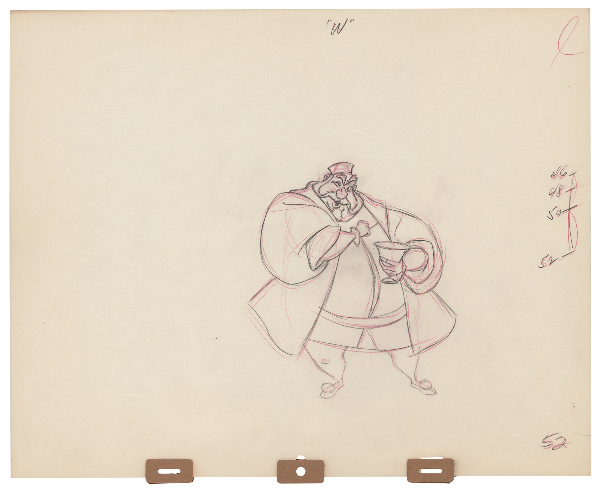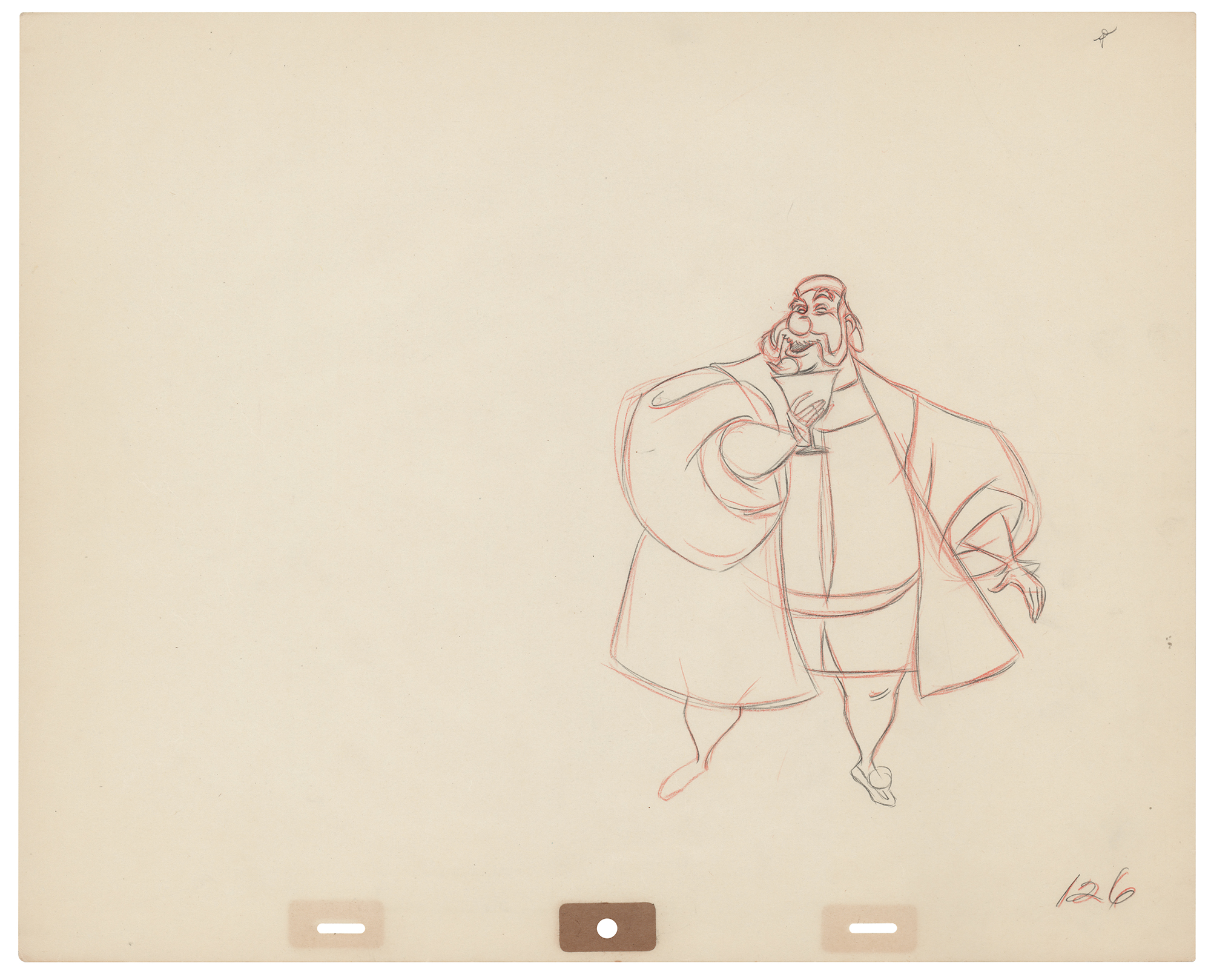 (Walt Disney Studios, 1959) Superb group of twelve original production drawings featuring King Hubert from Sleeping Beauty, showing the king raising his goblet while giving a wink; one drawing is annotated in the margin: "Eye in same attitude and exp. as #58." Accomplished in graphite and colored pencil on untrimmed 15.5 x 12.5 animation paper, marked in the lower corners with numbers ranging from "22" to "244," including number "58." Images measure from 5.5 x 6 to 6 x 9. In overall fine condition.