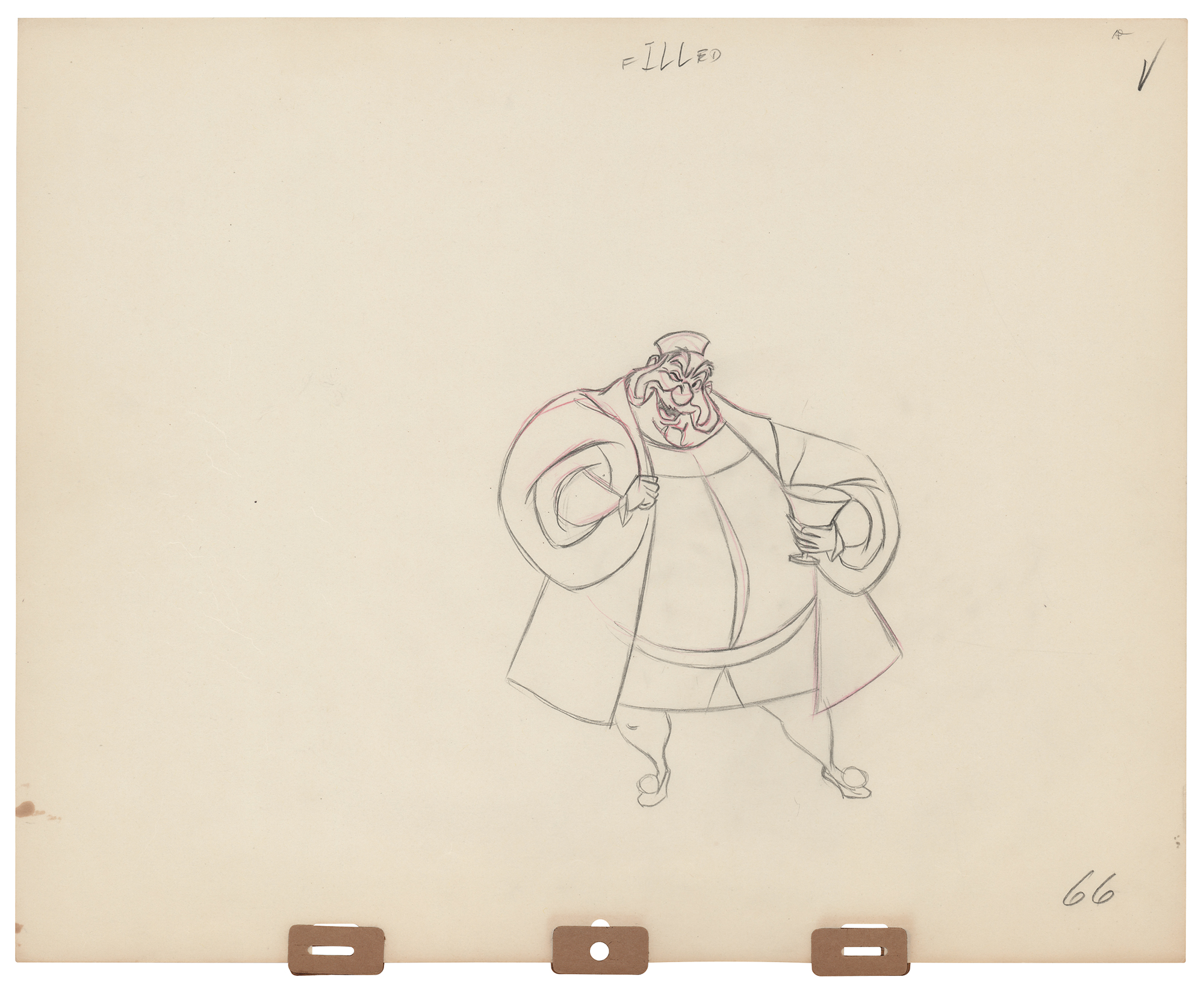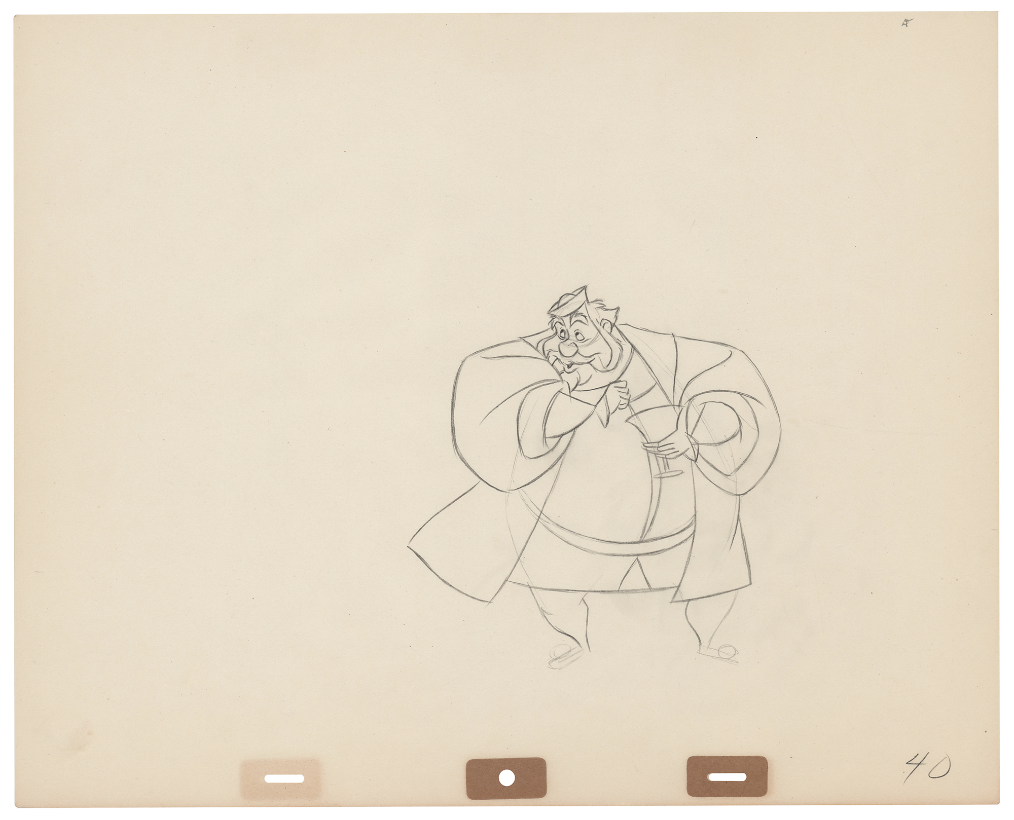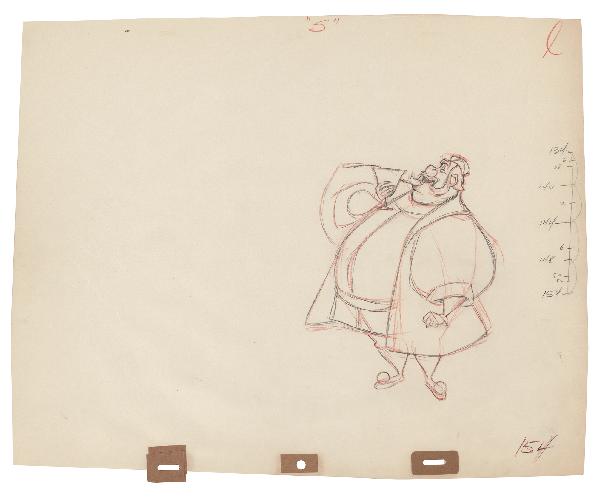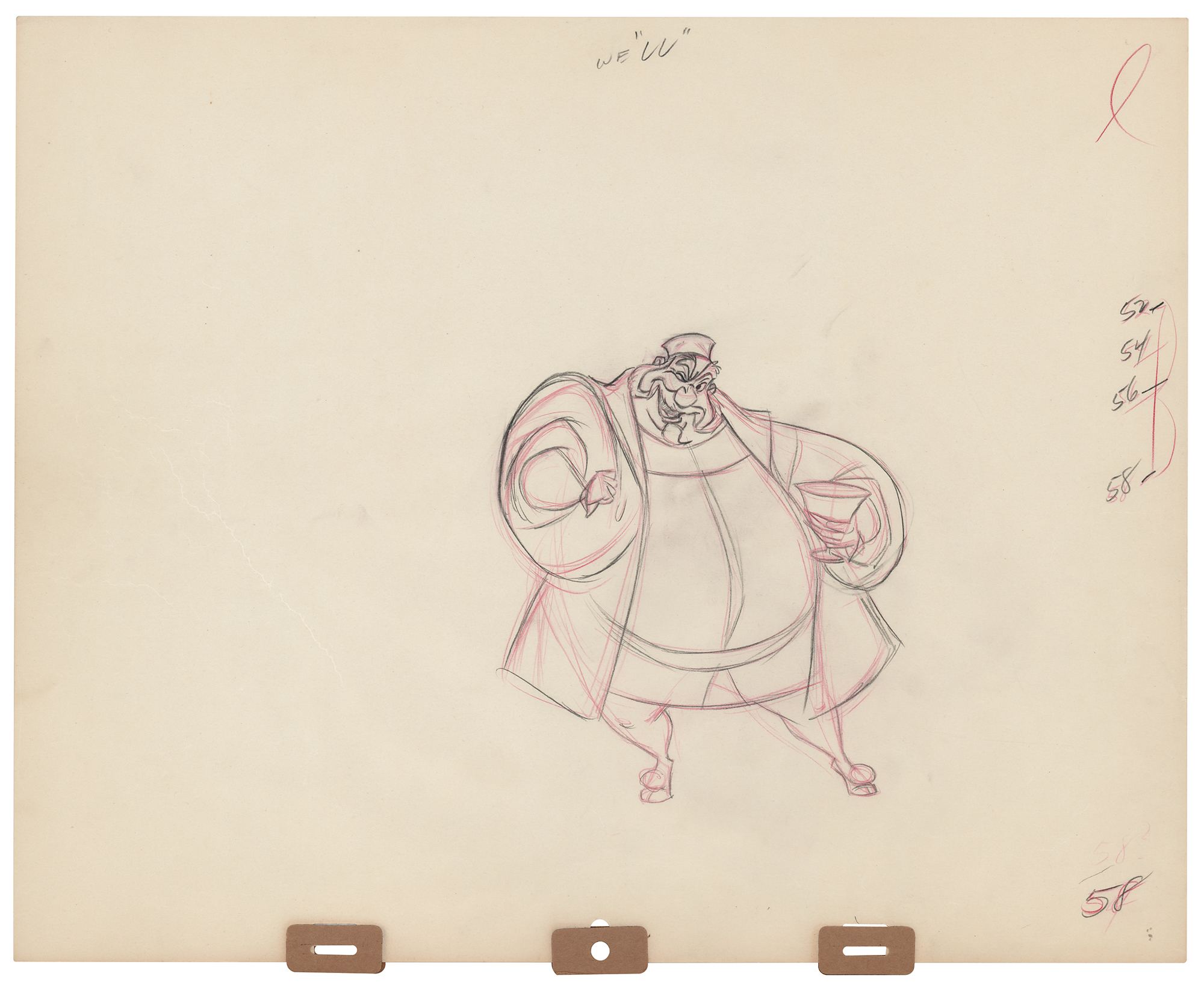 (Walt Disney Studios, 1959) Superb group of twelve original production drawings featuring King Hubert from Sleeping Beauty, showing the king raising his goblet while giving a wink; one drawing is annotated in the margin: "Eye in same attitude and exp. as #58." Accomplished in graphite and colored pencil on untrimmed 15.5 x 12.5 animation paper, marked in the lower corners with numbers ranging from "22" to "244," including number "58." Images measure from 5.5 x 6 to 6 x 9. In overall fine condition.