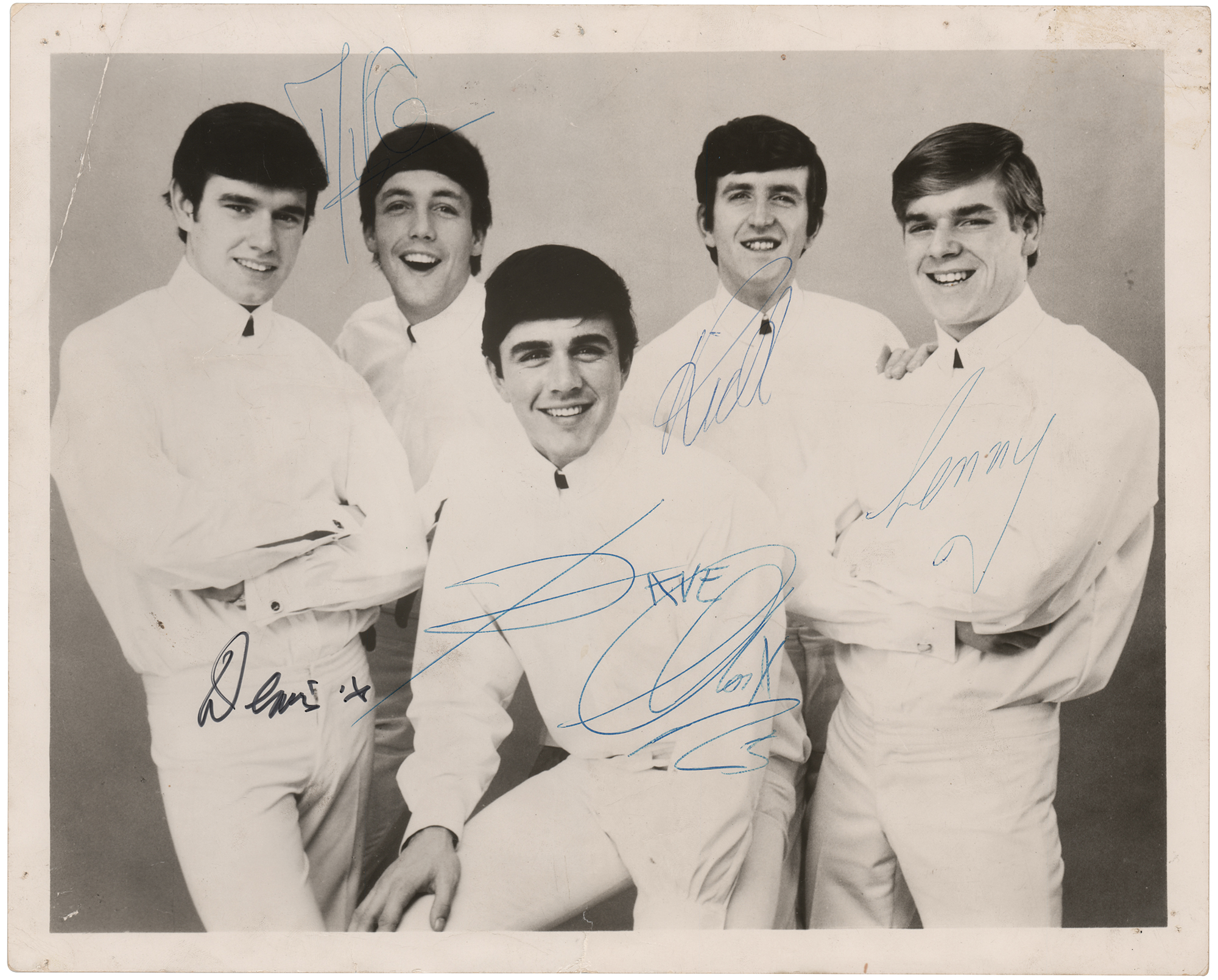Glossy 10 x 8 photo of band members of The Dave Clark Five, signed in various inks by Dave Clark, Mike Smith, Lenny Davidson, Rick Huxley, and Denis Payton; all but Clark sign with their first names only. In very good condition, with overall creasing, and tack holes to the borders.