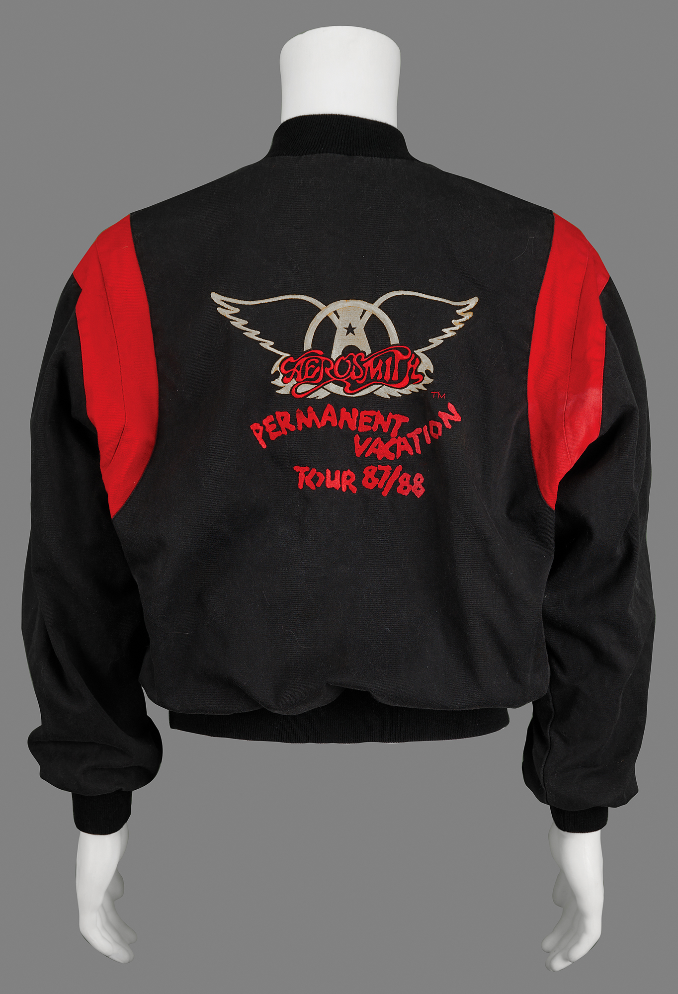Vintage varsity-style button-up black-and-red crew jacket for Aerosmith’s 1987-1988 Permanent Vacation Tour, size medium, with red buttons, black knit cuffs, collar, and waistband, and the back area is embroidered with the Aerosmith logo above stylized text: “Permanent Vacation Tour 87/88.” In fine condition, with some light stains to the inner lining.