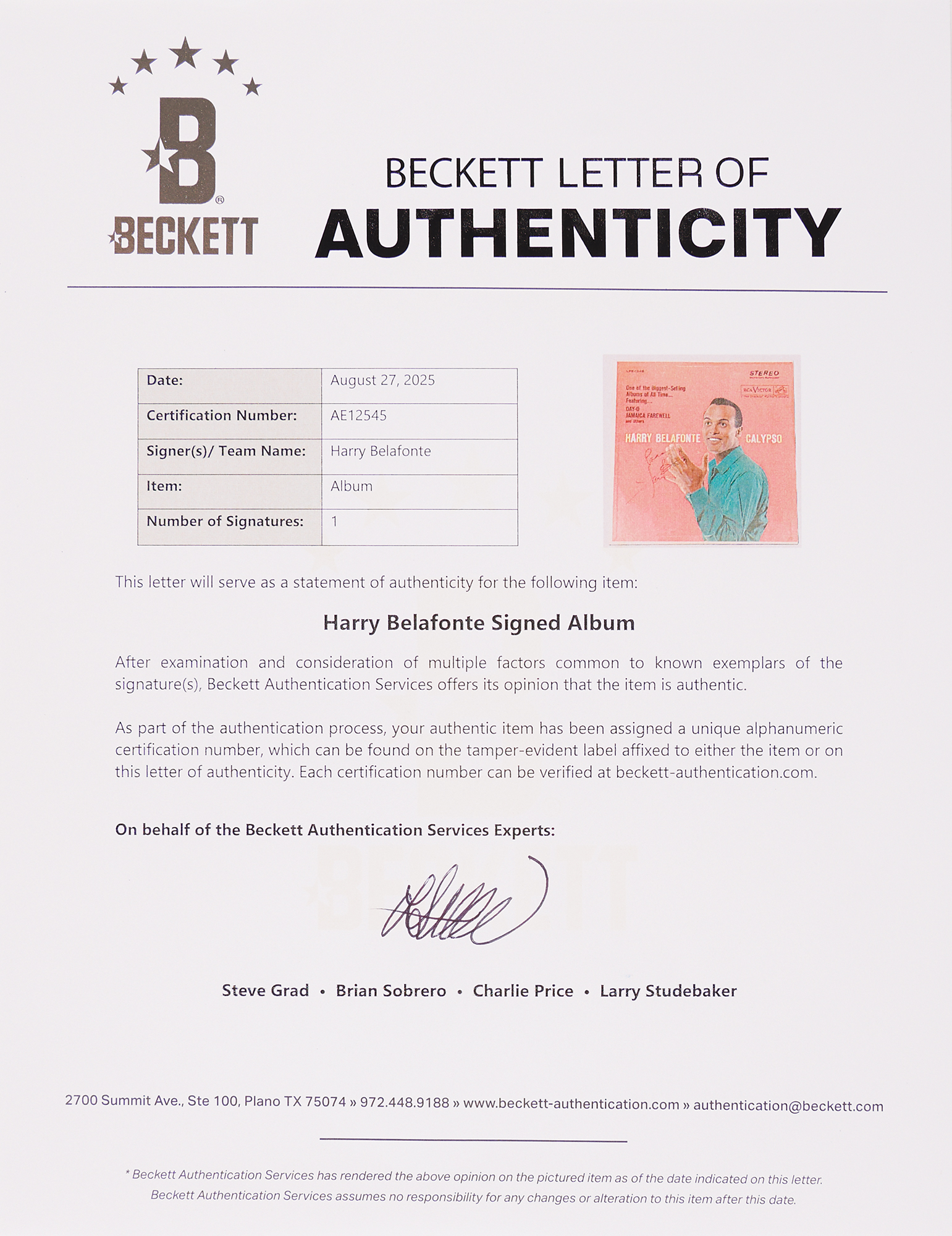 Calypso album signed on the front cover in black felt tip by Harry Belafonte. In fine condition. The record is included. Accompanied by a full letter of authenticity from Beckett Authentication Services.