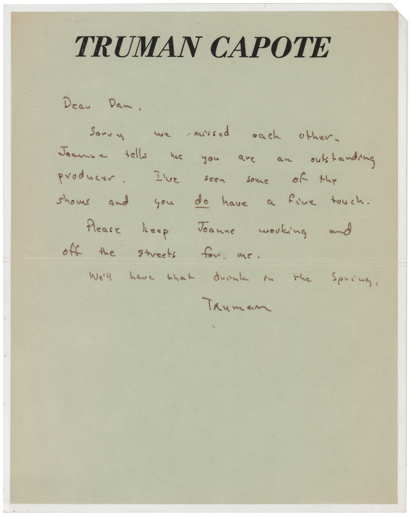 ALS signed “Truman,” one page, 6.5 x 8, personal letterhead, no date. Handwritten letter to Dan, in full: "Sorry we missed each other—Joanne tells me you are an outstanding producer. I've seen some of the shows and you do have a fine touch. Please keep Joanne working and off the streets for me. We'll have that drink in the spring." In fine condition, with light handling wear, and trivial loss to the upper right corner tip.