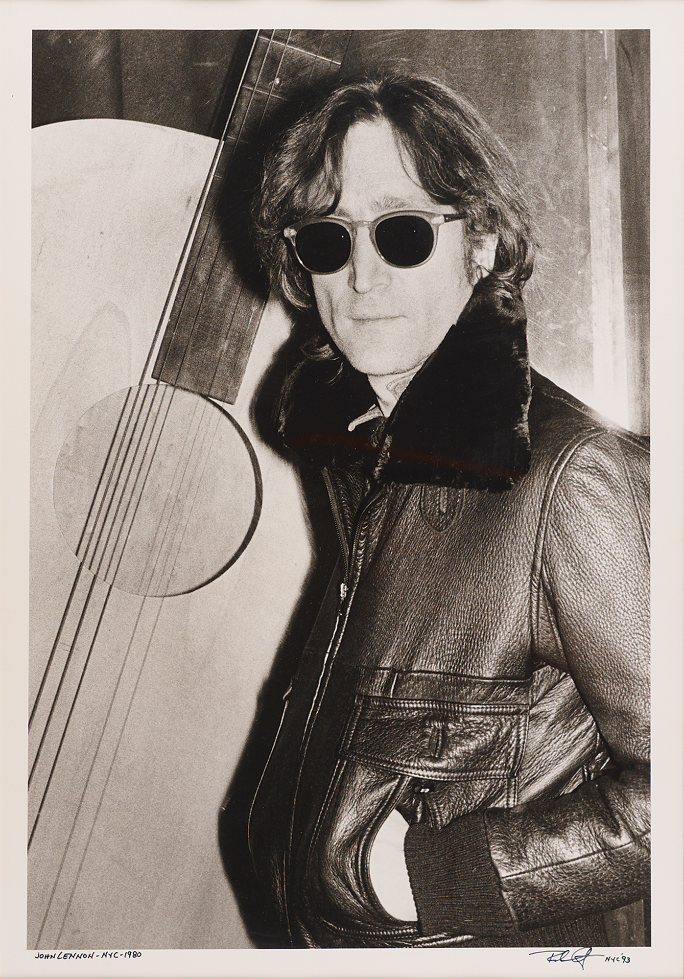Semi-glossy 12 x 17.5 photographic print of John Lennon looking cool in sunglasses and a leather jacket at The Record Plant, titled, signed, and dated in the lower border in black felt tip by the photographer, "John Lennon - NYC - 1980, Robert Gruen, NYC '93." Double-matted and framed to an overall size of 18 x 23.5. In fine condition.