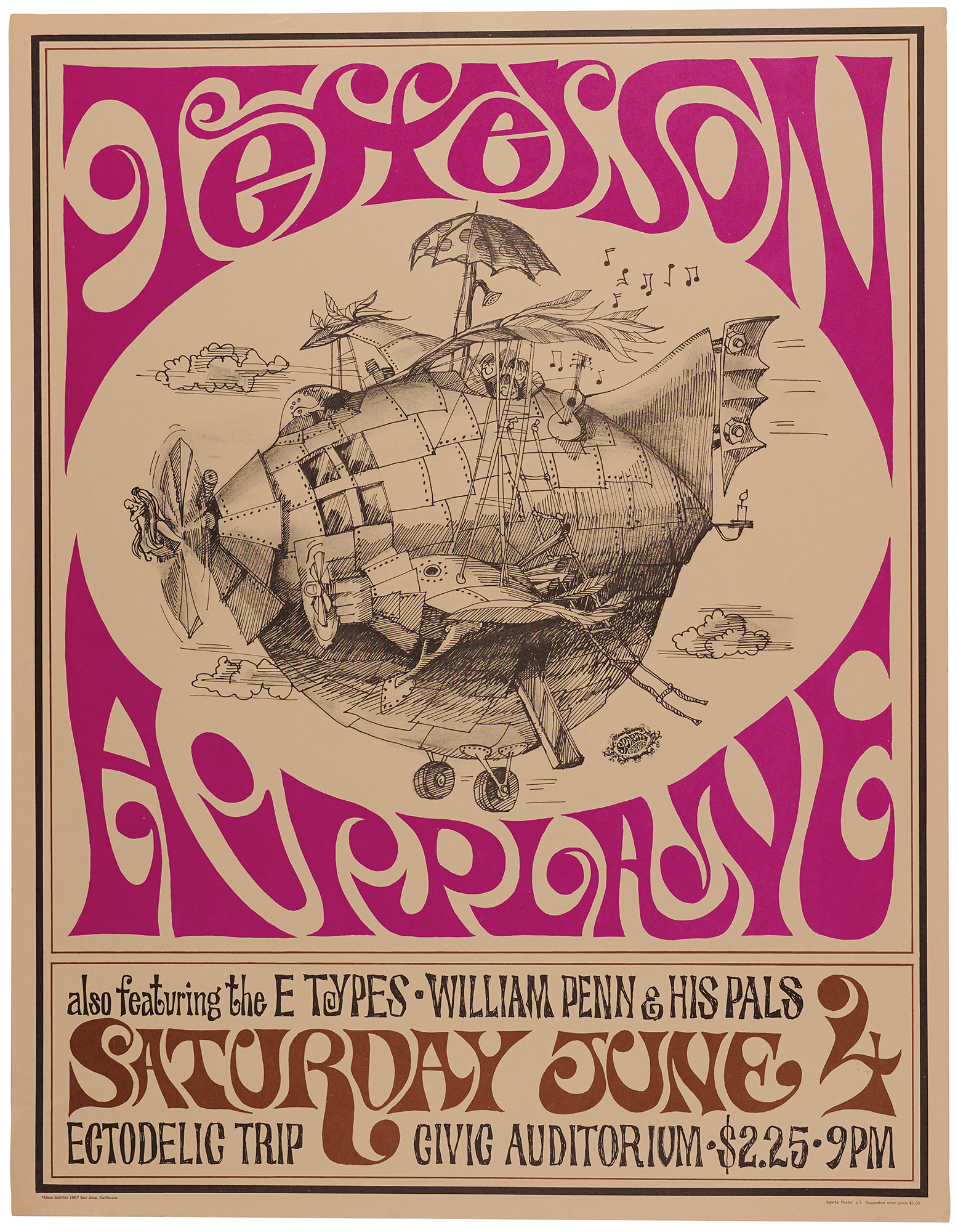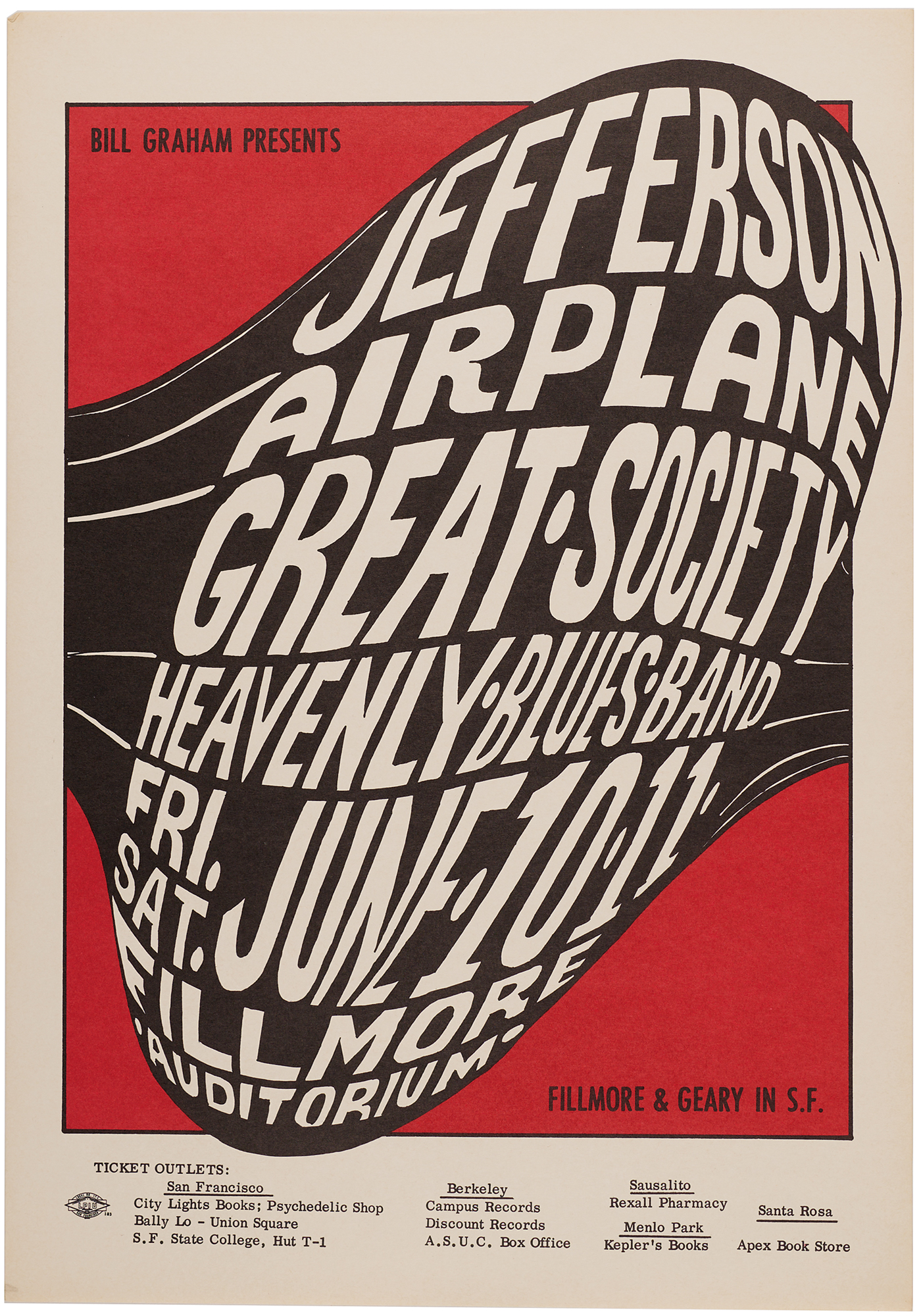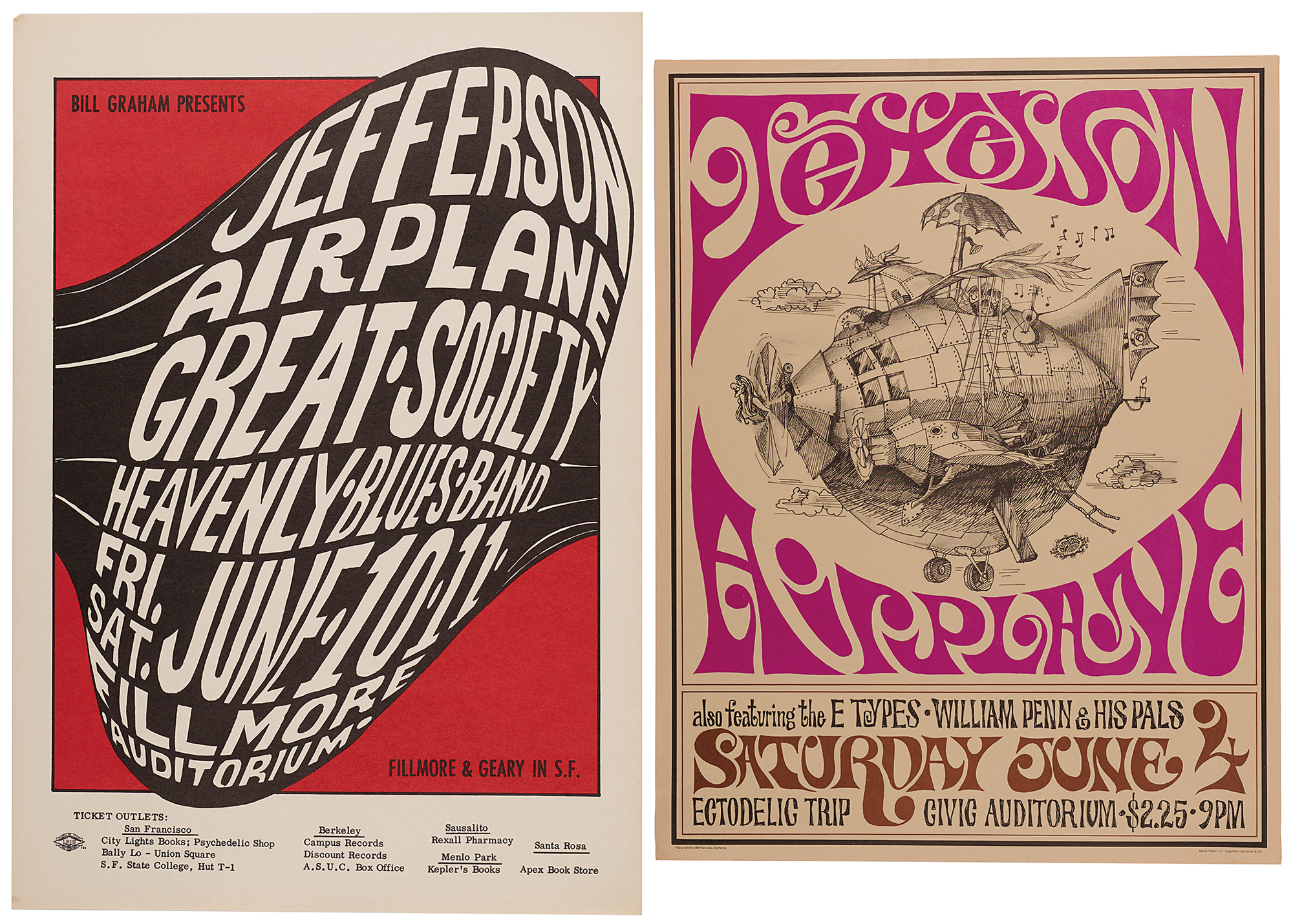 Two color posters for Jefferson Airplane concerts: a second printing 14 x 20 poster for Jefferson Airplane, Great Society, and the Heavenly Blues Band at the Fillmore Auditorium on June 10-11, 1966, presented by Bill Graham (BG-10); and a first printing 17 x 22 poster for Jefferson Airplane at the Civic Auditorium, San Jose, on June 4, 1967 (Sparta Poster #1). In overall fine condition.