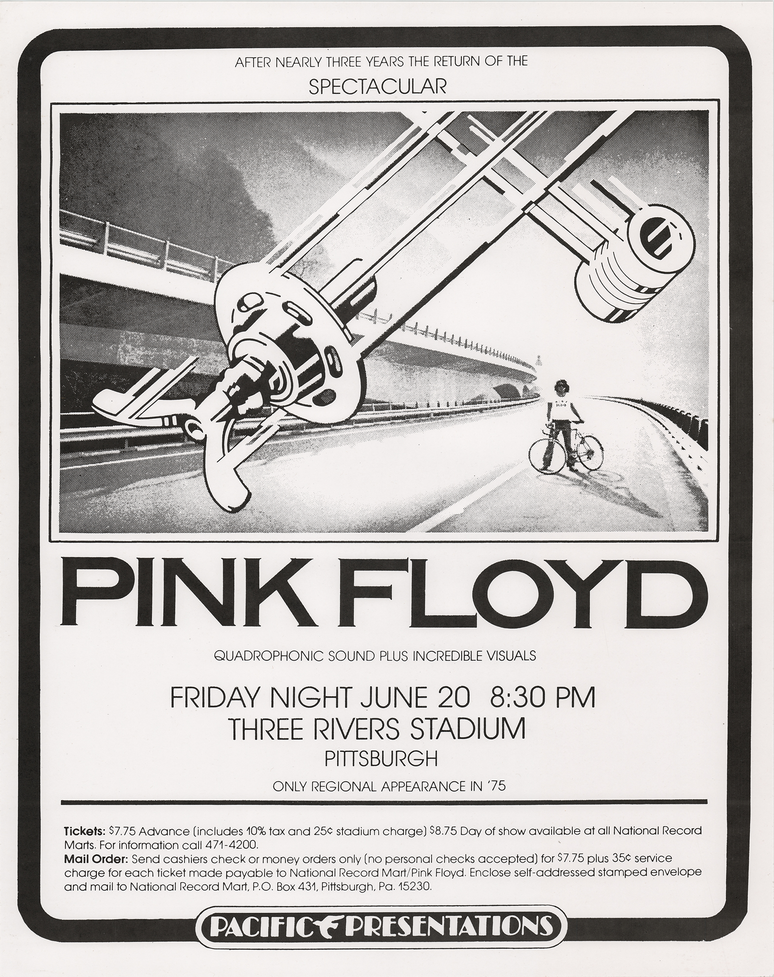 Original first printing 17.25 x 22 concert poster for Pink Floyd at Three Rivers Stadium in Pittsburgh, Pennsylvania, on June 20, 1975, billing it as their "spectacular" return after a three-year hiatus. The band played most of 'Wish You Were Here' before dark and the entirety of their iconic 'Dark Side Of The Moon' album after sundown, followed by a 23-minute encore of 'Echoes.' In near mint condition.