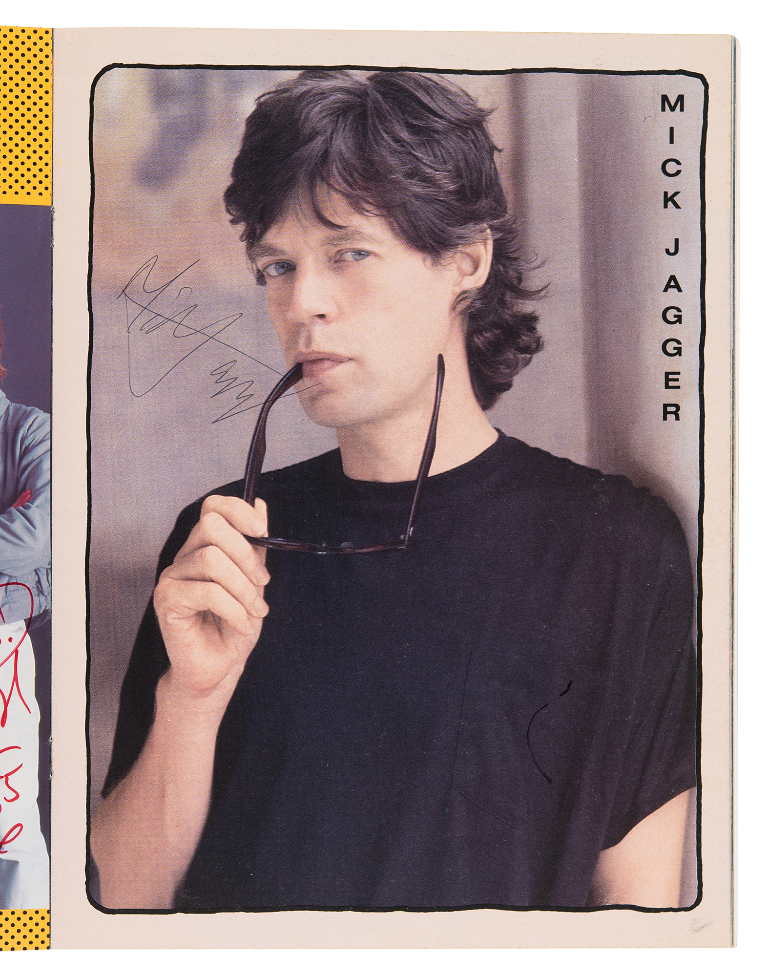 Incredible multi-signed official program for the Live Aid USA benefit concert, which was held at John F. Kennedy Stadium in Philadelphia, Pennsylvania, on July 13, 1985. The program, 9 x 12, is signed in ink and felt tip by nearly every musical artist on the bill, in addition to a host of other stars and people involved with the concert. Signers include: Bob Dylan, Eric Clapton, Led Zeppelin (Jimmy Page, Robert Plant, John Paul Jones), the Rolling Stones (Mick Jagger, Keith Richards, Ronnie Wood), Black Sabbath (Ozzy Osbourne, Tony Iommi, Geezer Butler, Bill Ward), Madonna, Phil Collins, Neil Young, Carlos Santana, Crosby Stills & Nash (David Crosby, Stephen Stills, Graham Nash), Tom Petty & the Heartbreakers (Tom Petty, Mike Campbell, Stan Lynch, Howie Epstein, Benmont Tench), the Beach Boys (Brian Wilson, Bruce Johnston, Al Jardine, Mike Love, Carl Wilson), The Cars (David Robinson, Greg Hawkes, Elliot Easton, Ric Ocasek, Benjamin Orr), The Pretenders, Duran Duran (Simon Le Bon, Nick Rhodes, Roger Taylor, John Taylor, Andy Taylor), The Four Tops (Lawrence Payton Jnr, Renaldo ‘Obie’ Benson, Abdul ‘Duke’ Fakir, Levi Stubbs), Judas Priest, Paul Stanley of KISS, Bryan Adams, Joan Baez, Daryl Hall and John Oates, Ashford & Simpson (Nickolas Ashford, Valerie Simpson), The Temptations (Eddie Kendrick and David Ruffin), The Hooters, Patti LaBelle, Kenny Loggins, Pat Metheny, Billy Ocean, Power Station, REO Speedwagon, Run DMC, Simple Minds, Rick Springfield, The Thompson Twins, Tina Turner, Lionel Richie, Eddie Martin, Bo Diddley, George Thorogood, Albert Collins, and Grace Slick.