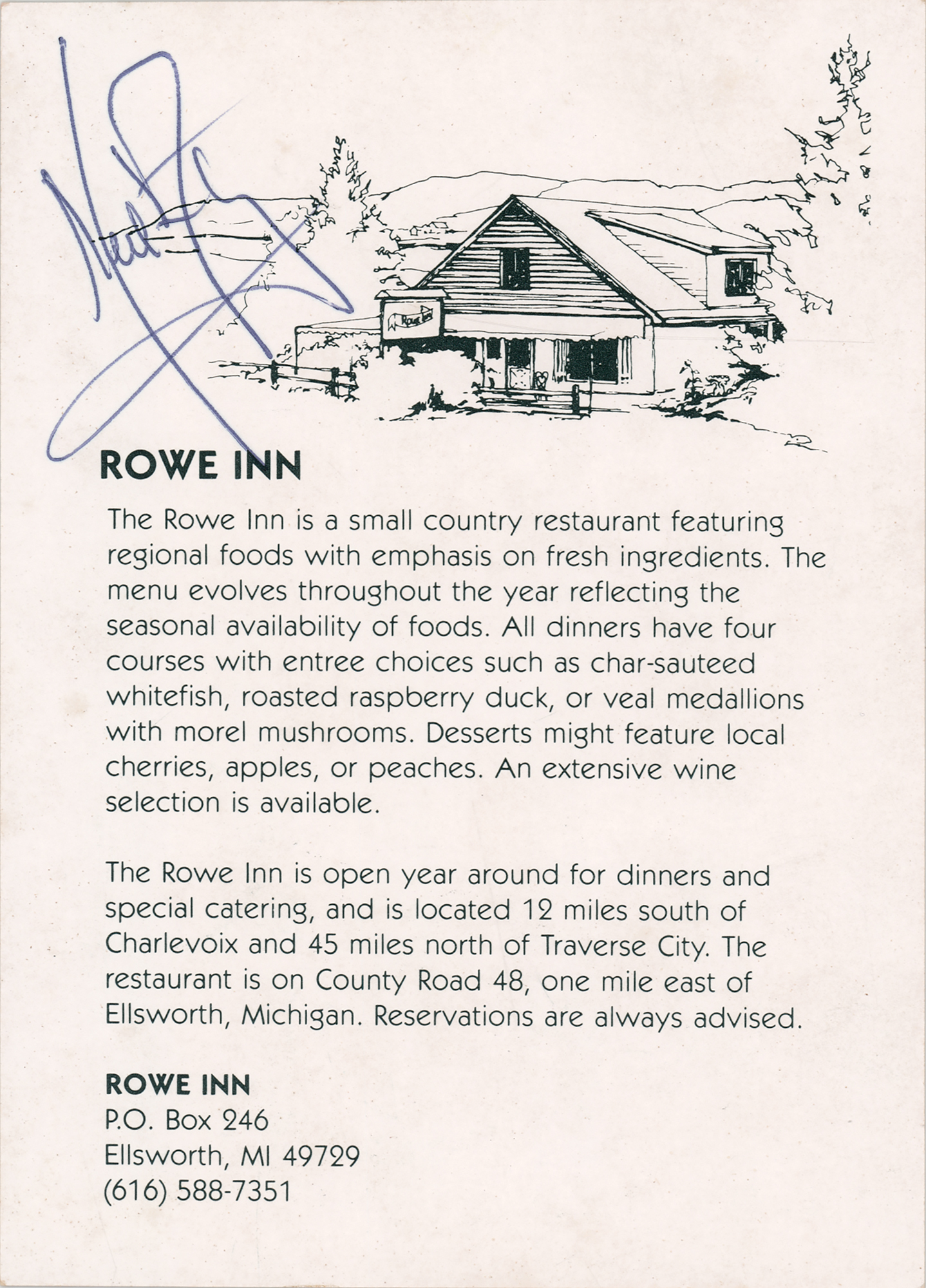 Ballpoint signature, "Neil Armstrong,” on an off-white 4.25 x 6 card from the Rowe Inn, a small country restaurant in Ellsworth, Michigan. In very fine condition.
