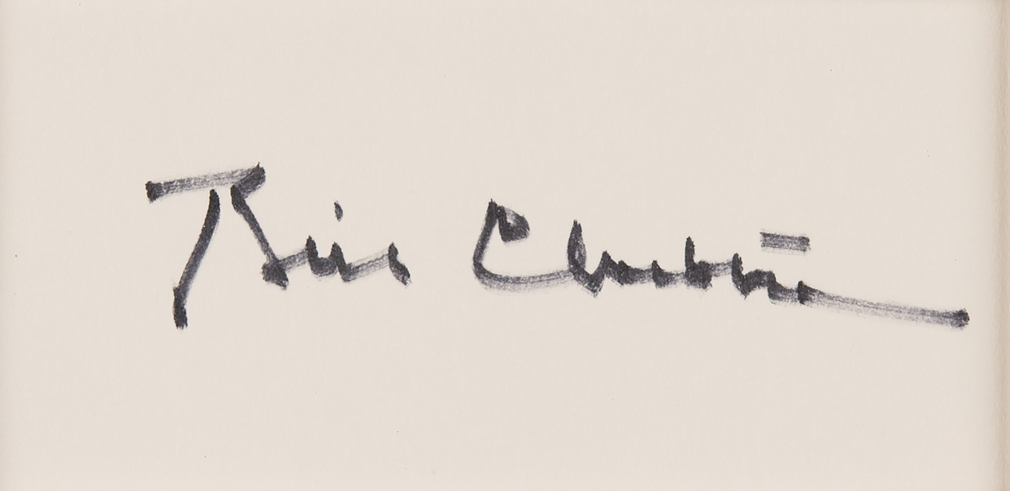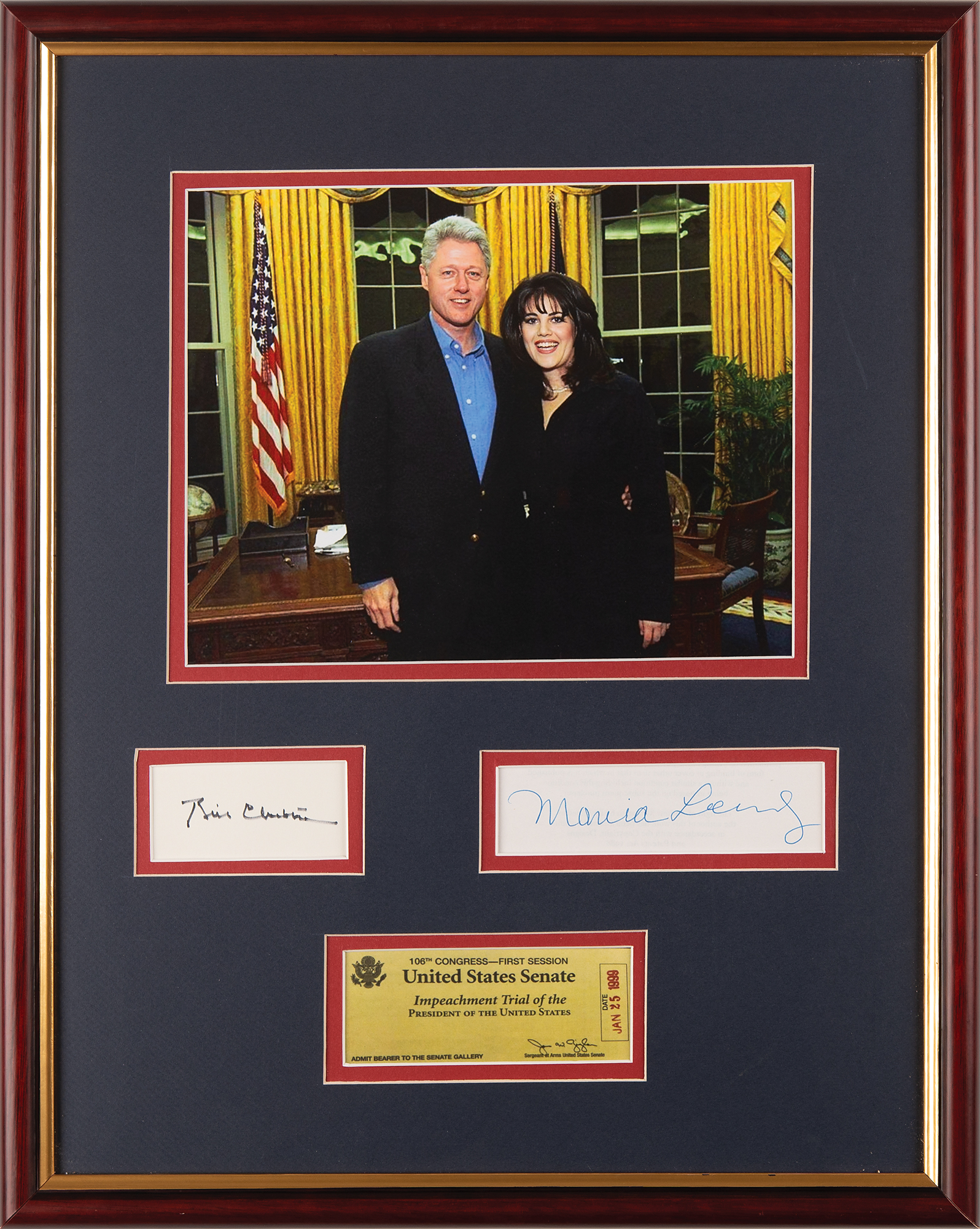 Ink signatures, "Bill Clinton" and "Monica Lewinsky," on separate white slips, nicely double-matted and framed with a portrait of the pair together in the Oval Office and a facsimile ticket to President Clinton's impeachment trial to an overall size of 15.5 x 19.5. In fine condition.