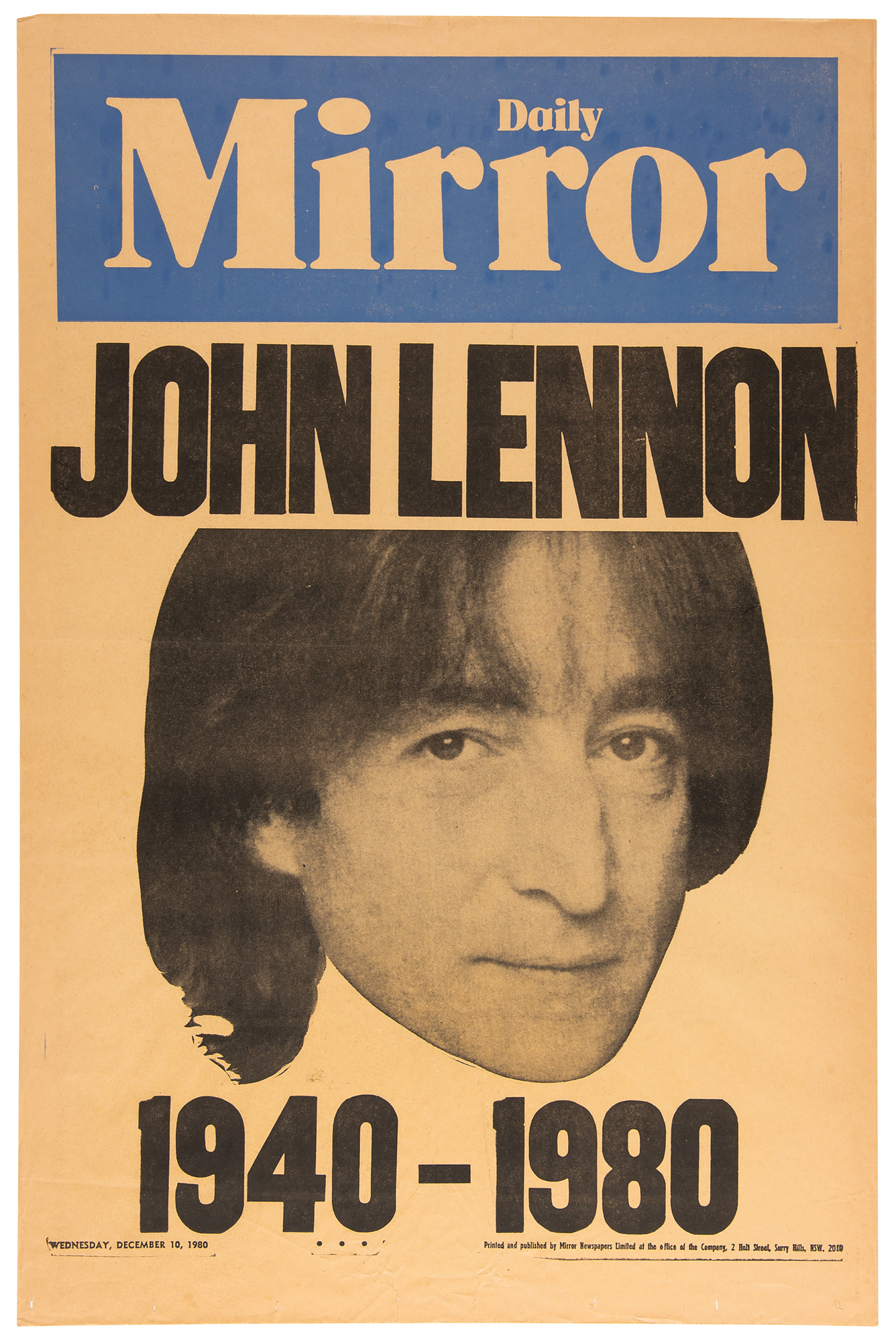 British newspaper hoarding poster, 15.5 x 23.5, advertising the edition of the Daily Mirror from December 10, 1980, covering the murder of John Lennon, with a portrait of the late musician and the large banner headline: "John Lennon, 1940–1980." In fine condition, with a few short edge tears.