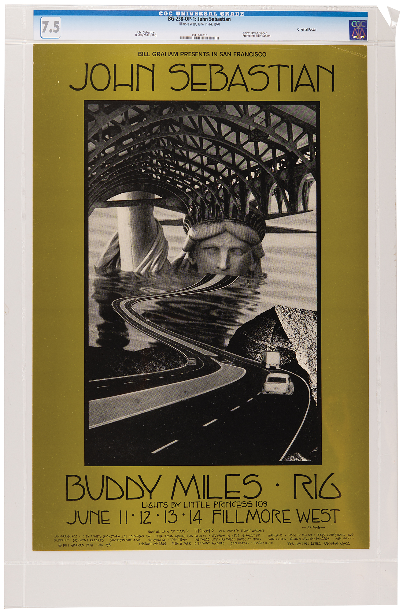 Original first printing color 14 x 21 concert poster for John Sebastian, Buddy Miles, and Rig at the Fillmore West on June 11–14, 1970, presented by Bill Graham (BG-238). Encapsulated by CGC with a universal grade of 7.5.
