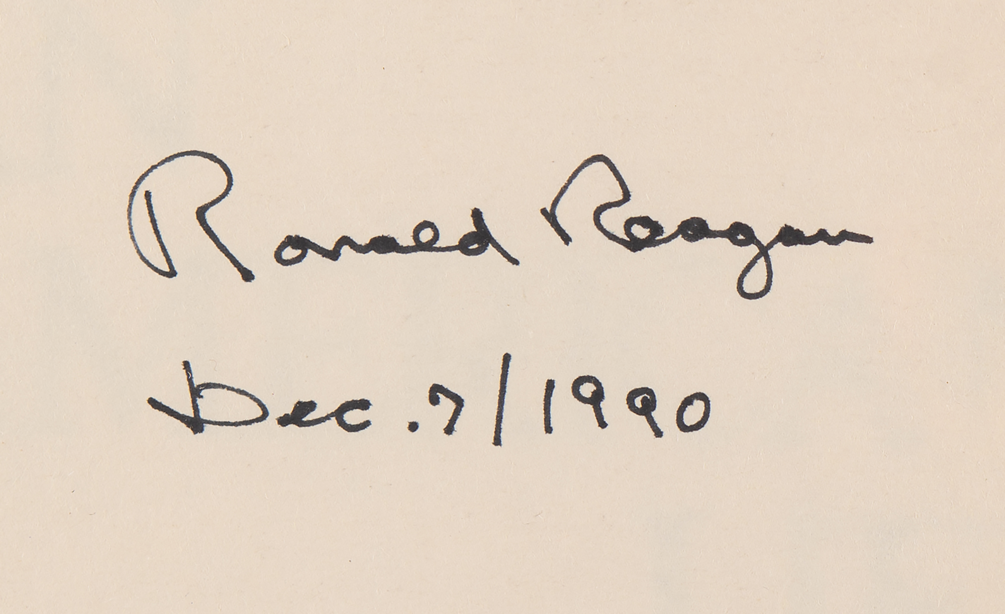 Signed book: An American Life. First British edition. London, England: Hutchinson, 1990. Hardcover with dust jacket, 6.5 x 9.5, 748 pages. Signed on the half-title page in black ink, “Ronald Reagan, Dec. 7 / 1990.” In fine condition, with a price sticker on the front of the dust jacket. Accompanied by a full letter of authenticity from JSA.