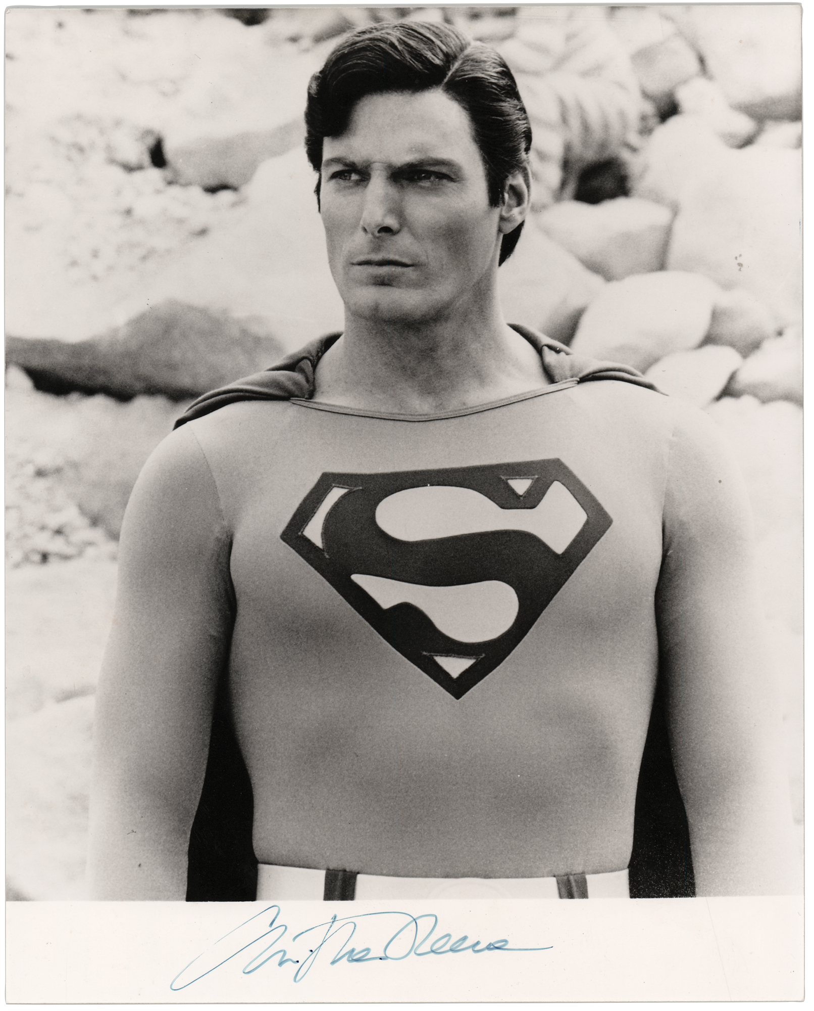 Satin-finish 8 x 10 half-length photo of Christopher Reeve as Superman, signed nicely in the lower border in felt tip. In fine condition. The consignor notes that the autograph was obtained by a crew member during the production of Superman: The Movie.