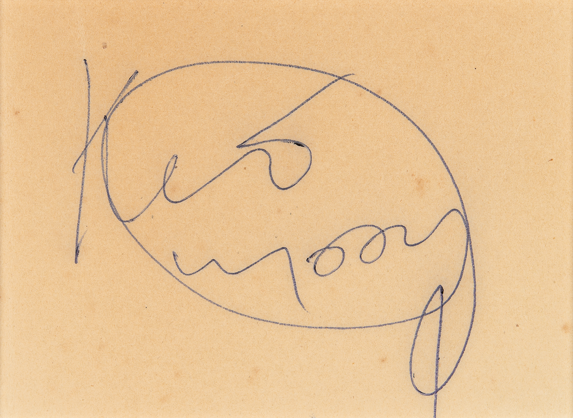 Ballpoint signature, "Keith Moon x,” on an off-white 4.75 x 3.5 sheet, which is double-matted with a Polydor publicity photo of The Who drummer to an overall size of 13 x 15. In fine condition.