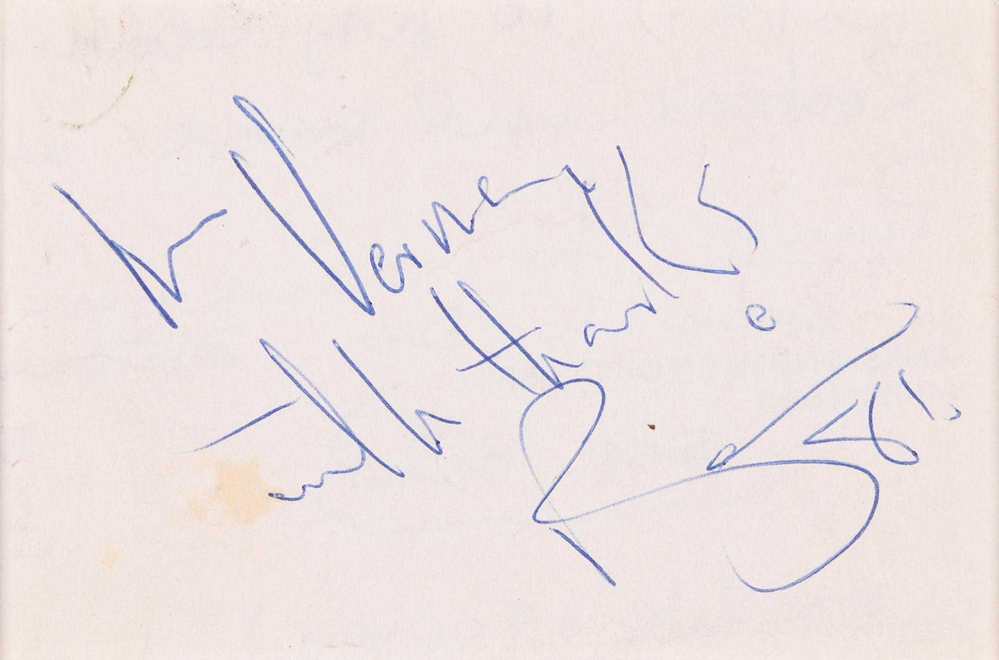 Ballpoint signature and inscription, "To Verne, with thanks, Bowie, 81,” on an off-white 3.75 x 2.5 sheet, which is double-matted with a photo of David Bowie to an overall size of 11.75 x 15.25. In fine condition, with one tiny stain touching the sentiment.