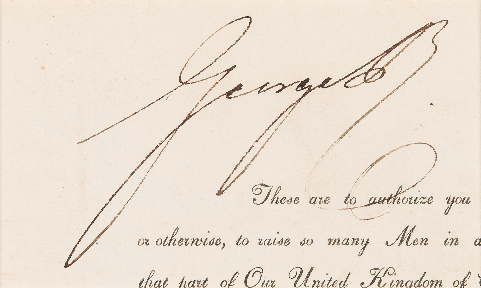Large ink signature, "George R,” on an off-white 4.75 x 2.75 slip clipped from the head of a document, which is double-matted with a color portrait to an overall size of 9.5 x 15.5. In fine condition.
