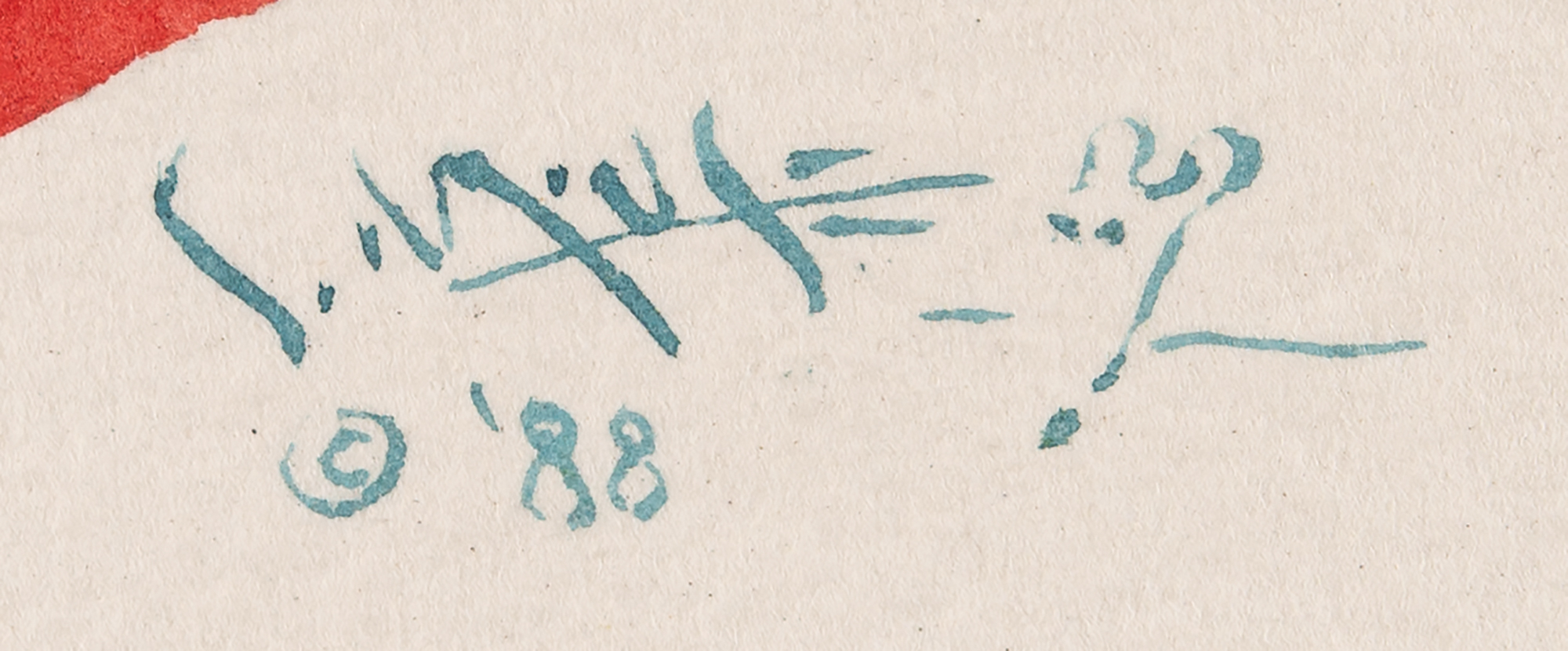 Beautiful original painting by Stanley Mouse of a circular Jerry Garcia emblem, accomplished in watercolor on an off-white 10.5 x 11 sheet of artist paper, depicting a central blue rose with rising green leaves against a mauve background, encircled by a red border that features the name of the Grateful Dead’s iconic frontman in stylized uppercase letters: “Jerry Garcia.” Signed below in ink by the artist with his copyright signature, “S. Mouse, ‘88,” who draws the small head of a mouse. In very fine condition.