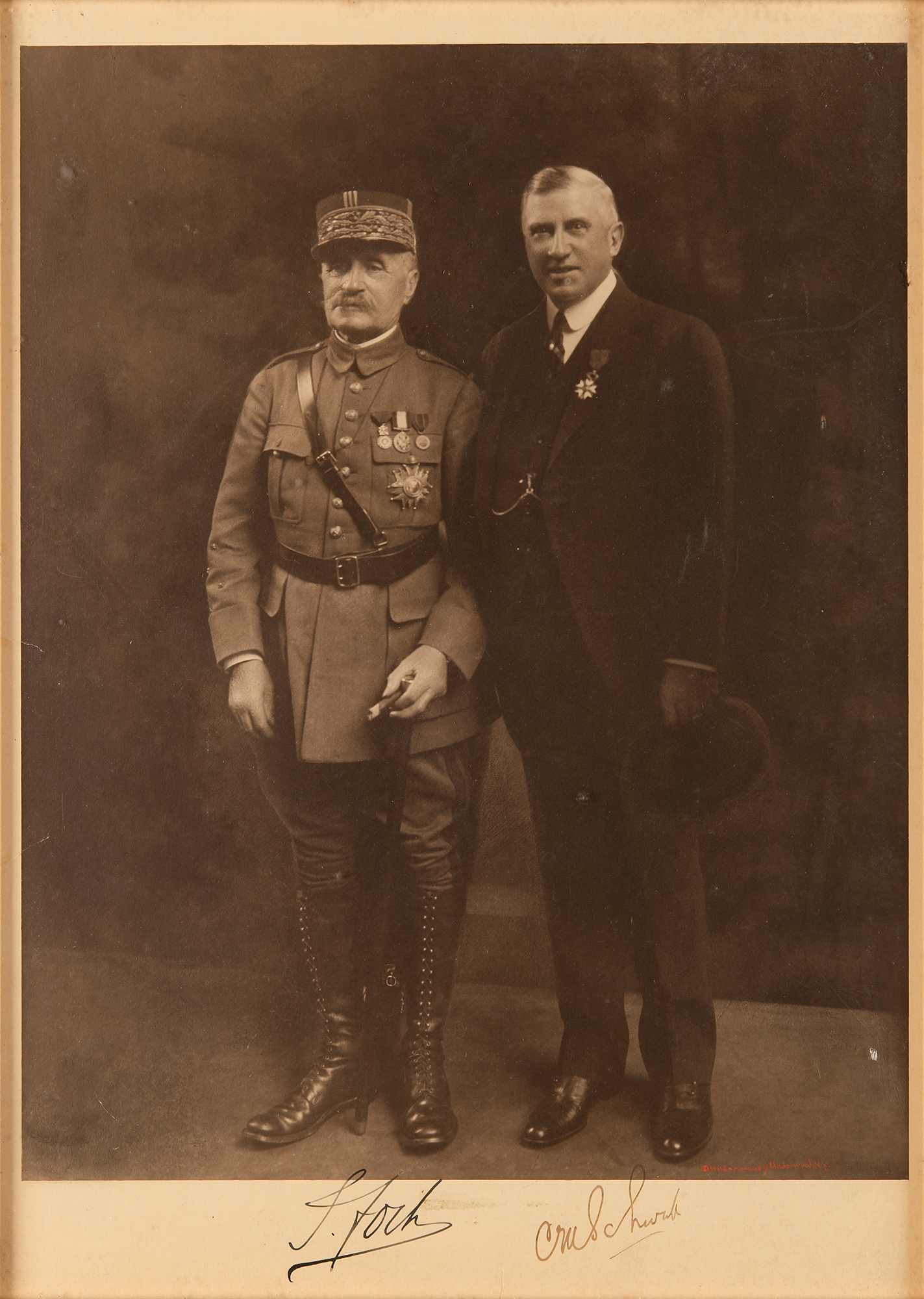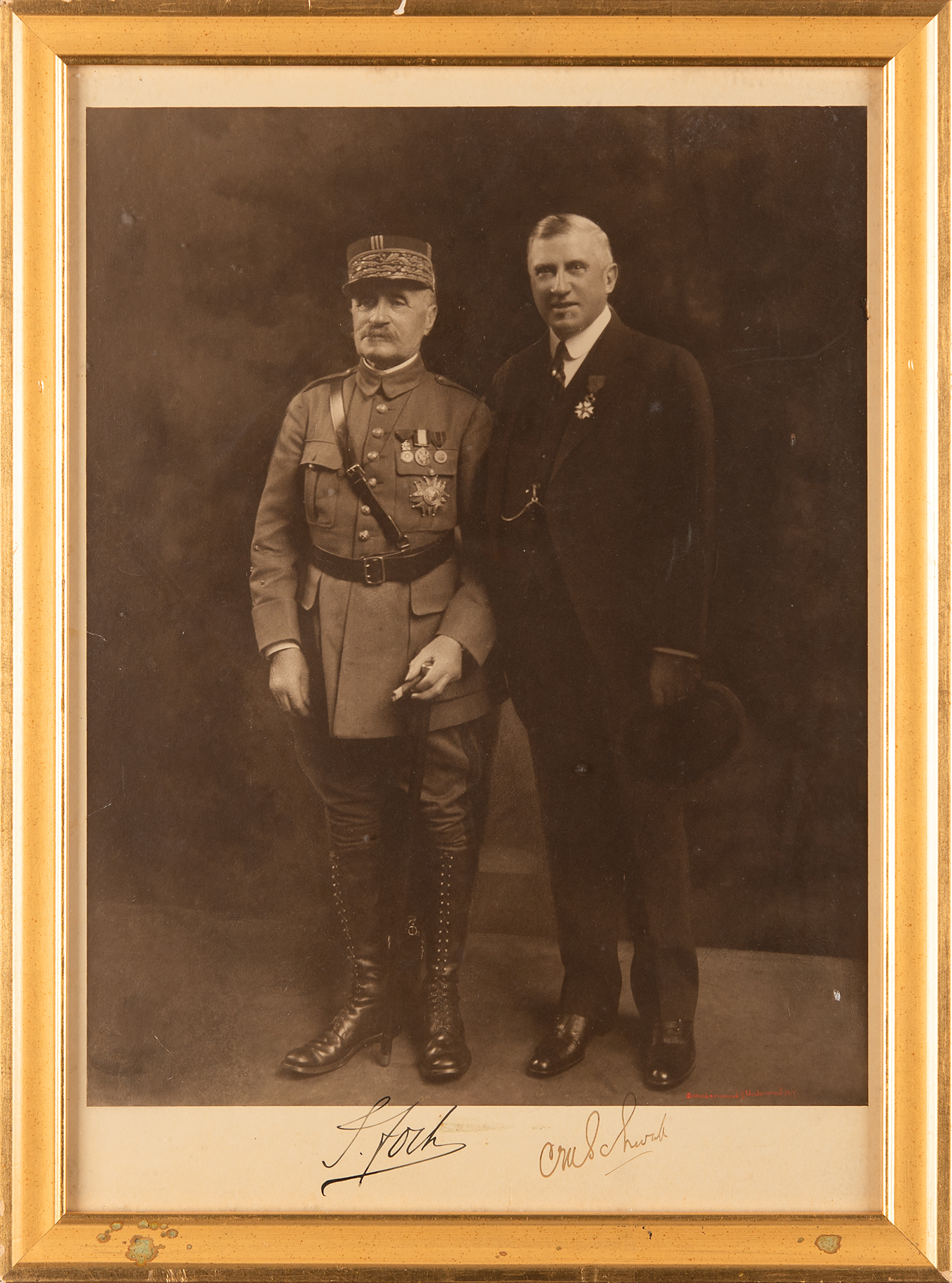 Unusual vintage matte-finish 11 x 15.5 photo of the French marshal and the steel magnate posing together, signed in fountain pen, "F. Foch" and "C. M. Schwab." Framed to an overall size of 12.75 x 17.25. In fine condition, with some minor damage to the frame.