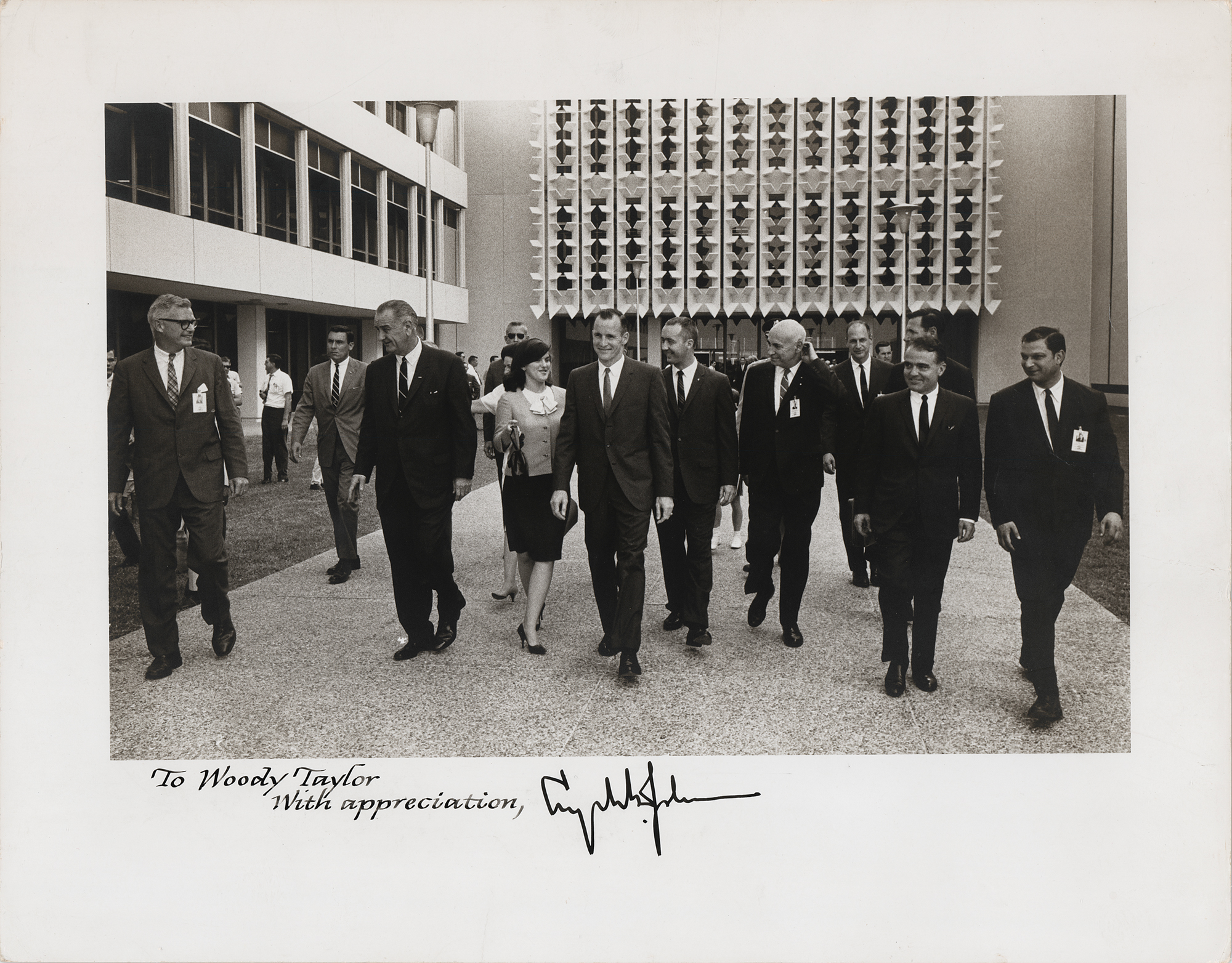 Vintage matte-finish 14 x 11 photo of President Johnson walking with Gemini 4 astronauts Ed White and Jim McDivitt, calligraphically inscribed in the lower border, "To Woody Taylor, with appreciation," and signed in fountain pen, "Lyndon B. Johnson.” Stamp-dated on the reverse "11 Ju 65." In very good to fine condition, with creasing to the lower left corner and in the wide borders, and light silvering to the darker areas of the image. Assigned to Lyndon B. Johnson's vice-presidential detail in the tragic 1963 Dallas motorcade, Taylor witnessed and later testified about the Kennedy assassination.