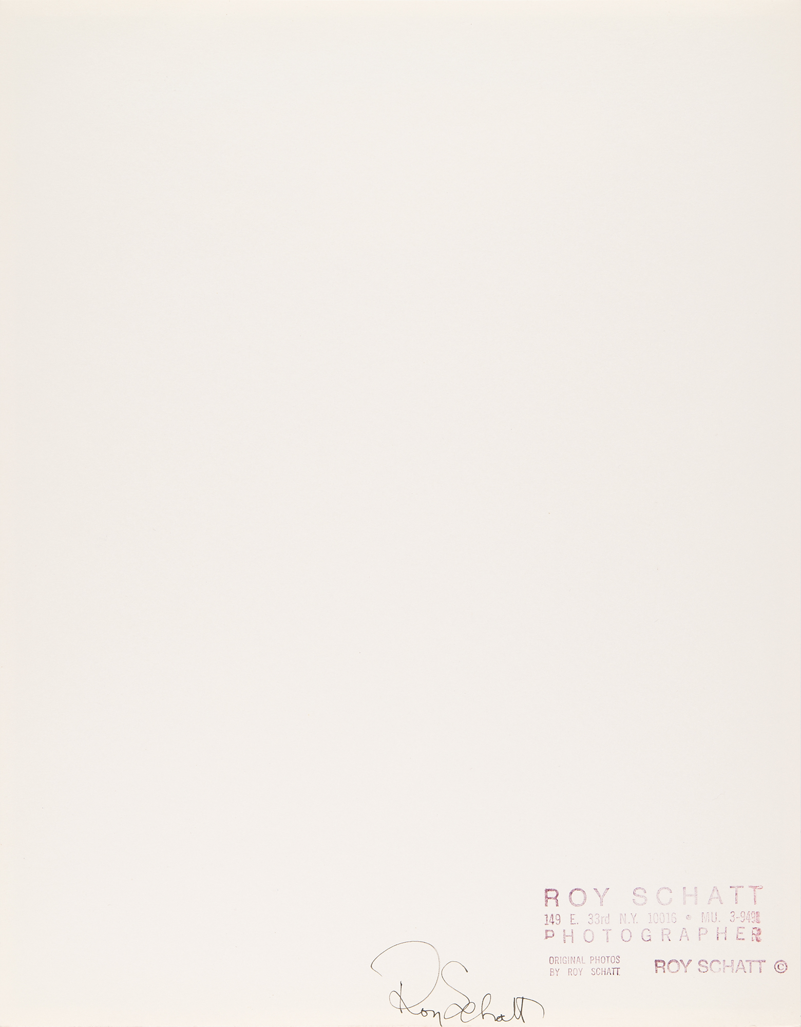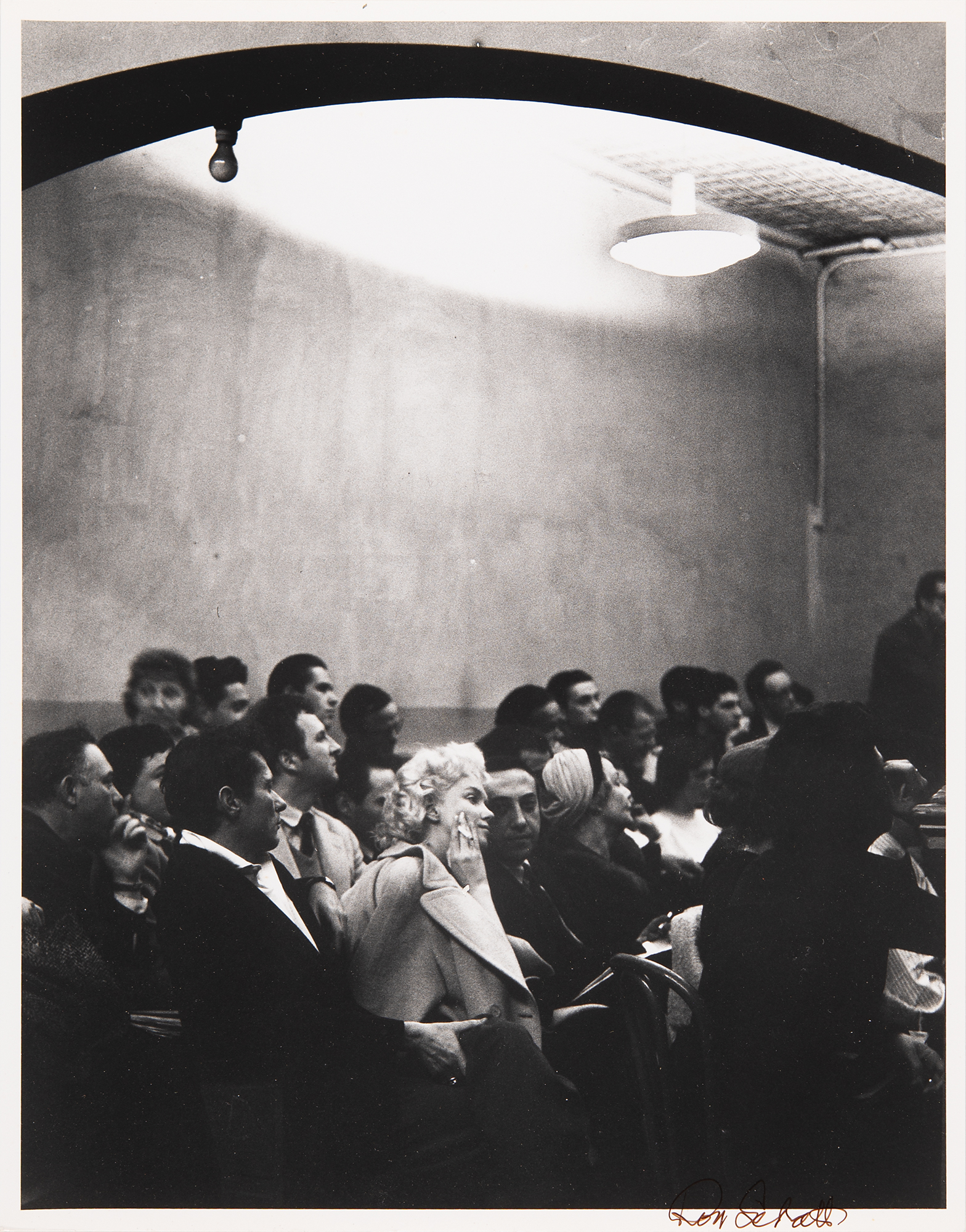 Fantastic original semi-glossy 11 x 14 silver gelatin photograph of Marilyn Monroe by photographer Roy Schatt, depicting the blonde actress at the Actors Studio in 1955. Signed in the lower border in black felt tip by Schatt, who also signs on the reverse. Reverse also carries Schatt's credit stamp. In very fine condition.