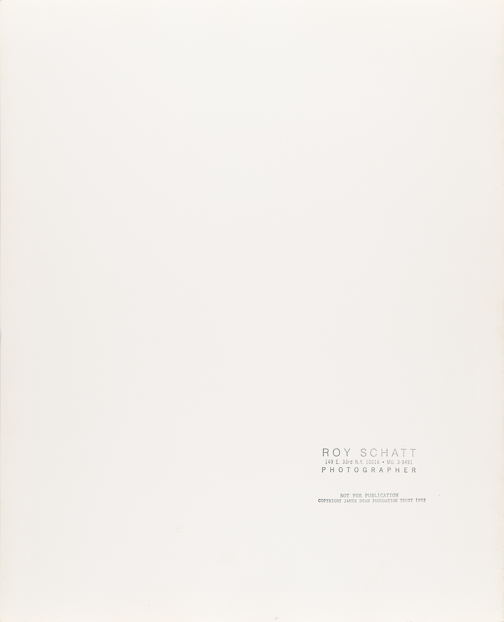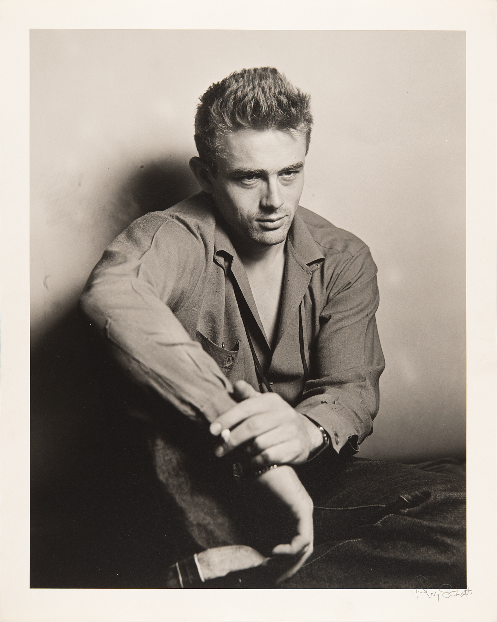 Original matte-finish 16 x 20 silver gelatin photograph of James Dean wearing jeans and a button-down shirt, signed in the lower border in pencil by photographer Roy Schatt. Also stamped on the reverse with Schatt's credit. In very fine condition.
