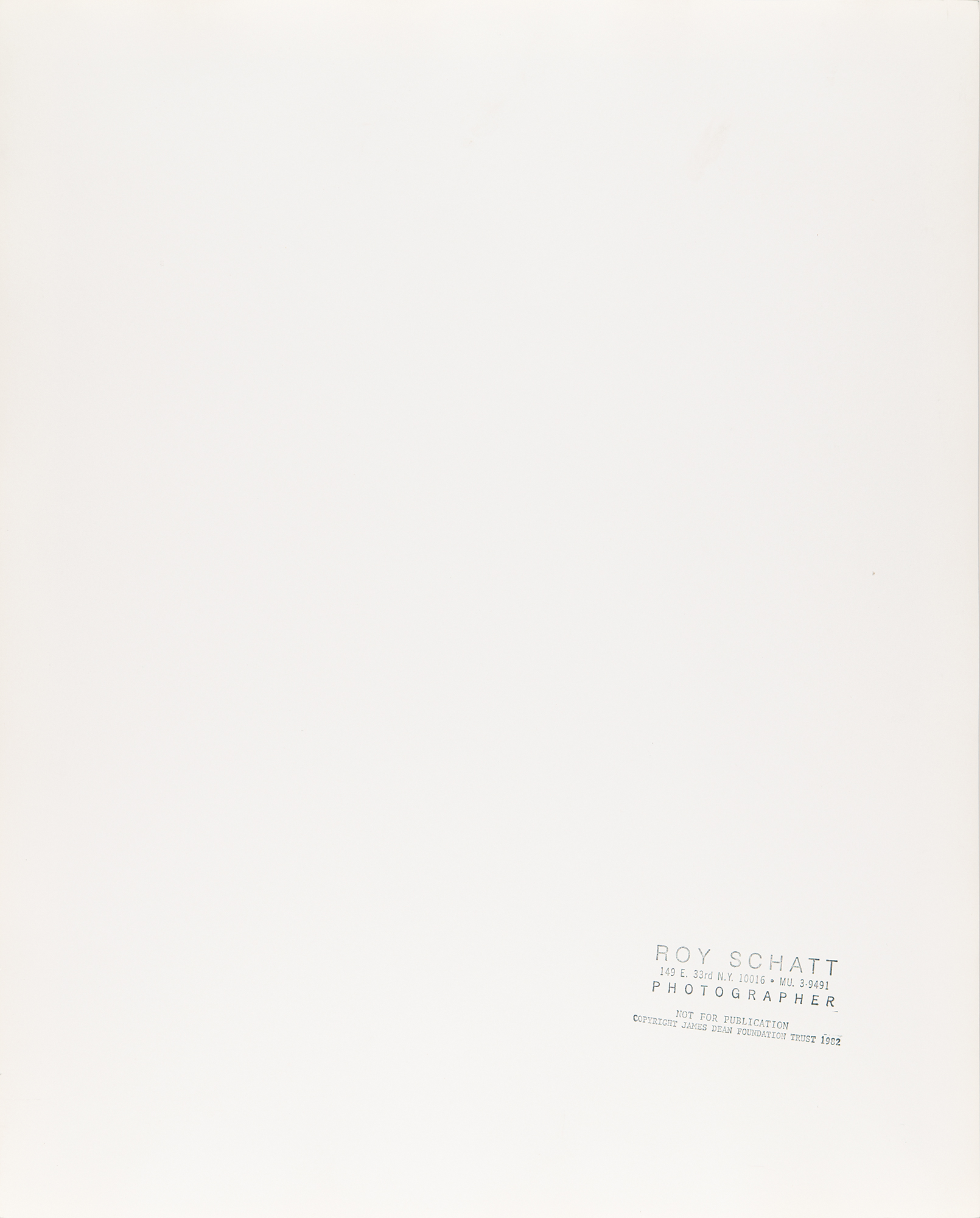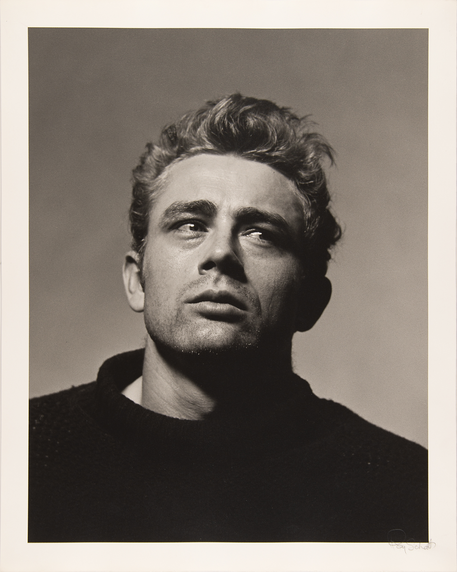 Original matte-finish 16 x 20 silver gelatin photograph of James Dean from the 'Torn Sweater Series' taken by photographer Roy Schatt for Life Magazine on December 29, 1954, signed in the lower border in pencil by Schatt. Also stamped on the reverse with Schatt's credit, and stamped: “Not for Publication, Copyright James Dean Foundation Trust 1982.” In very fine condition.