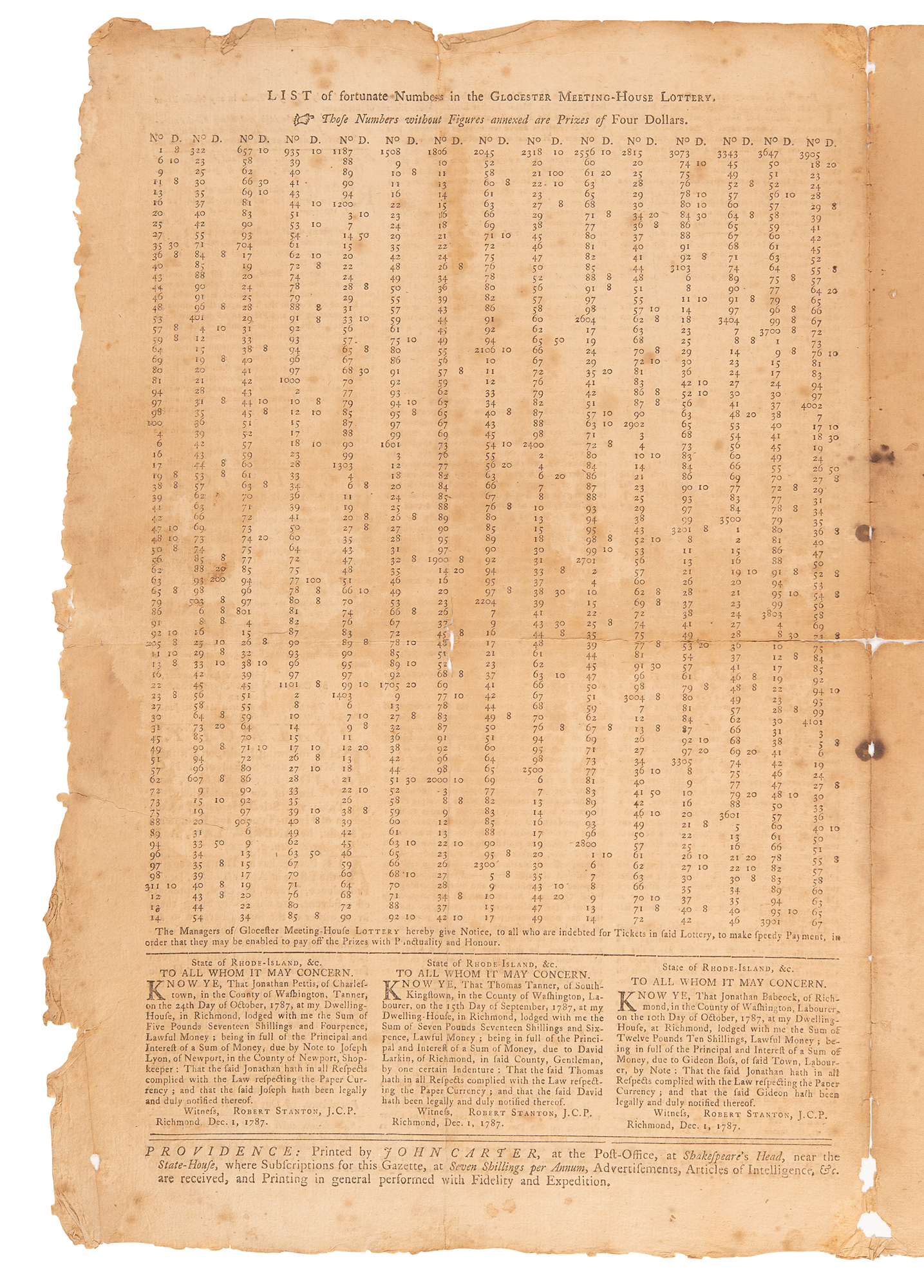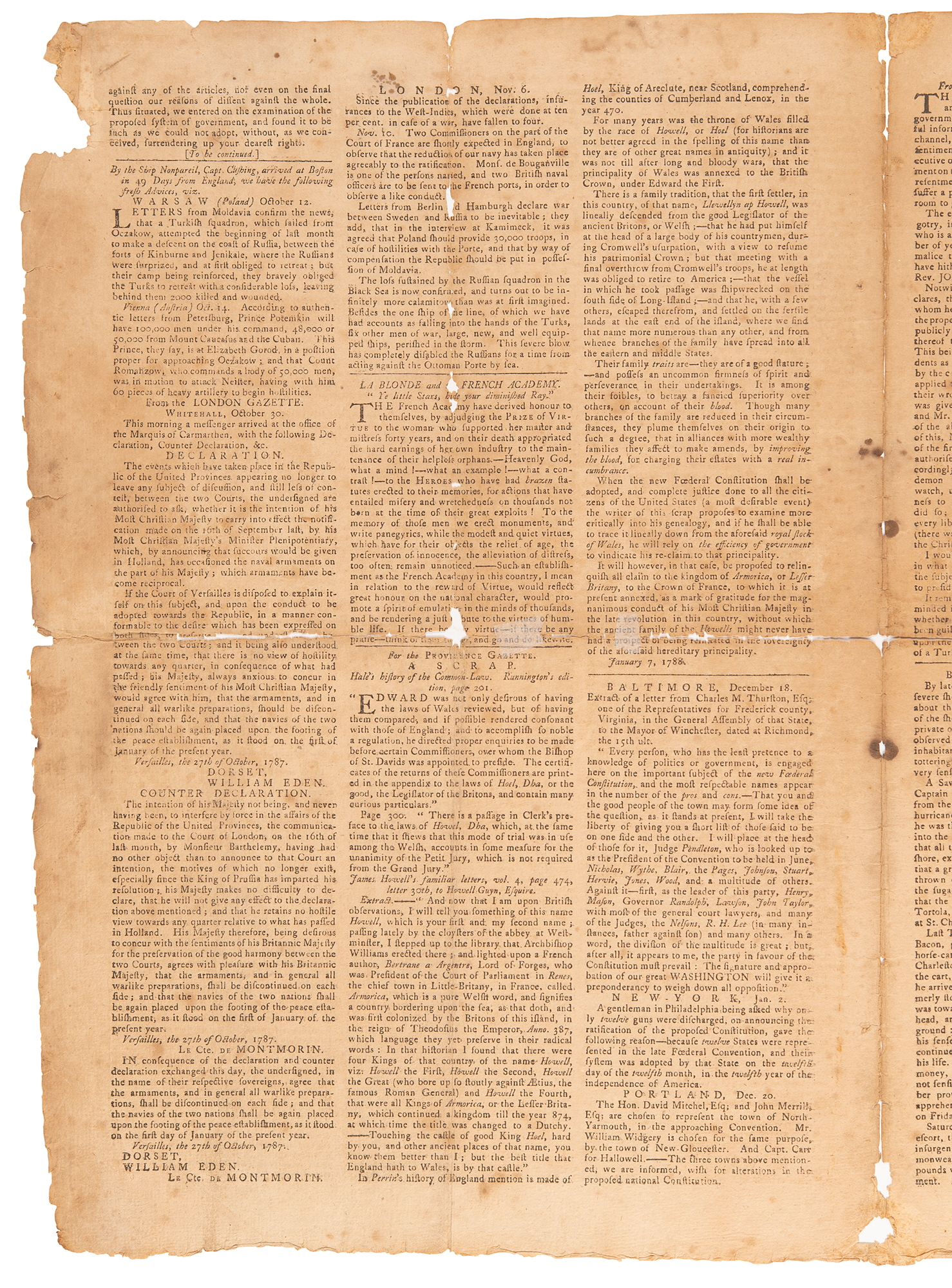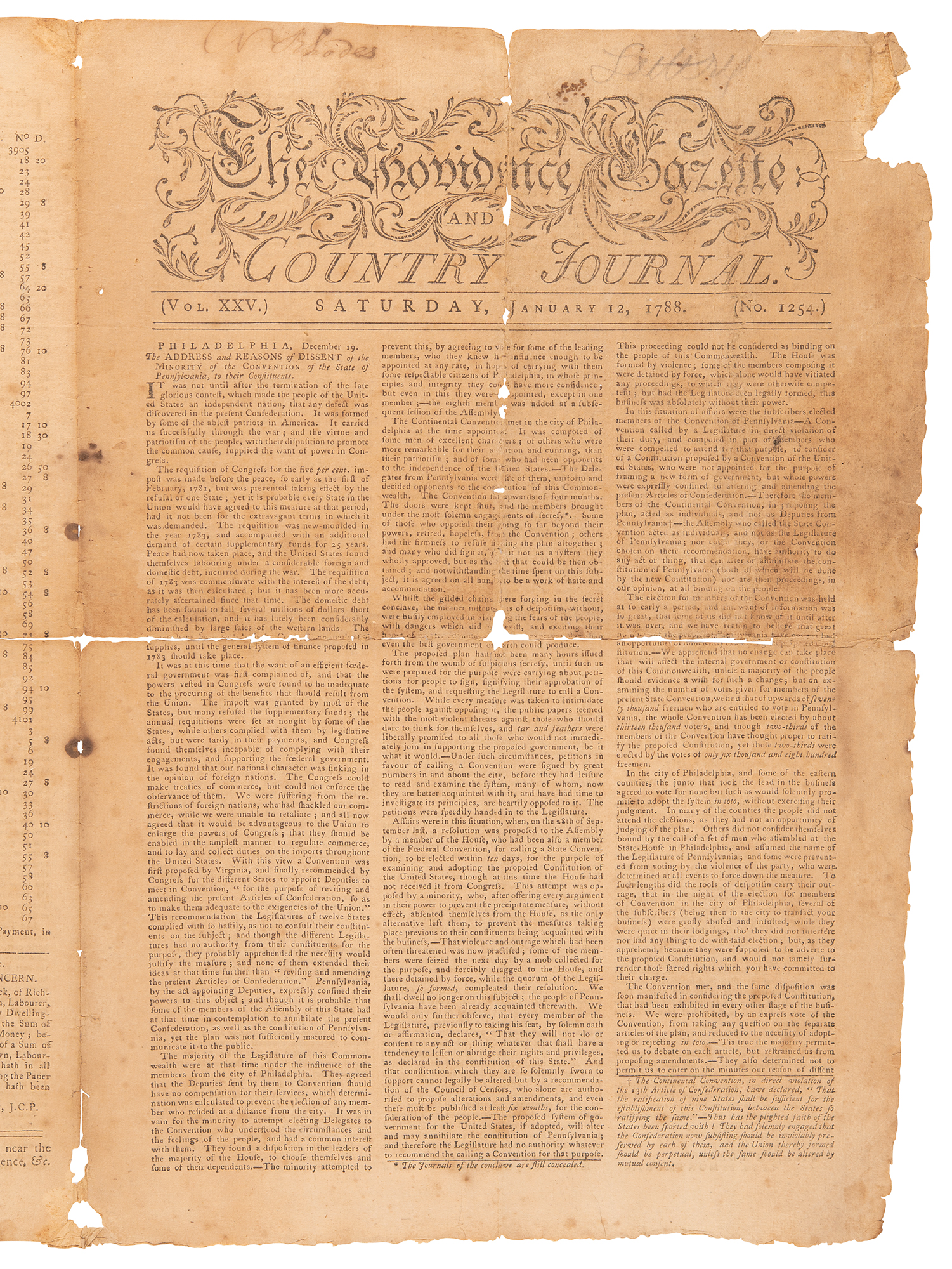 Complete issue of The Providence Gazette and Country Journal from January 12, 1788, 10.25 x 18, four pages, featuring a front-page article headed “The Address and Reasons of Dissent by the Convention of the State of Pennsylvania.” It contains a letter, dated December 18, 1787, which was issued by the minority of the Pennsylvania Ratifying Convention, where 23 of 69 delegates opposed the adoption of the Constitution. In this installment, the dissenters outline their procedural objections—charging that the convention was convened hastily and that the Philadelphia framers had exceeded their mandate by proposing an entirely new frame of government. Subsequent issues of the Providence Gazette carried the continuation, where the dissenters raised substantive criticisms of the Constitution itself, including the absence of a bill of rights. As the first official minority report to emerge from a state convention, the Pennsylvania Dissent became a touchstone for Anti-Federalist opposition nationwide. In very good to fine condition, with some paper loss to the edges, spine, and intersecting folds.