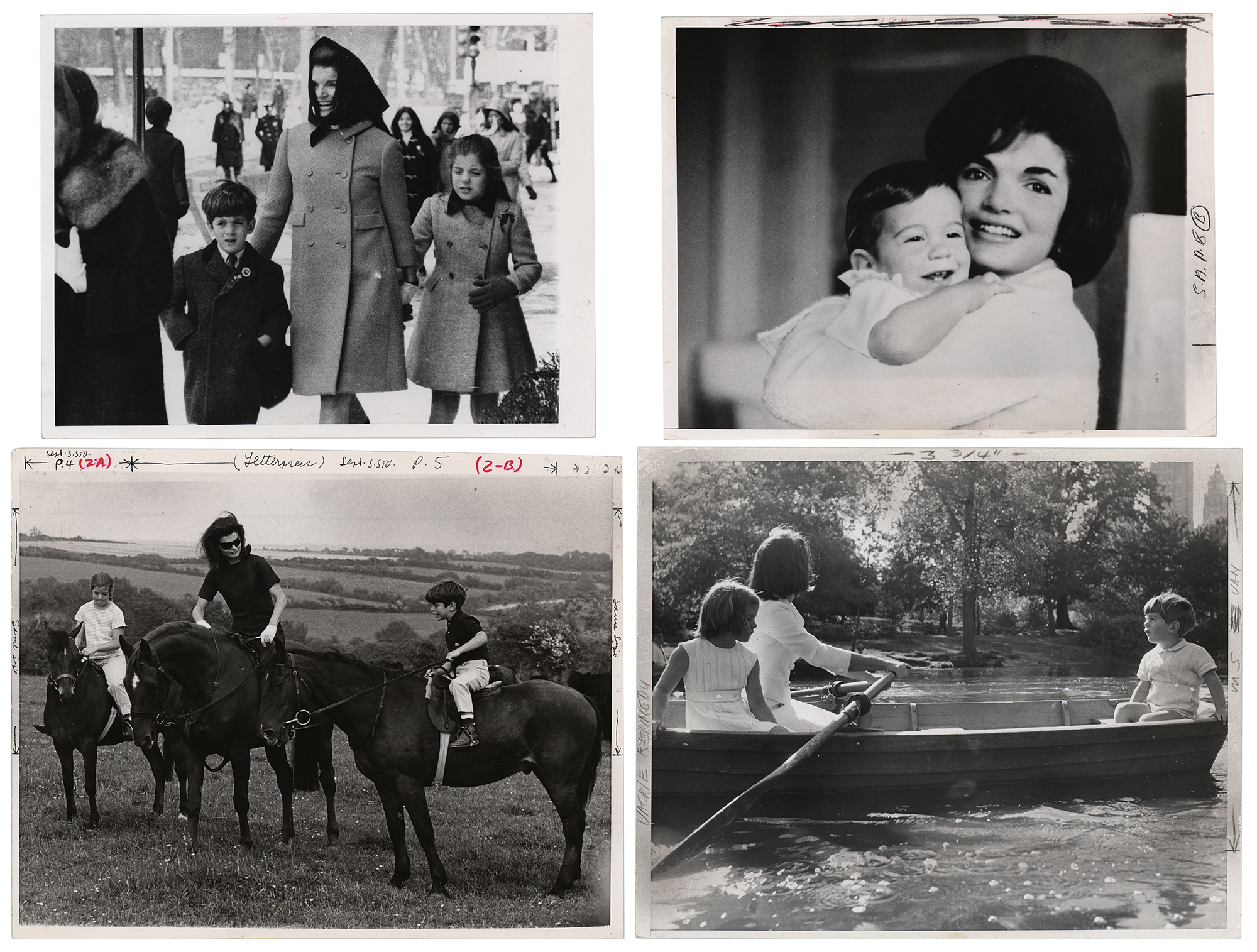 Archive of 168 silver gelatin press photographs of Jacqueline Kennedy with her children, Caroline and John, Jr., ranging in size from 7 x 5 to 12 x 8, most with press stamps, captions, or notations on the reverse, mostly printed circa 1960–1974. Includes various views of Jacqueline Kennedy with her children during the White House years and beyond, showing them during various recreational activities like riding horses, rowing boats, skiing, traveling, and relaxing together; attending events; and a few posed, portrait-style photos. In overall very good to fine condition, with general wear and various editorial notations to image from use in the newsroom.