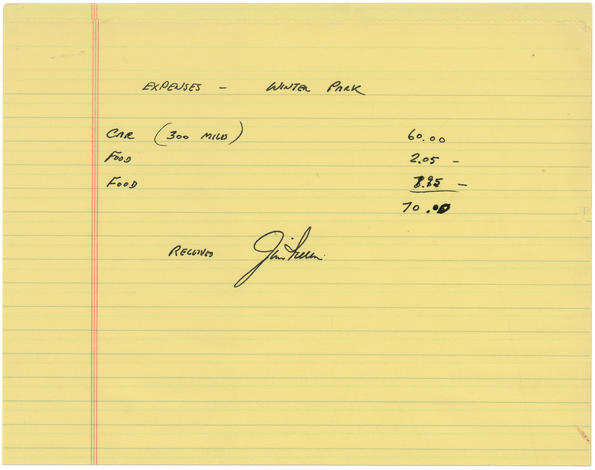 ADS, signed "Receive, Jim Irwin," one page, 8.5 x 13, no date. Handwritten expense report, in full: "Expenses - Winter Park - Car (300 Miles) 60.00, Food 2.05, Food 7.95 - 70.00." In fine condition.