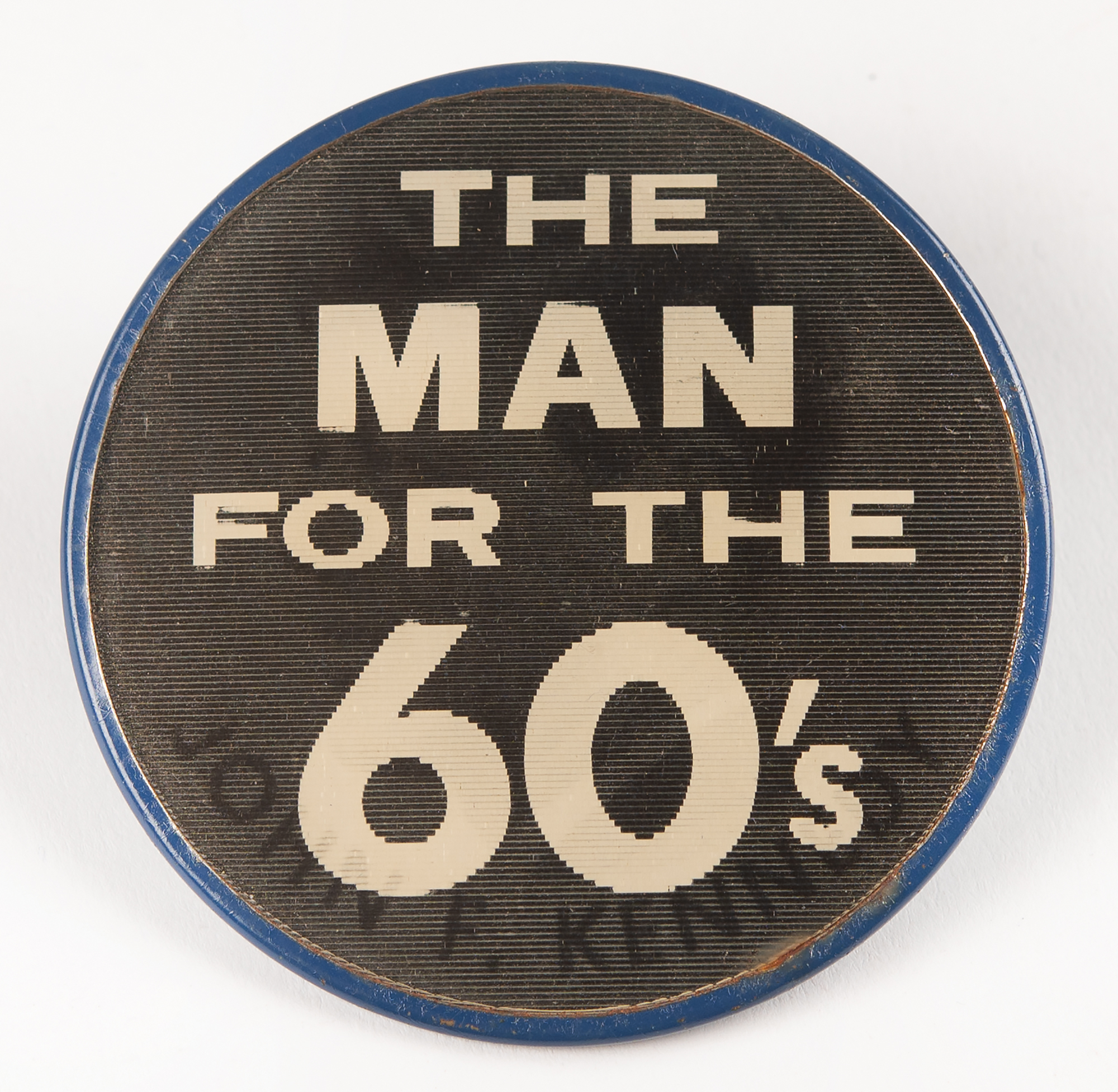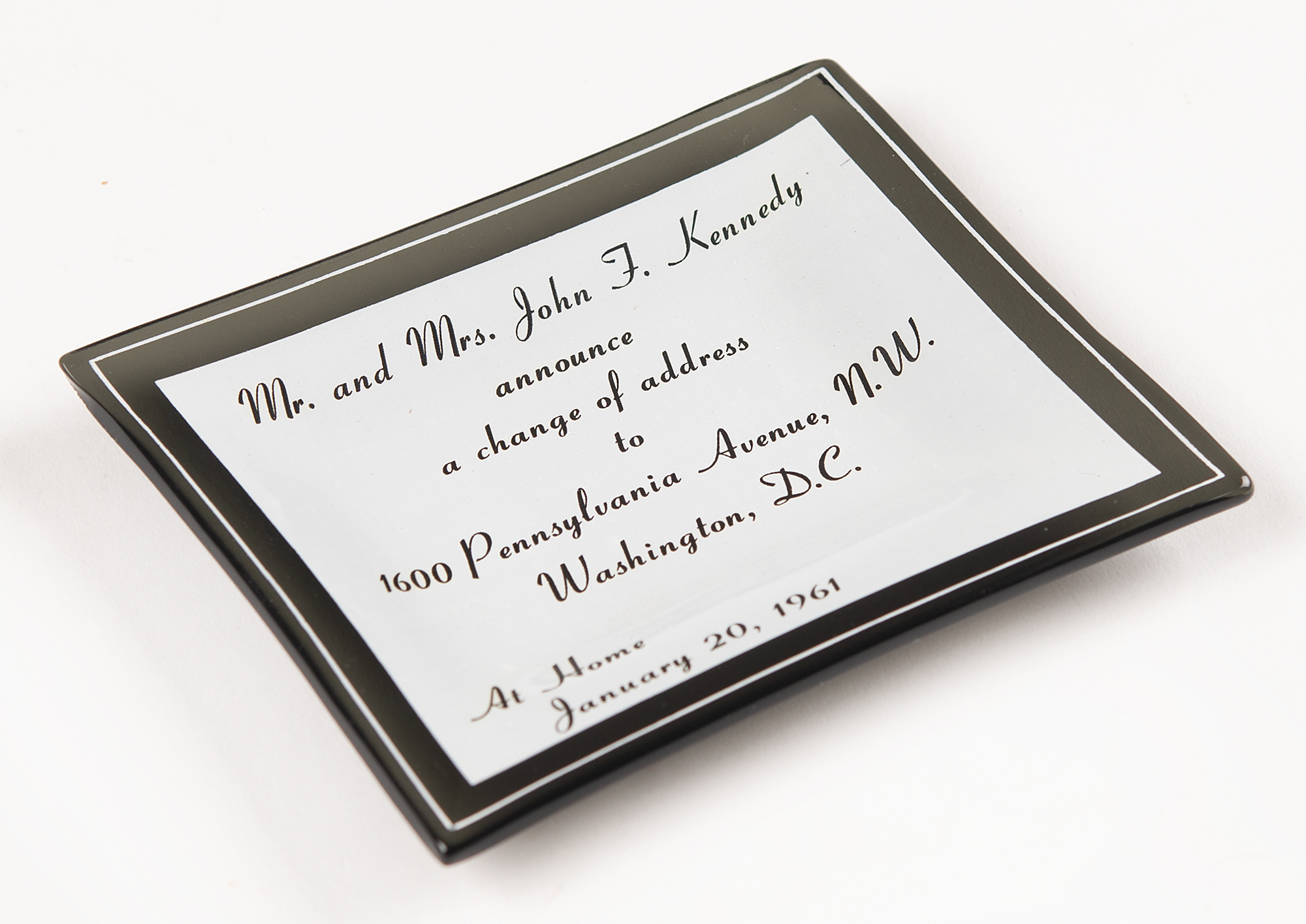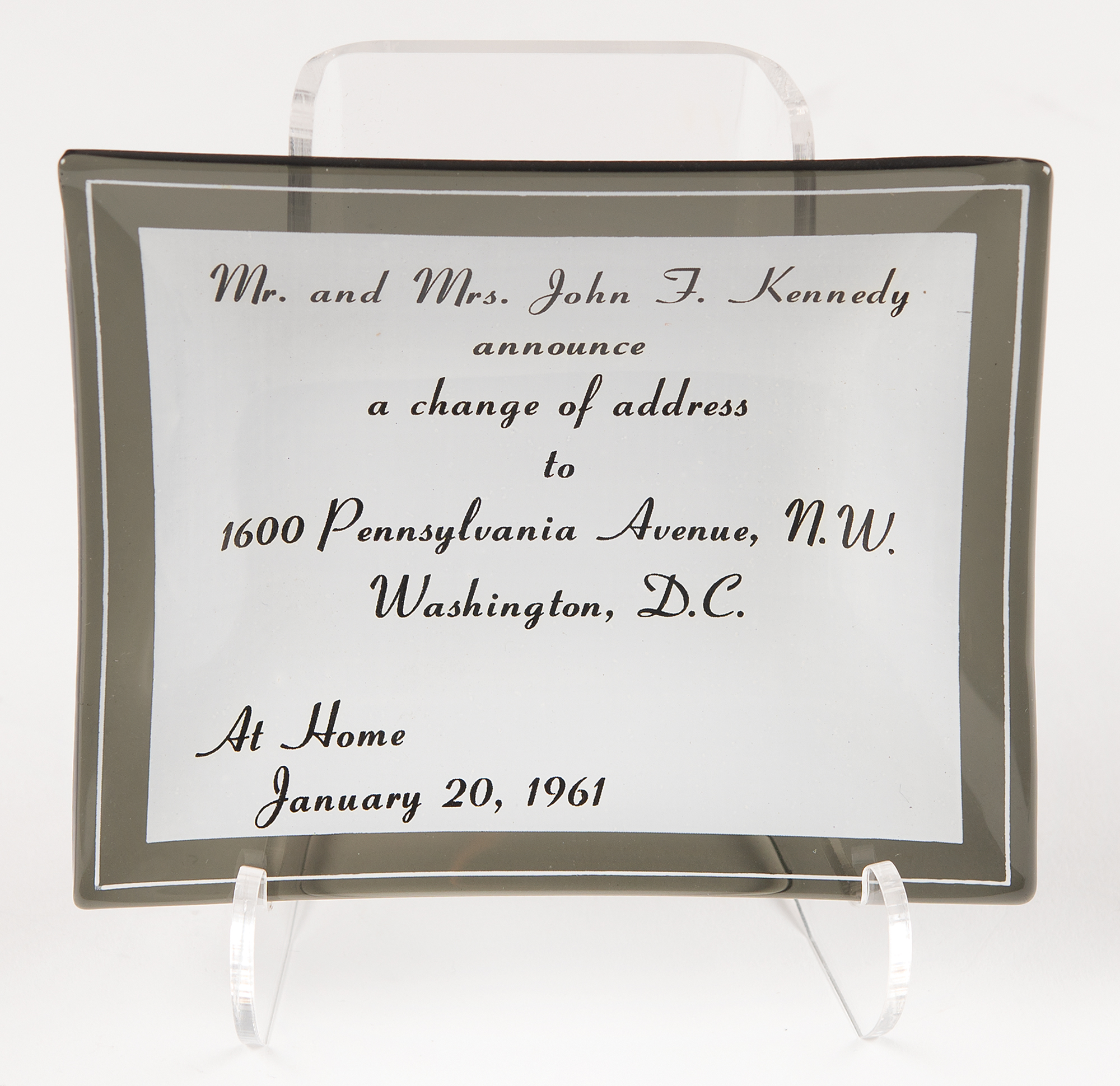 Souvenir glass ashtray or candy dish honoring John F. Kennedy's 'change of address' to the White House, measuring 4.75˝ x 3.75˝, reading: "Mr. and Mrs. John F. Kennedy announce a change of address to 1600 Pennsylvania Avenue, N.W., Washington, D.C., At Home, January 20, 1961." Also includes a 2.5˝-diameter lenticular campaign button, featuring Kennedy's portrait and "The Man for the 60's" text, produced by Vari-Vue/Pictorial Productions, Inc. In overall fine condition.