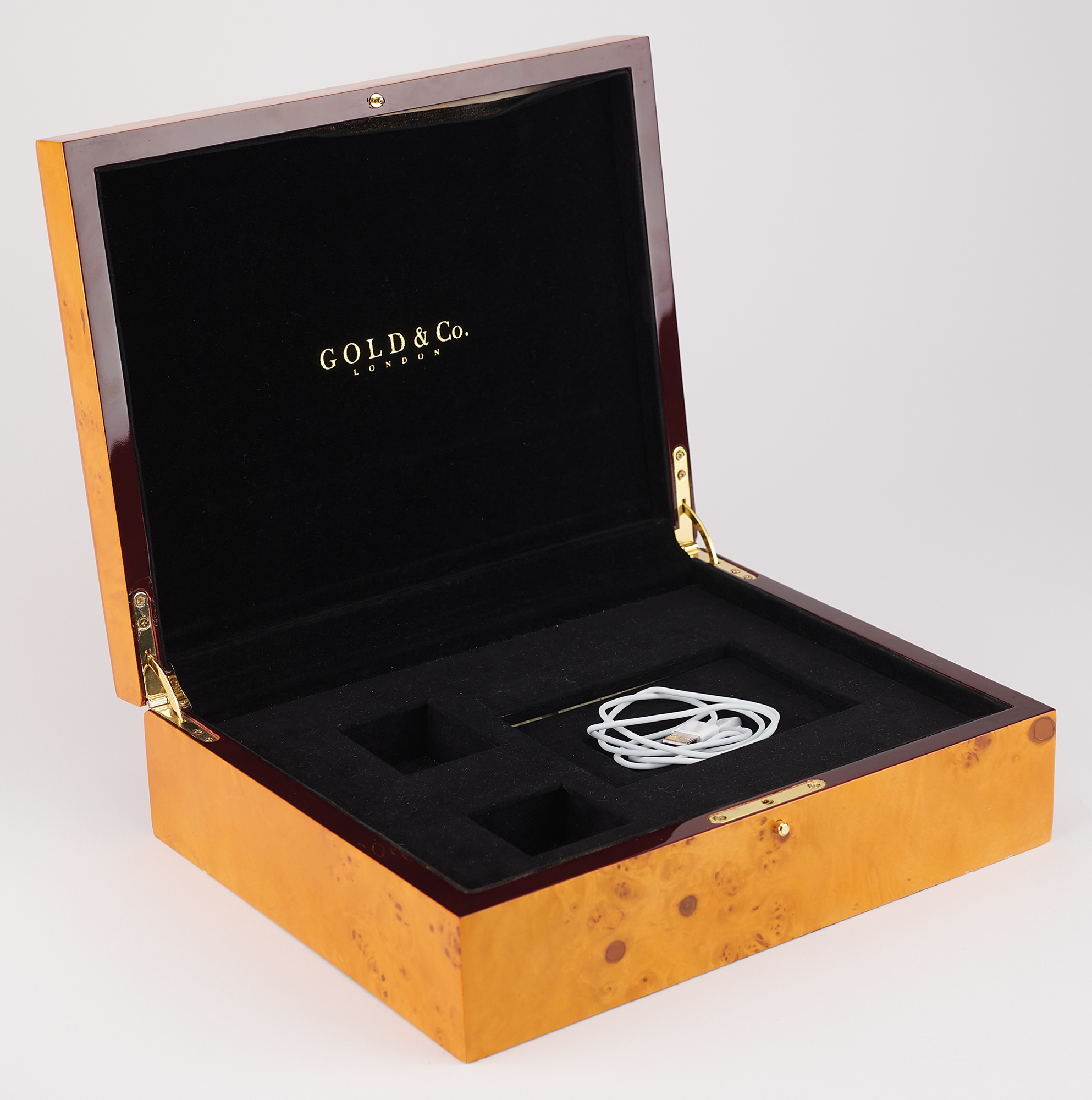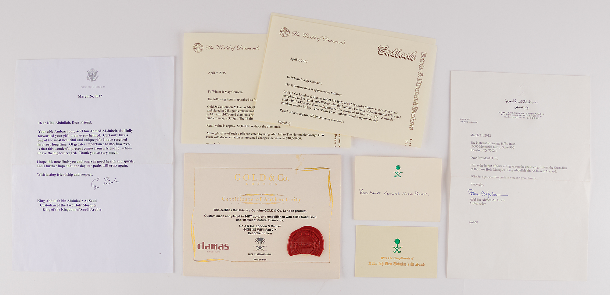 The iPad is housed in a gorgeous burlwood box with "Gold & Co./Damas" inlay in the lid. Accompanied by a presentation card, "With the Compliments of Abdullah Ben Abdulaziz Al Saud," in its envelope addressed to "President George H. W. Bush," as well as a letter to Bush from Ambassador Adel bin Ahmed Al-Jubeir, dated March 21, 2012, in full: "Dear President Bush, I have the honor of forwarding to you the enclosed gift from the Custodian of the Two Holy Mosques, King Abdullah bin Abdulaziz Al-Saud."