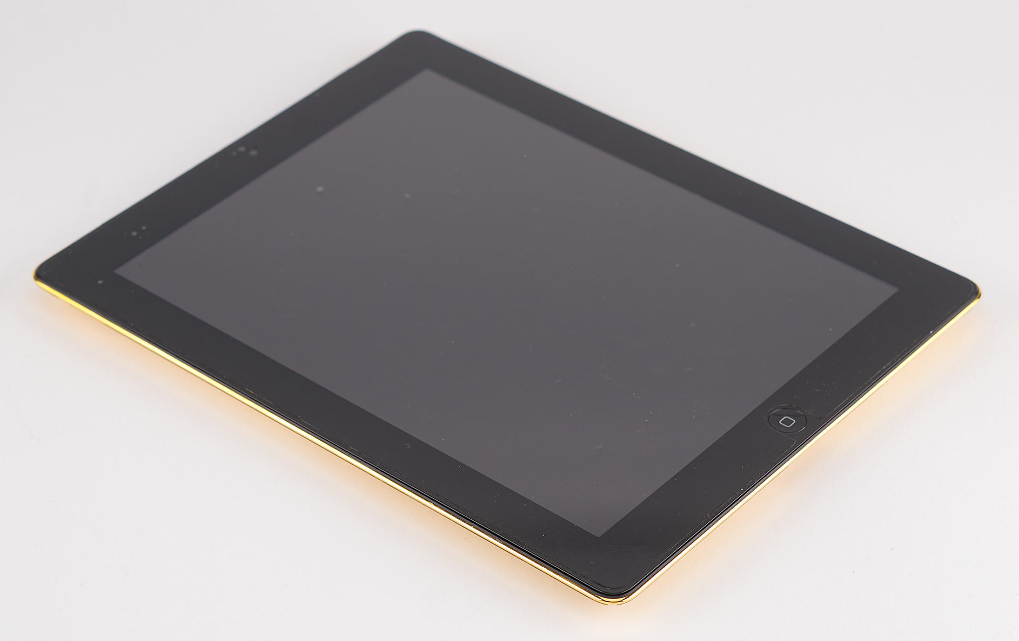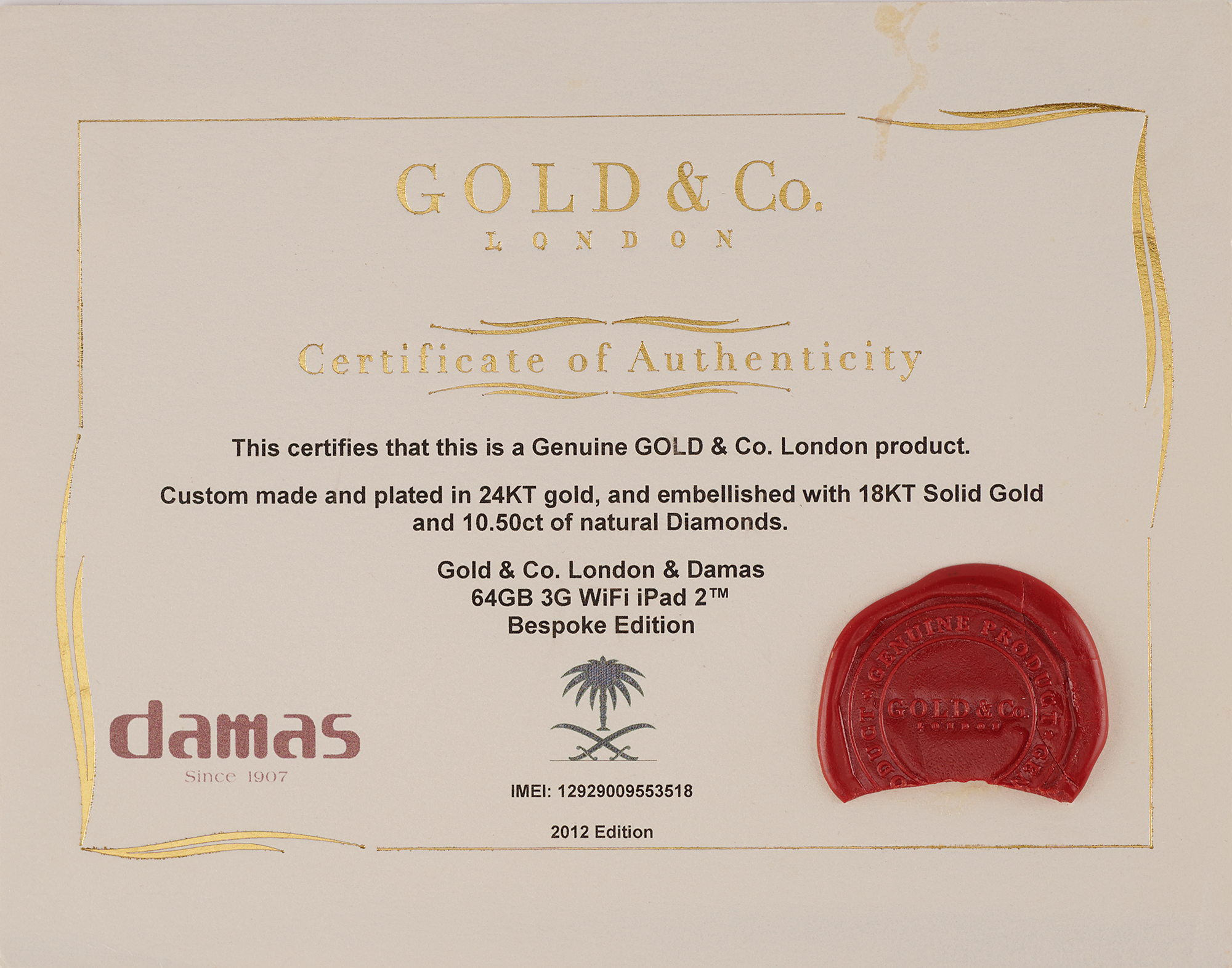 Unique bespoke edition of the Apple iPad 2 (64GB 3G/WiFi version) customized by Gold & Co. London & Damas in 2012 for King Abdullah bin Abdulaziz Al Saud of Saudi Arabia, and presented as a gift to former president George H. W. Bush. The iPad's caseback has been luxuriously plated in 24K gold and encrusted with 1,147 prong-set round diamonds forming the tree-and-sword emblem of Saudi Arabia (10.50 TW). Inscribed at the bottom in English and Arabic: "To our Dearest Friend president George Bush, Wishing you all the health and happiness, Abdullah Bin Abdelaziz Al Saud." In fine condition, with some light scratches to the polished gold finish.