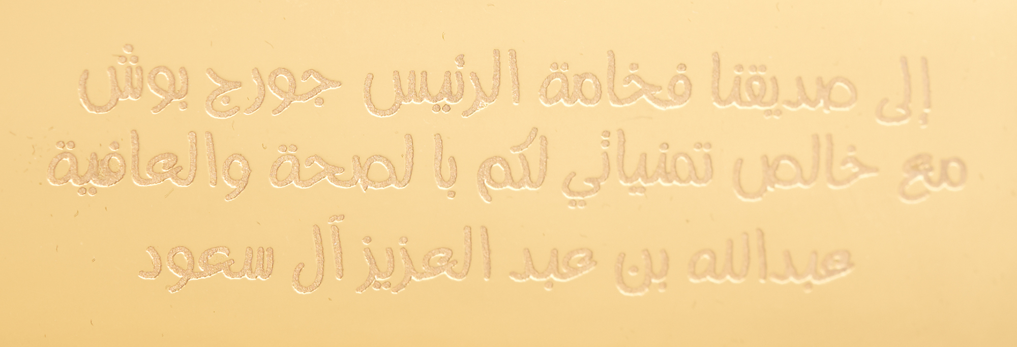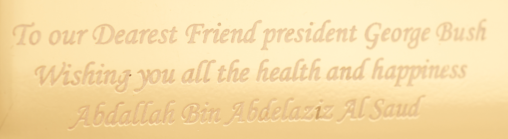 Includes a photocopy of Bush's reply, sent to the king, in part: "Your able Ambassador, Adel bin Ahmed Al-Jubeir, dutifully forwarded your gift. I am overwhelmed. Certainly this is one of the most beautiful and unique gifts I have received in a very long time." Also includes a certificate of authenticity from Gold. & Co., London, and two appraisal letters from Bullock Estate & Diamond Brokers. A remarkably opulent diplomatic gift, connecting two world leaders.