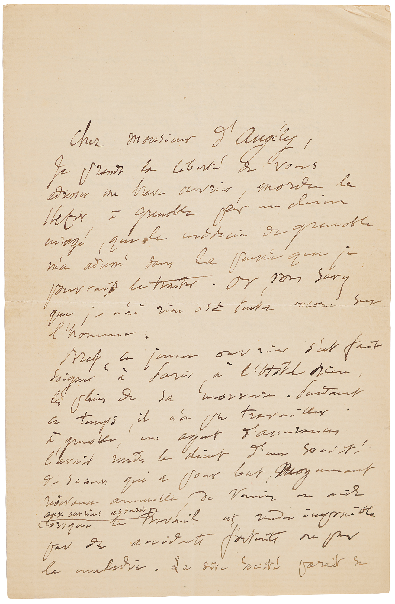 ALS in French, “L. Pasteur,” one page, both sides, 5.25 x 8, April 1, 1885. Handwritten letter from Louis Pasteur to “Monsieur d'Angély,” penned a few weeks before his first effective application of the rabies vaccine on the young Alsatian Joseph Meister, which took place in July 1885. In the letter, Pasteur conveys concern not only about his patient's health, but also his patient's financial needs and insurance, in part (translated): “I take the liberty of referring to you a brave workman bitten…in Grenoble by a rabid dog, whom the doctor referred to me in the thought that I could treat him, but you know that I have not yet dared to do anything to the man…You would be very kind to take note of this workman's insurance policy and give him advice so that he can – without untying his purse – recover the money to which he seems to have certain rights.” In fine condition.