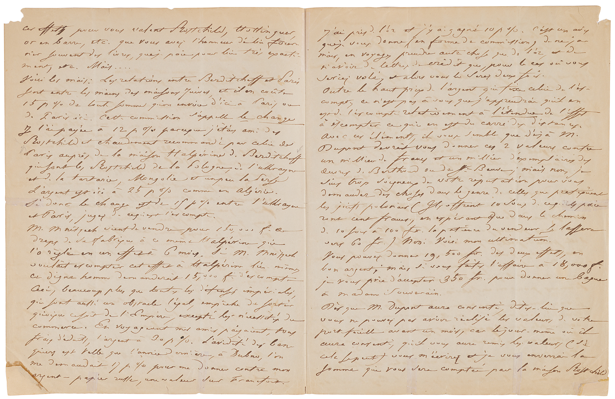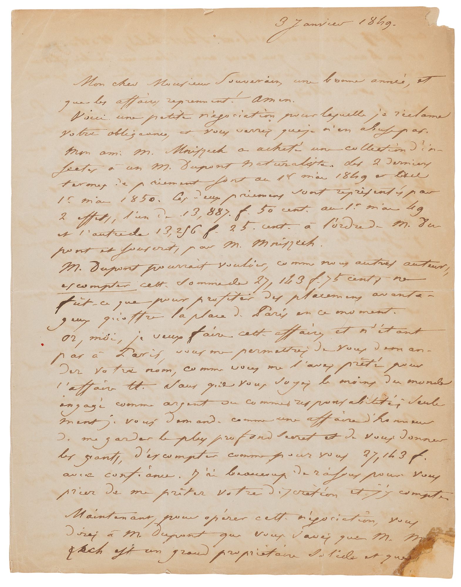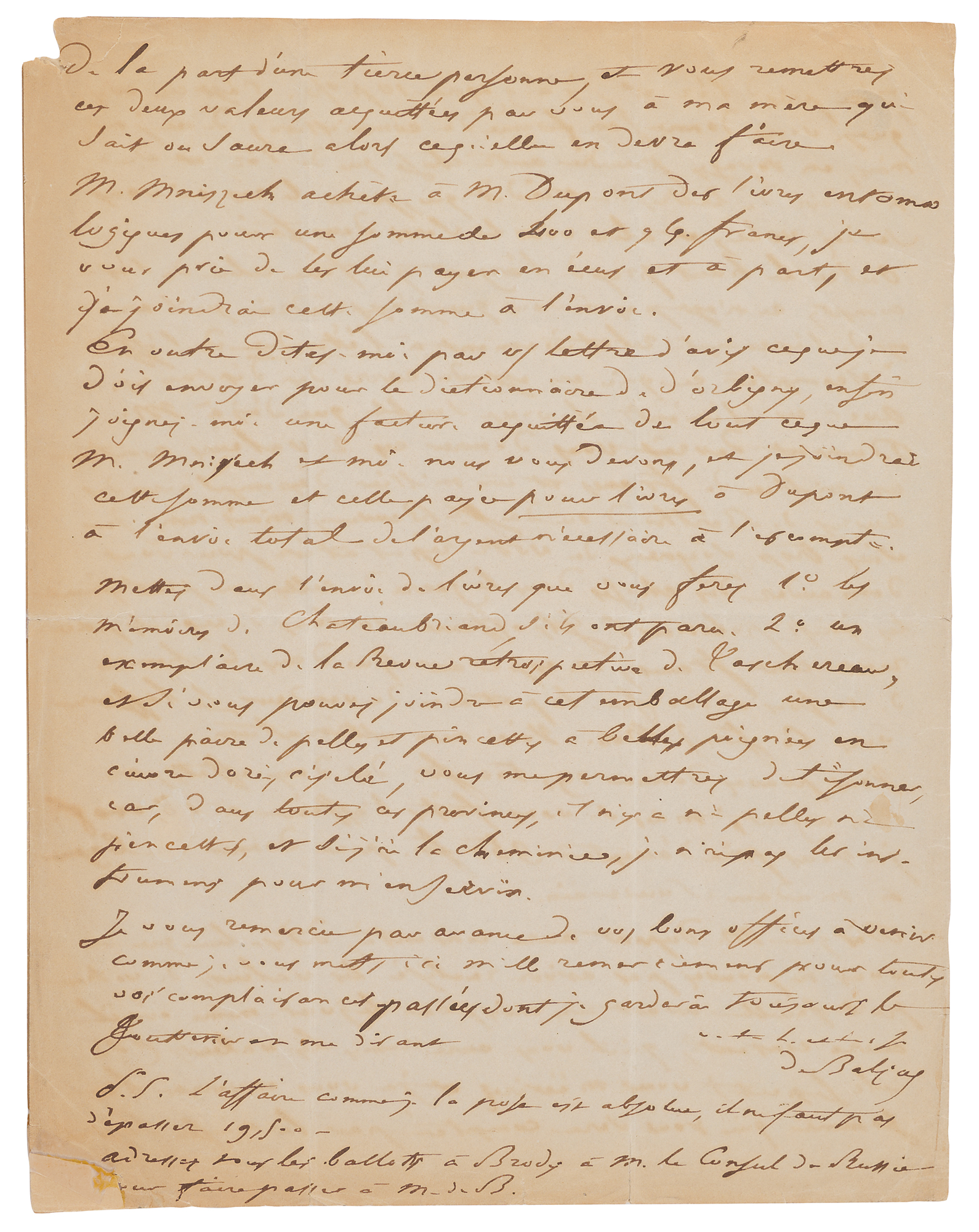Lengthy ALS in French, signed “de Balzac,” four pages on two adjoining sheets, 8.25 x 10.75, January 3, 1849. Untranslated handwritten letter from Honore de Balzac, addressed to his publisher, Hippolyte Souverain, from Berdychiv, a city in Ukraine, where, toward the end of his life, the novelist resided with his love, Ewelina Hanska, whom he married in 1850. In very good to fine condition, with edge toning, minor loss to the upper right corner, and repaired loss to the lower right corner.