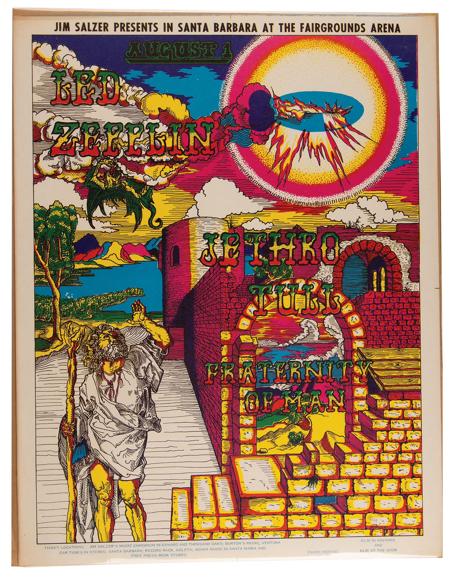 Original first printing color 17.5 x 22.5 concert poster for Led Zeppelin, Jethro Tull, and Fraternity of Man at the Santa Barbara Fairgrounds Arena on August 1, 1969, presented by Jim Salzer, featuring vividly colorful artwork by Frank Bettencourt. Notably, the headliner's name is misspelled "Zepplin." The lower border carries ticketing information and a "Pacific Printing" credit. In fine condition.