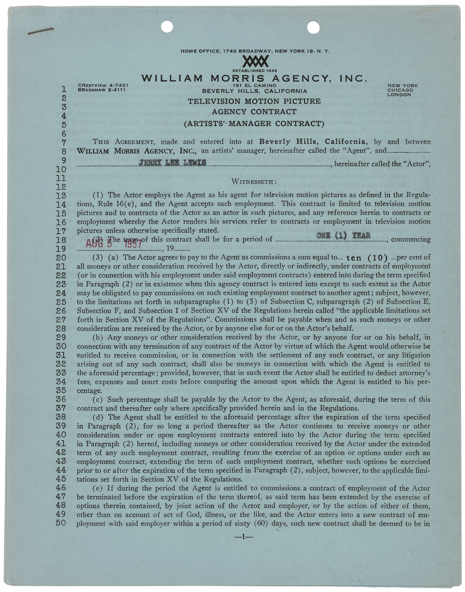 Partly-printed DS, three pages both sides, 8.5 x 11, August 5, 1957. Television motion picture agency contract between Jerry Lee Lewis and the William Morris Agency, by which the piano rocker agrees to engage "the Agent as his agent for television motion pictures…for a period of one (1) year." Signed at the conclusion in fountain pen by Jerry Lee Lewis, and countersigned by an agent. In fine condition.