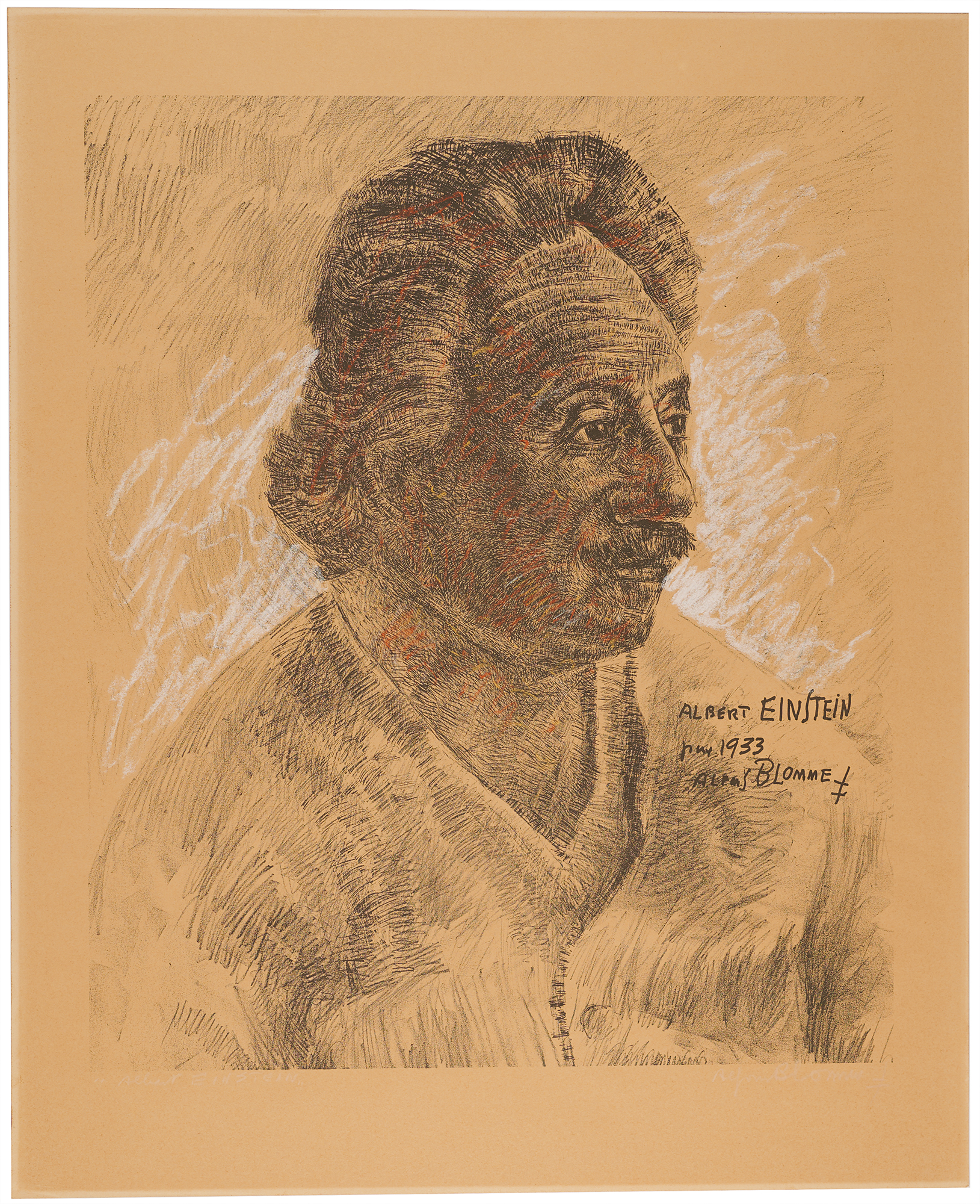 Outstanding 23 x 28 lithograph of Albert Einstein in a bust-length pose by Alfons Blomme, lightly titled and signed in the lower border in white pencil by the artist, "'Albert Einstein,' Alfons Blomme." The lithograph also carries a facsimile title and signature inherent to the print, by the subject's shoulder: "Albert Einstein…1933, Alfons Blomme." In fine condition.