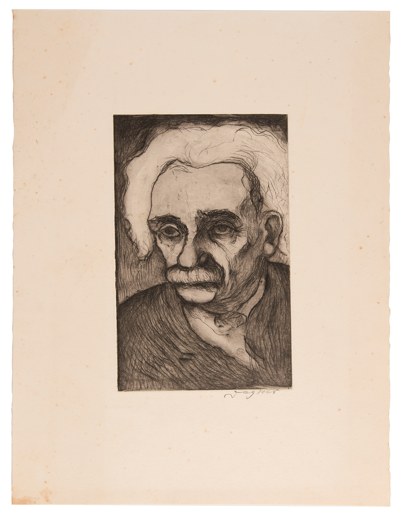 Striking 10.5 x 14 etching of Albert Einstein in later years by graphic artist Arthur Degner, signed in the wide lower margin in pencil by the artist, "Degner." In fine condition, with scattered light foxing in the borders.