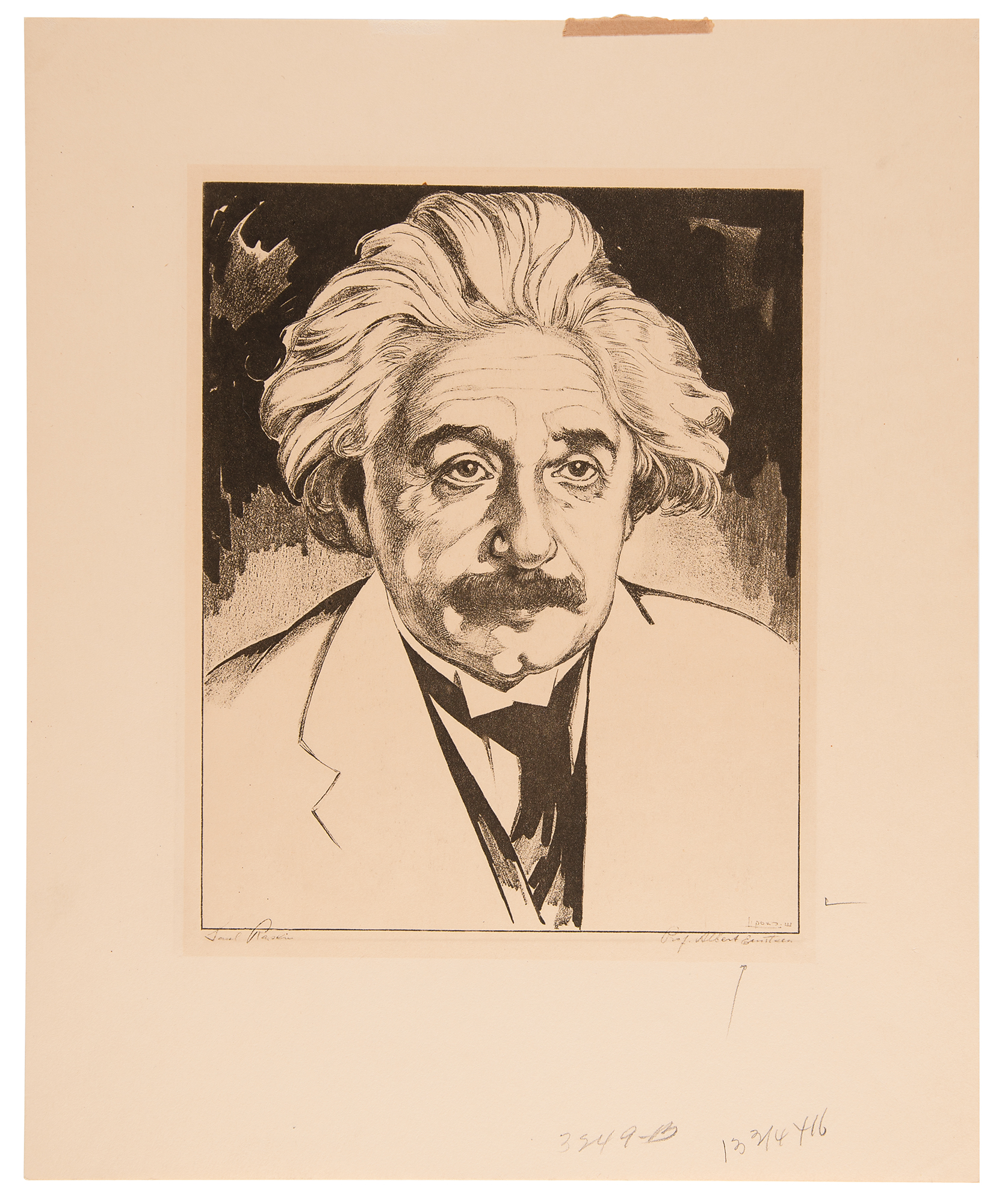 Attractive 11.5 x 14 lithograph of Albert Einstein in a formal, front-facing pose, created by artist Saul Raskin. The lithograph carries Raskin's facsimile signature inherent to the print. In fine condition, with a small piece of paper tape to the top edge.