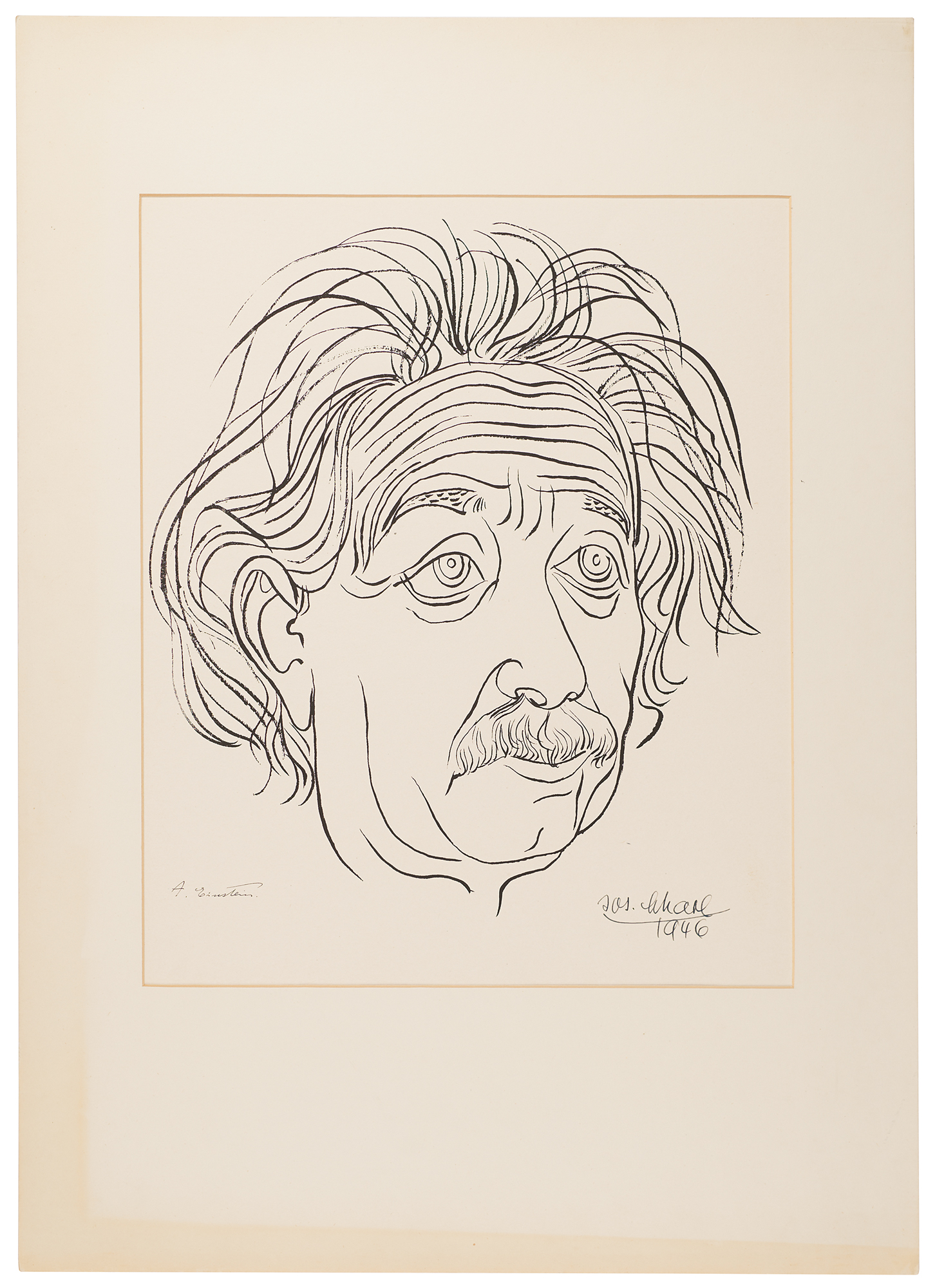 Amazing large-format 17 x 20 screen print of an expressive line drawing of Albert Einstein by German artist Josef Scharl, signed at the bottom in fountain pen by the subject, "A. Einstein," and artist, "Jos. Scharl, 1946." Matted and framed to an overall size of 19.75 x 27.5, with a mat opening of 14 x 17.5. In fine condition.