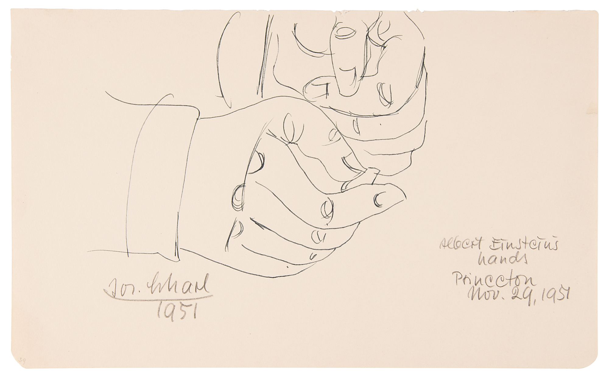 Outstanding original pen-and-ink drawing of Albert Einstein's hands, accomplished by artist Josef Scharl on an off-white 14 x 8.5 sheet, titled and signed at the bottom in pencil by the artist, "Albert Einstein's Hands, Princeton, Nov. 29, 1951, Jos. Scharl, 1951." In fine condition, with trivial chipping to the top edge. A unique perspective of the genius, executed by one of his dearest associates.