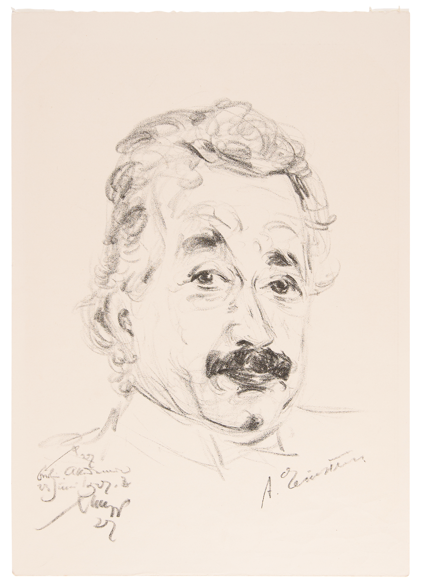 Distinguished 10.5 x 15 lithograph of Albert Einstein based on a drawing made by Emil Stumpp in 1927 during an official ceremony in Berlin, later featured on a 1979 GDR postage stamp honoring Einstein. The lithograph carries facsimile signatures of Einstein and Stumpp inherent to the print. In very fine condition.