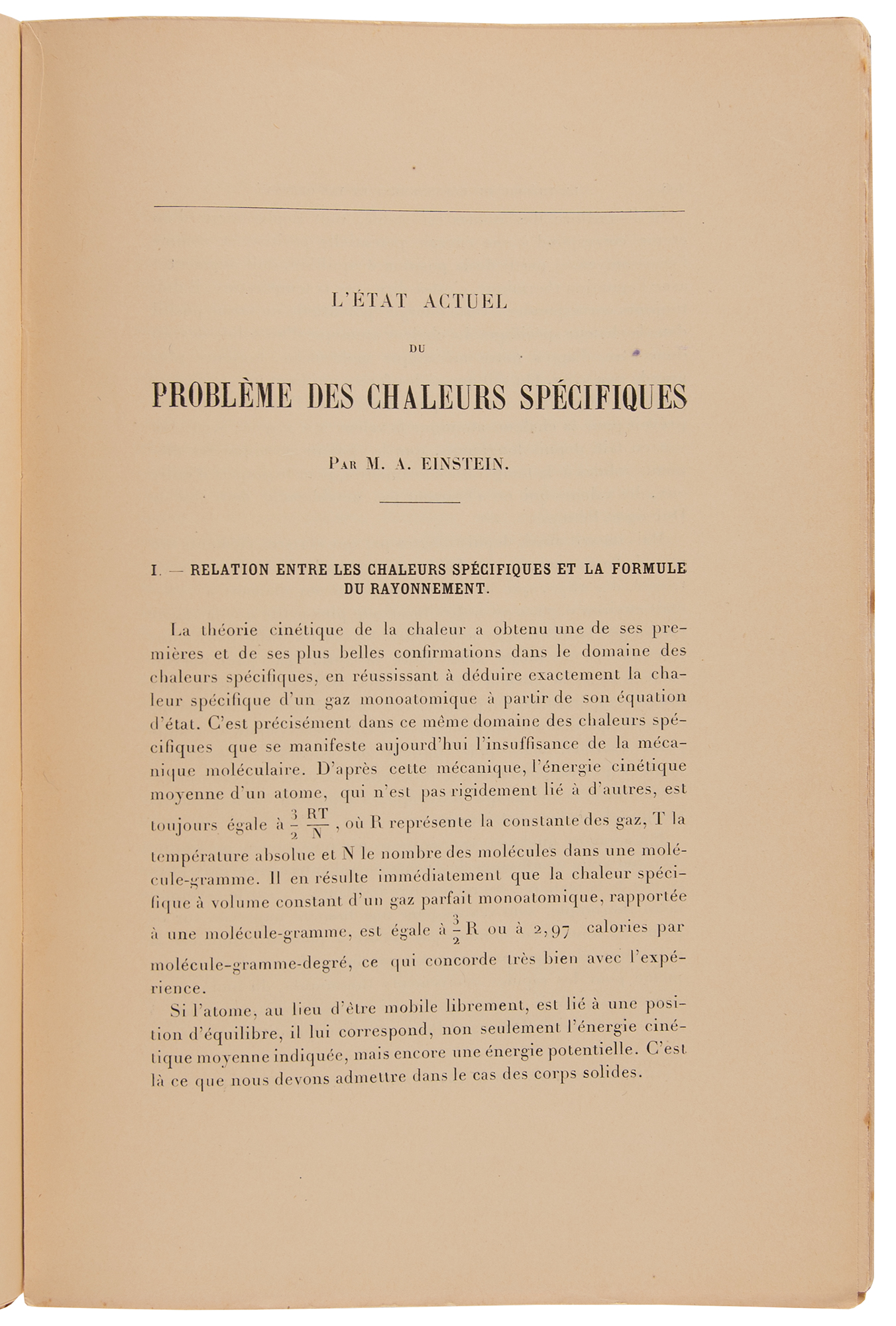 Rare first edition French-language report on the 1911 Solvay Conference: La Théorie du Rayonnement et les Quanta. Rapports et Discussions de la Reunion Tenue a Bruxelles du 30 Octobre au 3 Novembre 1911, Sous les Auspices de M. E. Solvay [The Theory of Radiation and Quanta: Reports and Discussions from the Meeting Held in Brussels from October 30 to November 3, 1911, Under the Auspices of Mr. E. Solvay]. Paris: Gauthier-Villars, Imprimeur-Libraire, 1912. Paperback, 6.5 x 10, 461 pages. Einstein's contribution comes on pages 407–435, "L'État Actuel du Probleme des Chaleurs Specifiques [The Current State of the Specific Heat Capacity Problem]." In good to very good condition, with the front wrapper detached, splitting and wear to the sunned spine, foxing to top textblock edge, and some creasing to the wrapper's corners.