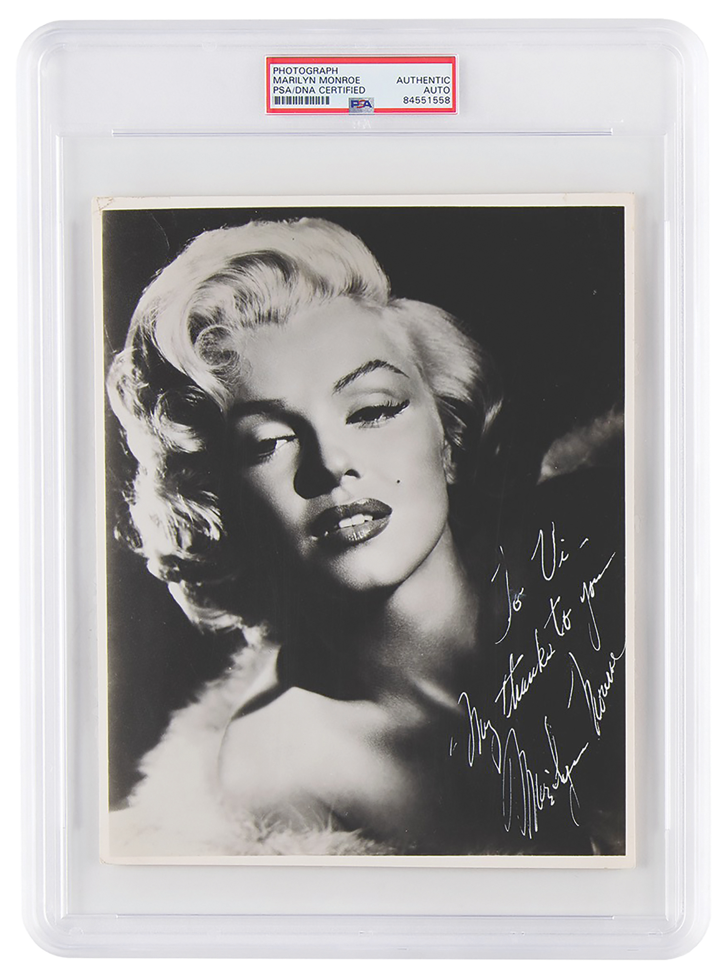 Beautiful vintage matte-finish 7.5 x 9.5 portrait of Monroe taken during a Frank Powolny glamour shoot in 1953, signed and inscribed in bright white fountain pen, “To Vi – My thanks to you, Marilyn Monroe.” In fine condition. Encapsulated in a PSA/DNA authentication holder. Monroe and Powolny most famously teamed up in 1953 for a series of stunning, artfully framed publicity stills for the 1953 film Gentlemen Prefer Blondes. Immortalized for his classic World War II pinup of Betty Grable, Powolny remained a trusted photographer for Monroe throughout her career, and is noted as taking the last known still photographs of the starlet during production of Something's Got to Give, one week before she died in 1962. A stunning image boasting an unusually bright signature.