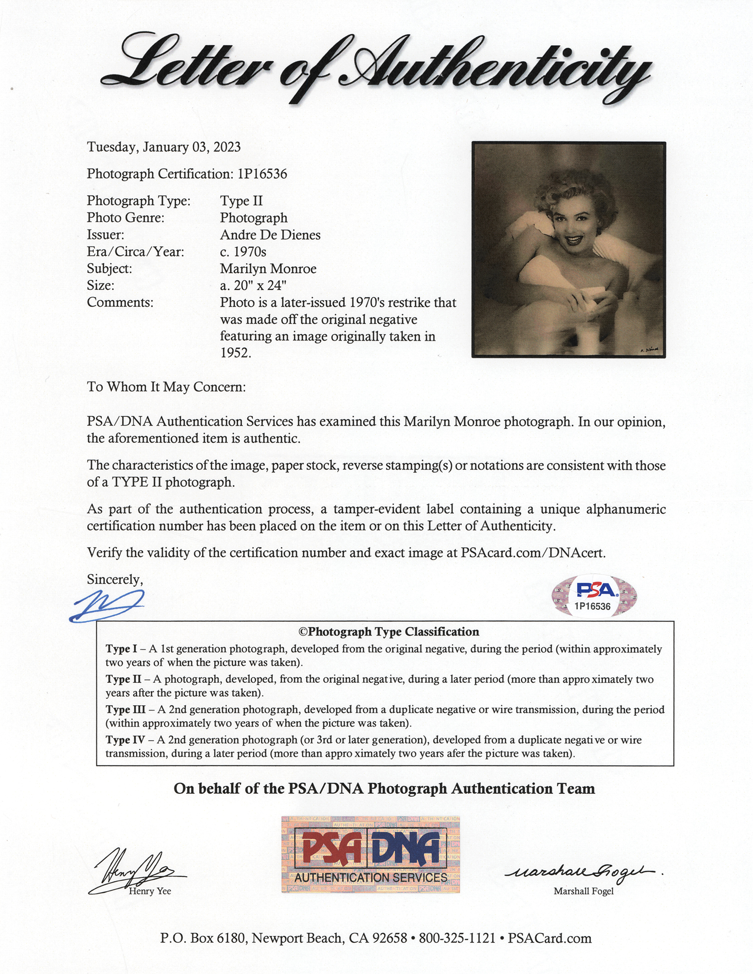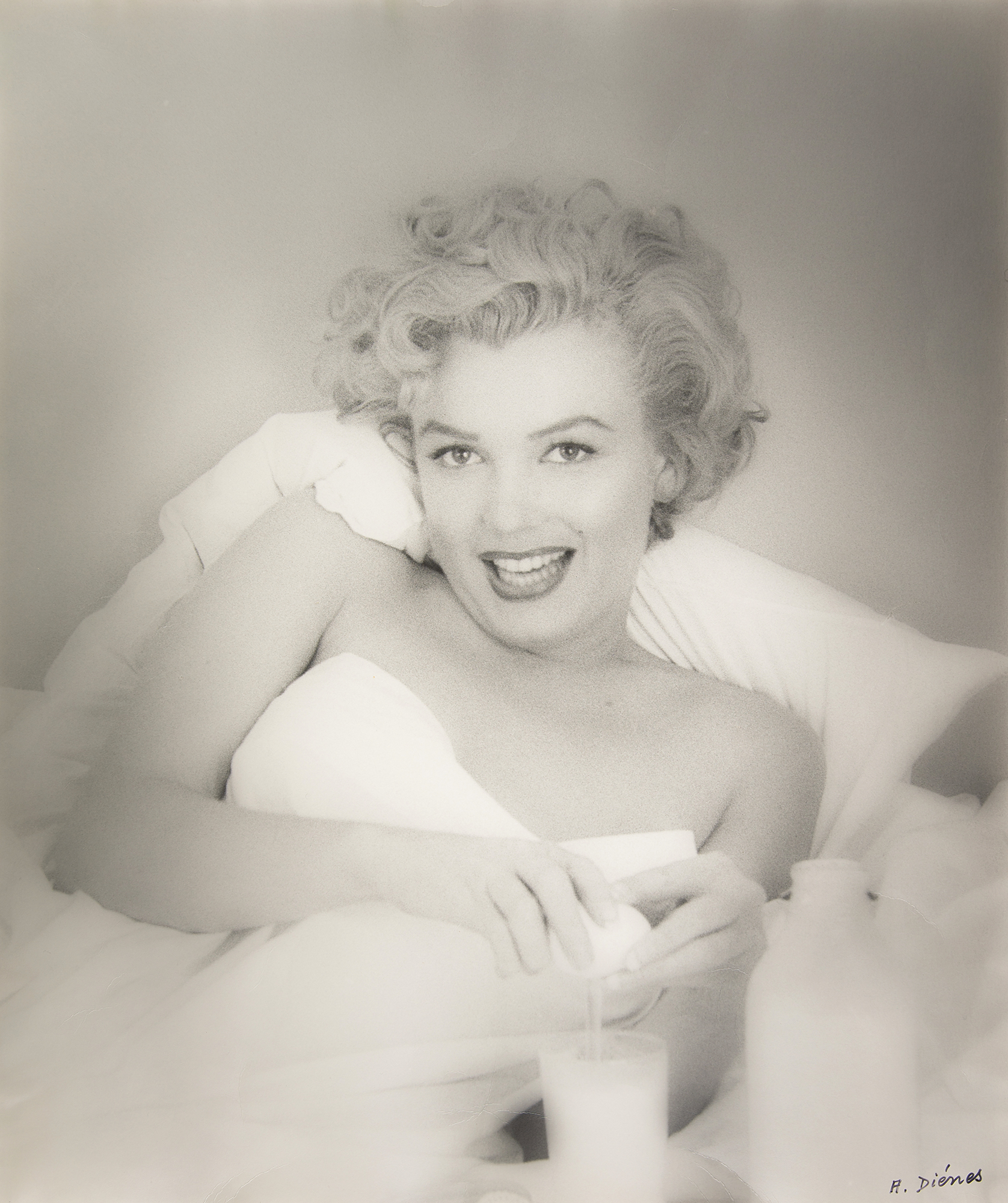Original vintage circa 1970s matte-finish 20 x 23.75 silver gelatin photograph of Marilyn Monroe lying in bed with an egg and a glass of milk, originally taken in 1952 by photographer Andre de Dienes and printed from the original negative during the 1970s. Reverse bears the credit stamp of Andre de Dienes, who has signed the front in black felt tip. In fine condition, with light edge rippling. Accompanied by a full letter of authenticity from PSA/DNA, certifying it as an authentic "Type II" photograph.