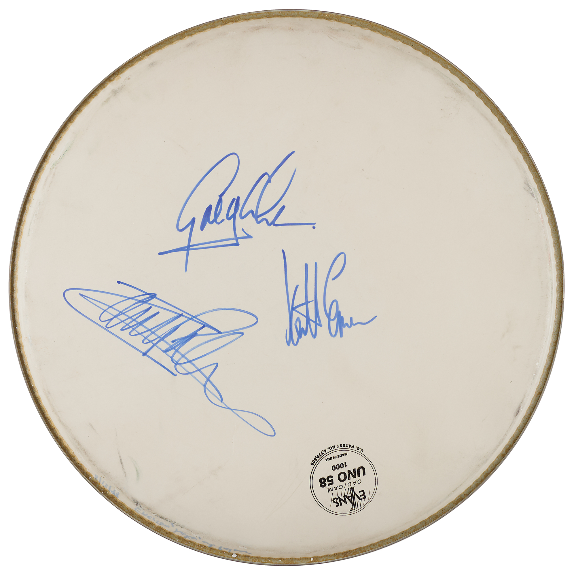 Evans CAD/CAM Uno 58 1000 off-white coated drum head, 16˝, signed in blue felt tip by Keith Emerson, Greg Lake, and Carl Palmer. In fine condition, with scattered light scuffing.