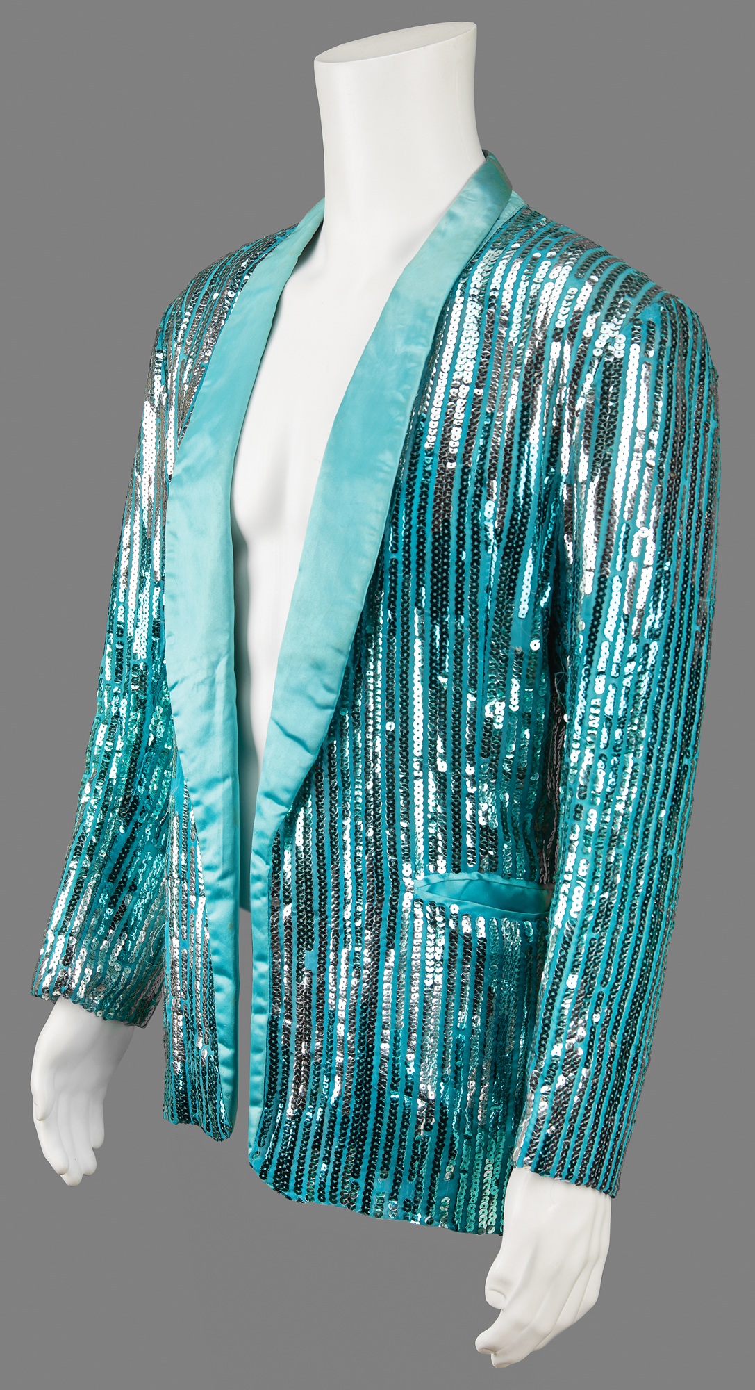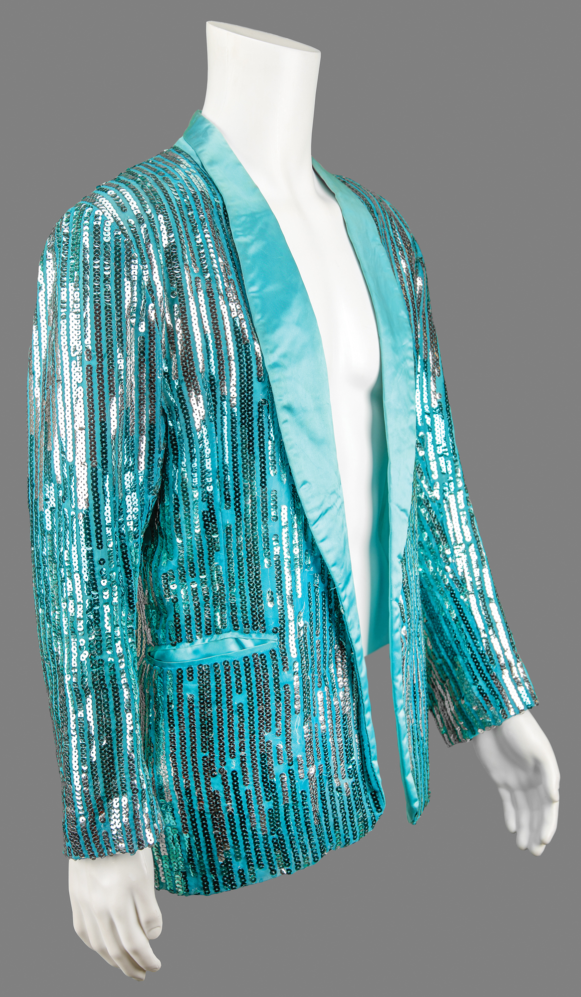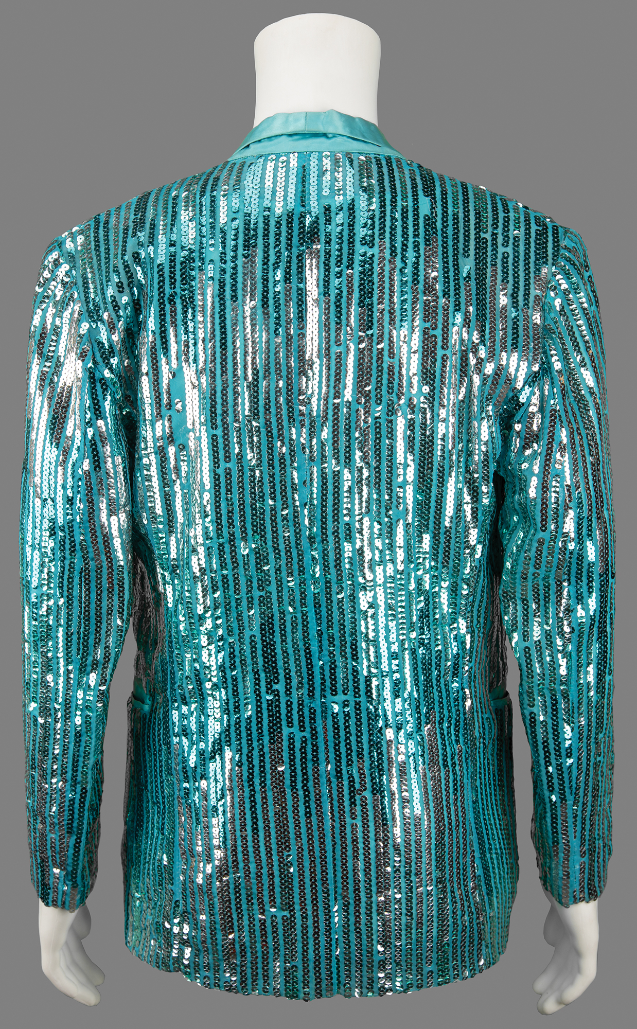 Dazzling sequined teal blazer worn by keyboardist Susie Davis when she appeared on stage with Prince at the Capital Centre in Landover, Maryland, on November 19, 1984, as part of the legendary Purple Rain Tour. The custom-made jacket, size small, features full-length lapels and vertical rows of sparkling light blue sequins. The inner collar retains its original Ellene Warren label. In fine condition, with a few light stains to the inner liner.
