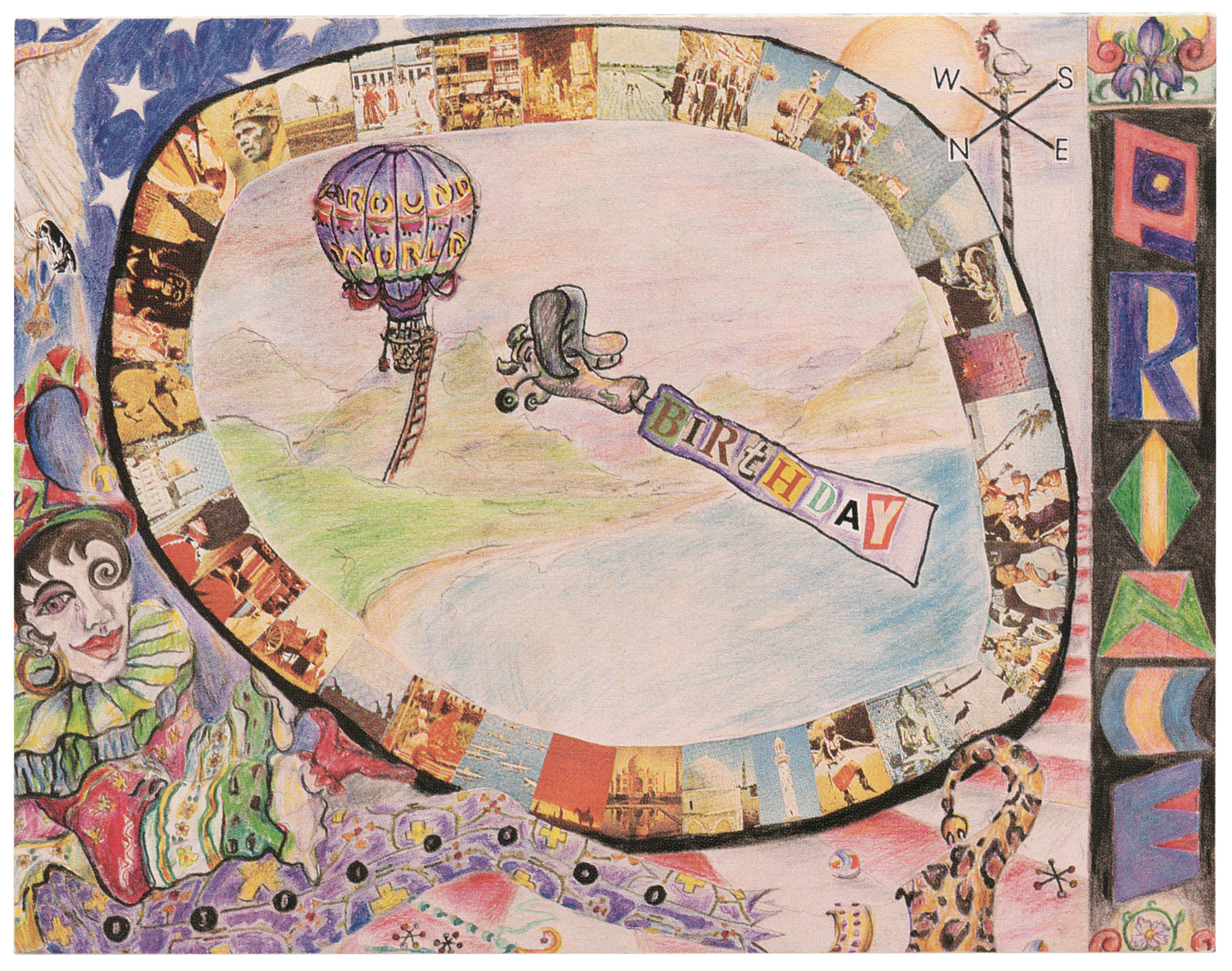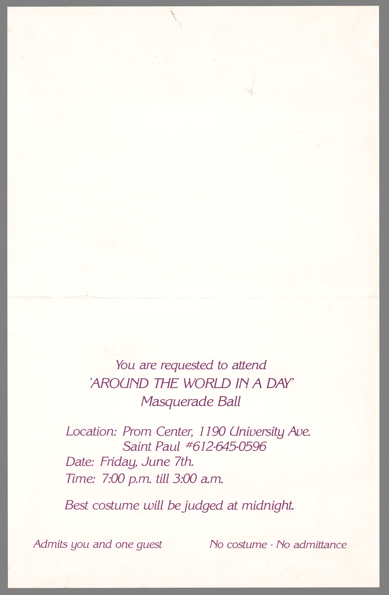 Sought-after invitation card for Prince's 27th birthday party at Prom Center in St. Paul, Minnesota, on June 7, 1985, measuring 5.5 x 4.5 closed, with printed purple text inside reading: “You are requested to attend, 'Around the World in a Day,' Masquerade Ball…Best costume will be judged at midnight. Admits you and one guest, No costume - No admittance.” In fine condition, with a horizontal bend, and some light stains to the back.