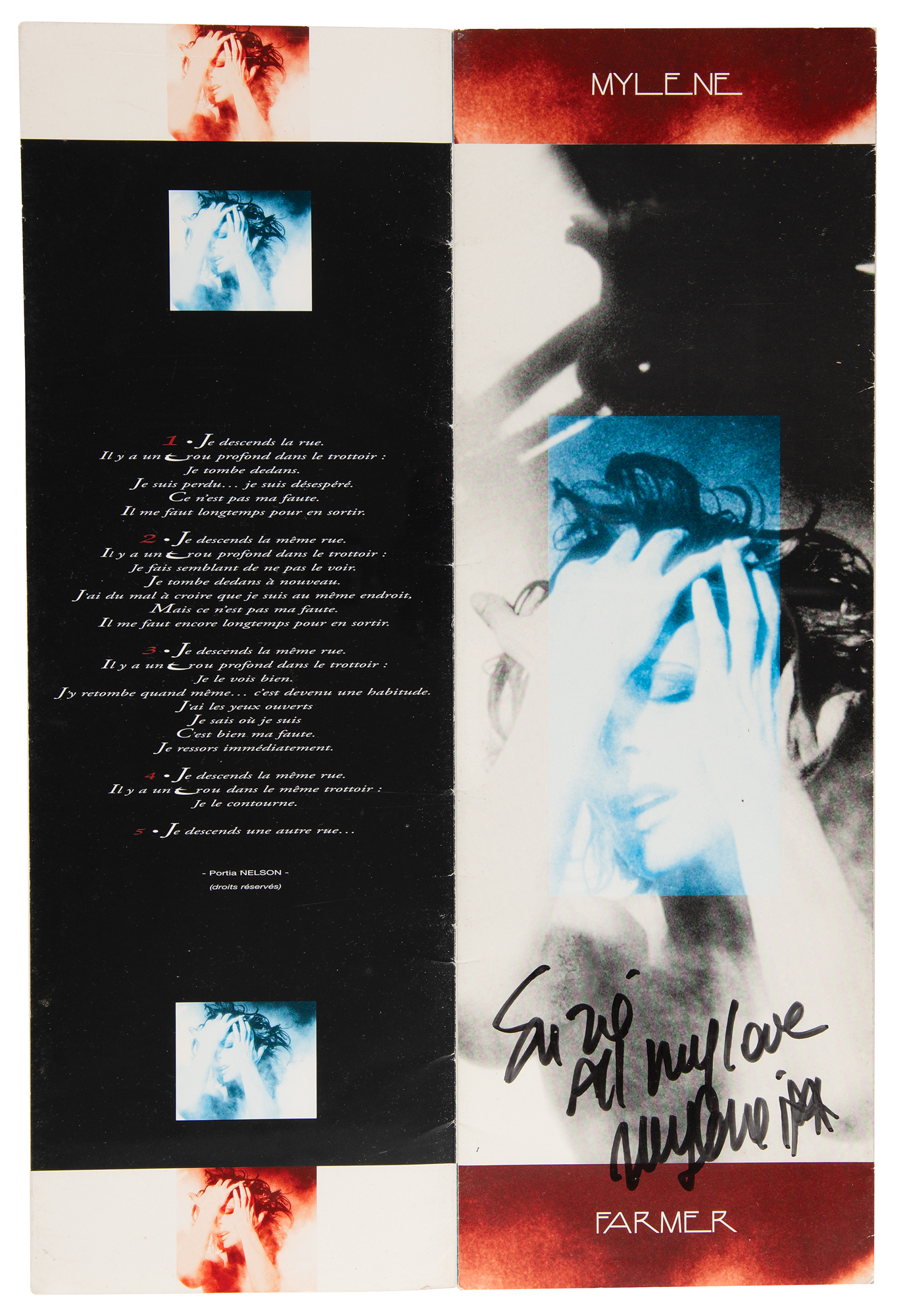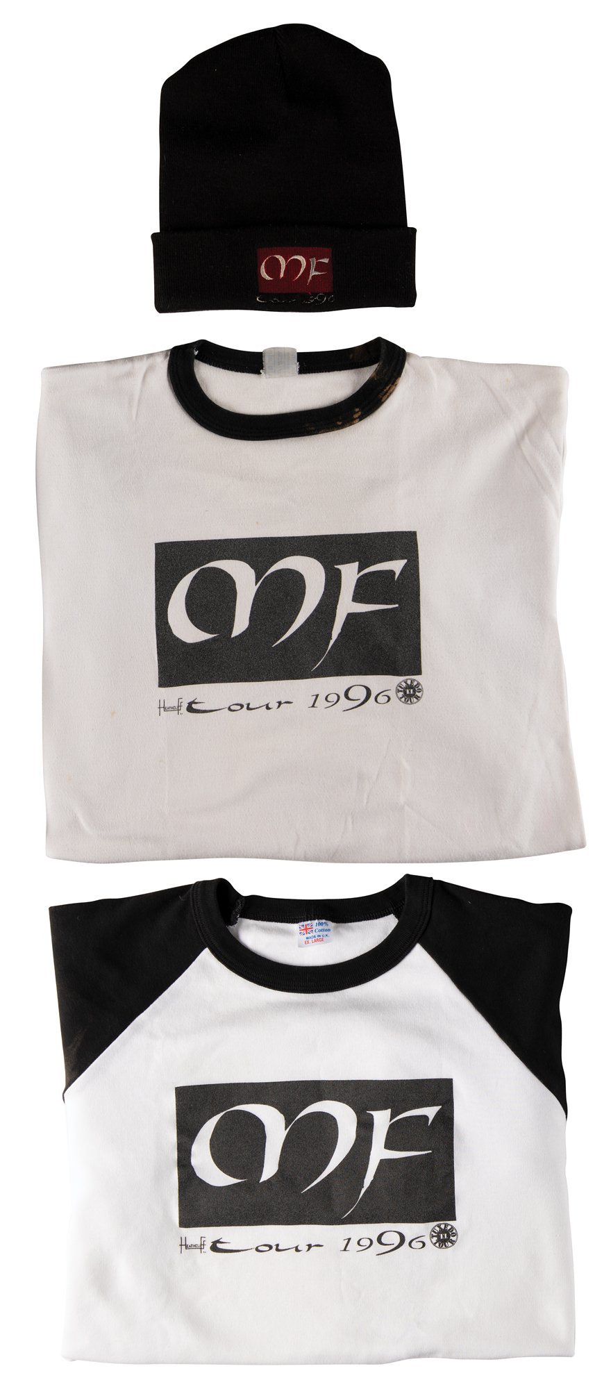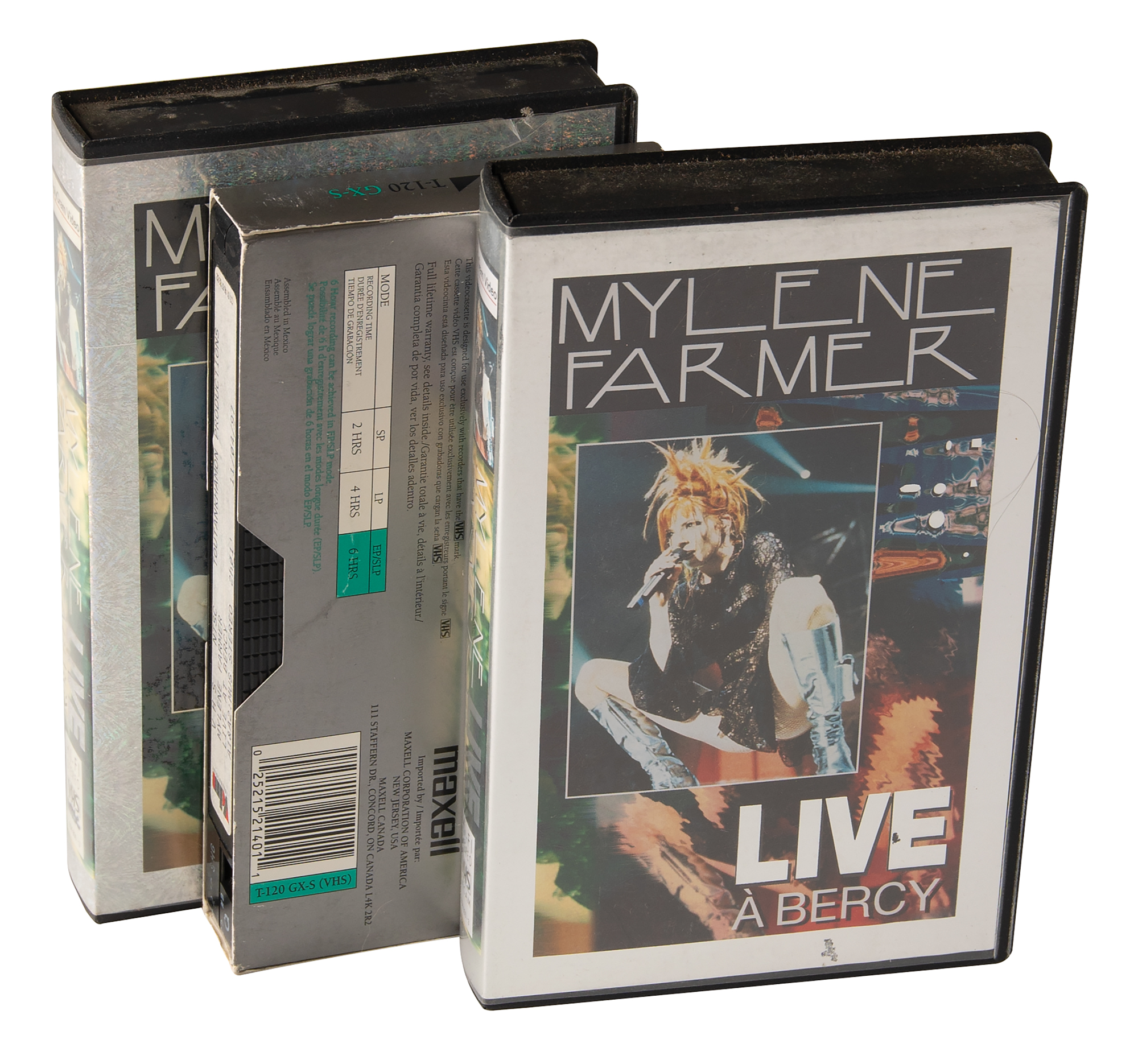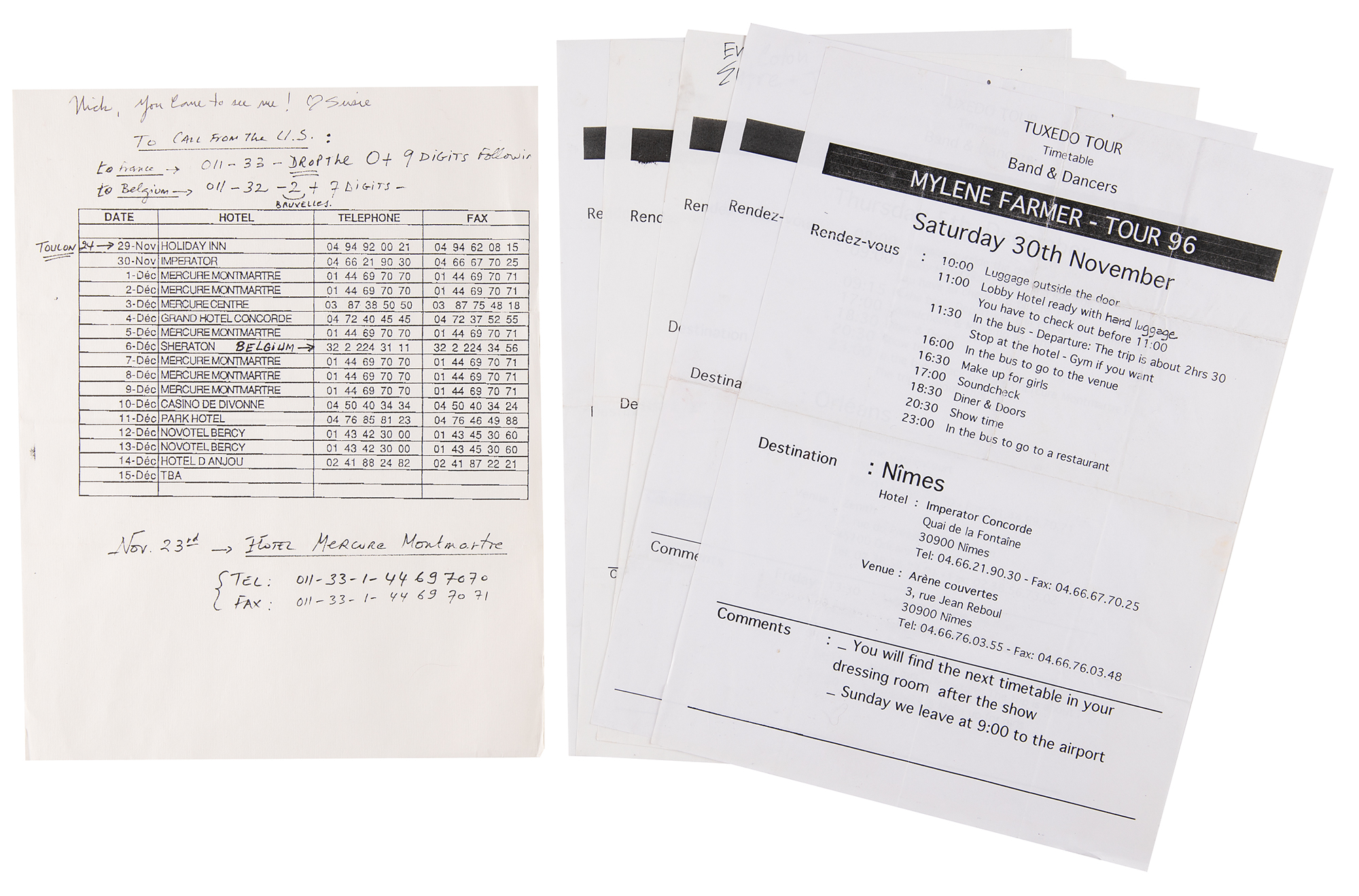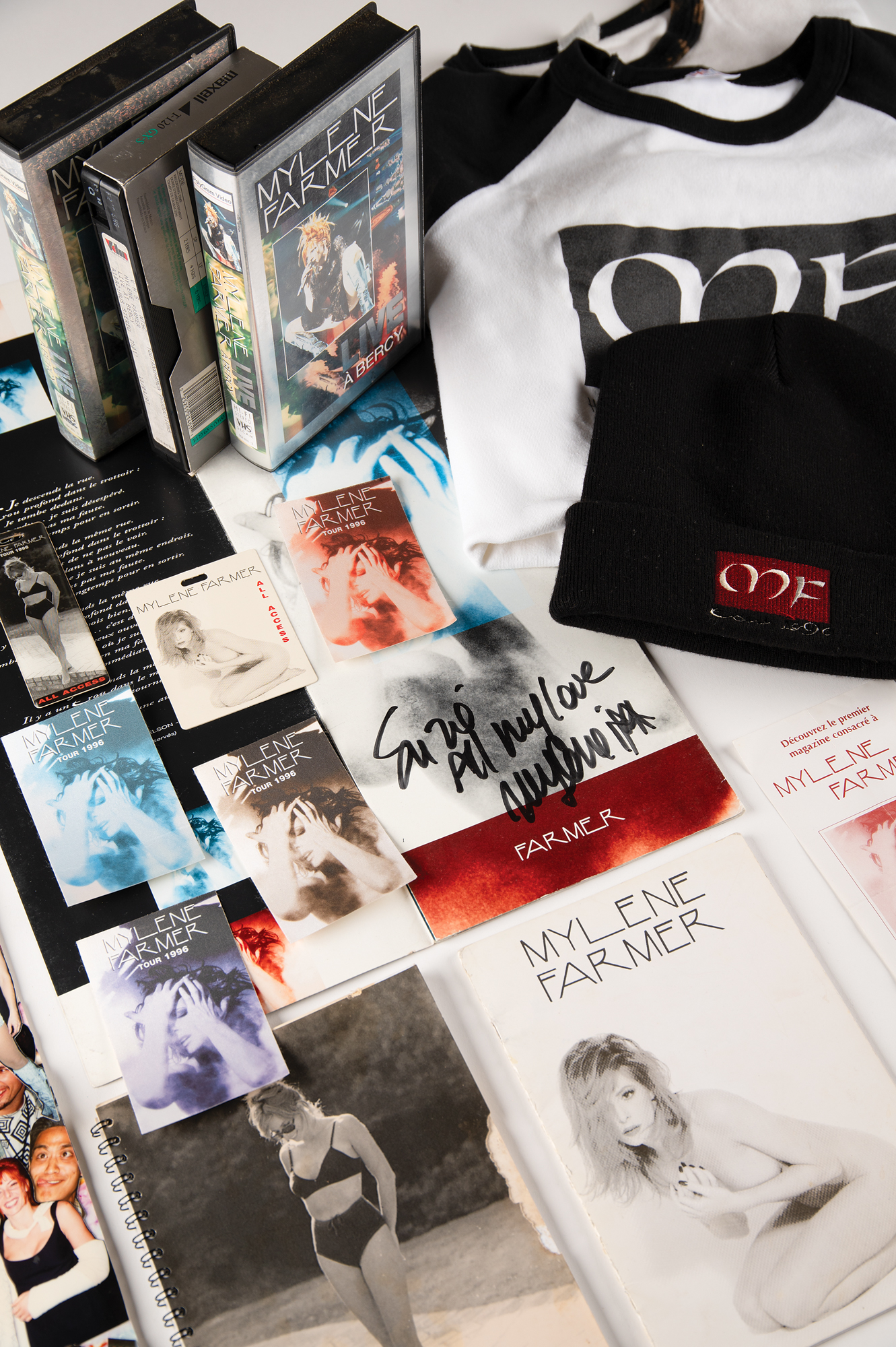Collection of in-house material for Mylène Farmer’s 1996 Tour of France, which includes over 20 pieces of tour ephemera, including backstage passes, itinerary booklets and travel sheets, three ‘Live a Bercy’ VHS cassette tapes, two tour shirts and a winter hat, a custom-made photo collage of Farmer and her tour mates, and a tour book that is signed and inscribed on the first page in black felt tip, “Suzie, All my love, Mylène.” In overall fine condition.