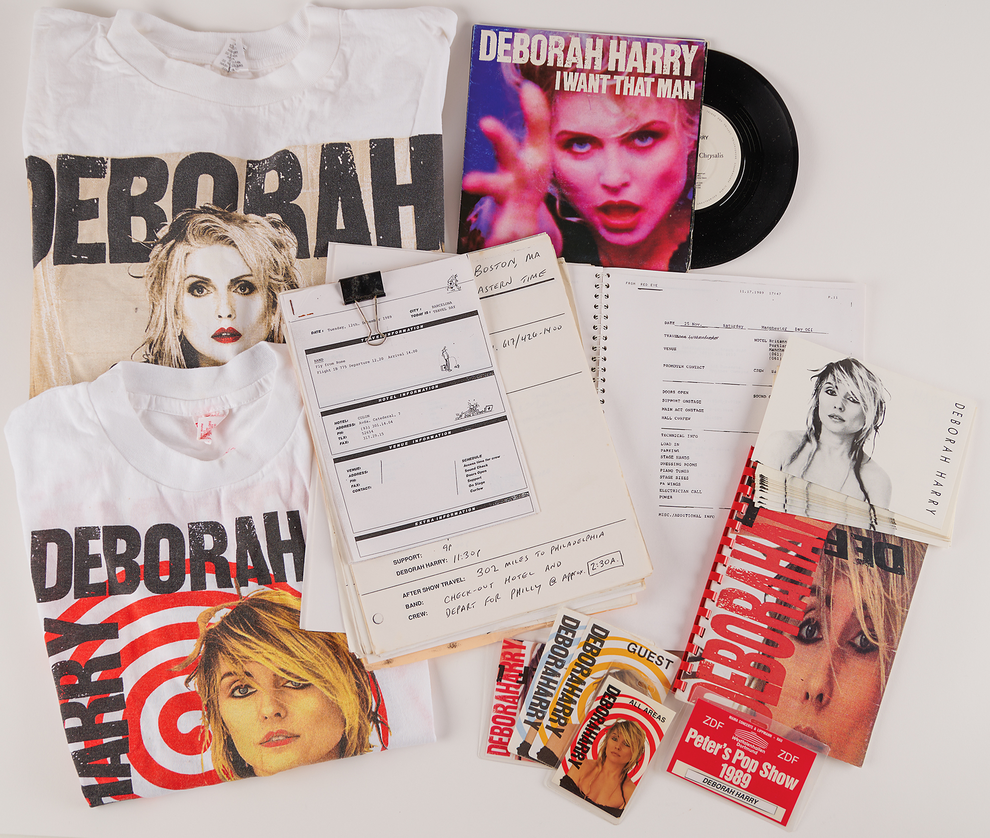 Collection of over 20 items from Debbie Harry’s 1989-1990 ‘Def, Dumb & Blonde Tour,’ which contains: a white t-shirt for Harry’s tour of North America (size large); four unused Deborah Harry ‘Guest’ backstage sticker passes; two laminated backstage ‘All Access’ passes; laminated ‘1989 Peter’s Pop Show’ backstage pass issued to “Deborah Harry”; 13 glossy promotional postcards from the tour’s Spanish leg; and a spiral-bound tour itinerary booklet for the 1989 European/UK Tour (November/December), which is accompanied by additional travel arrangement sheets and packets. In overall fine condition. Accompanied by a Chrysalis Records 45 RPM record for the single ‘I Want That Man / Bike Boy,’ and a large white Debbie Harry t-shirt.